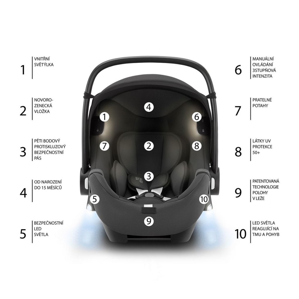 Baby Safe iSense vybavena soustavou inteligentních led světýlek. Dvojice tohoto bezpečnostního a instalačního osvětlení se automaticky aktivuje, pokud se s přenosnou dětskou sedačkou pohybujete v tmavém prostředí. Na procházce, na výletě či na parkovišti se díky němu můžete i navečer, v šeru a ve tmě přemisťovat bez obav. Funguje to tak, že po vyjmutí sedačky ze základny se spodní dvojice světýlek automaticky rozsvítí a zůstává rozsvícena i po nacvaknutí na podvozek kočárku. To vám zajistí, že už z dálky budete dobře vidět a také uvidíte na cestu. Až se s vajíčkem dostane na osvětlené místo, světýlka na sedačce automaticky zhasnou. Slouží to i jako spolehlivý indikátor bezpečného připevnění vajíčka do základny, protože v ten moment světýlka automaticky zhasnou. Výrazné led osvětlení vás navíc nebude rušit při řízení. Pak je tady další dvojice světýlek, která má jinou funkci. Teplá, tlumená světýlka uvnitř sedačky můžete zapnout nejen, když si chce dítko hrát, ale také vám zajistí, že vždy budete vidět, co vaše miminko zrovna dělá. Světýlka vám v šeru auta pomohou i se snadnějším připoutáním dítěte. Mají nastavitelný automat, kdy se světýlka rozsvítí, vy dítě do sedačky připoutáte a světla po minutě sama zhasnou. Horní i spodní osvětlení se dá ovládat také manuálně, a to z jakékoli strany. Světýlka můžete dlouhým stiskem vypínat, zapínat a ve 3 stupních nastavovat jejich intenzitu. U horních světýlek je to od nejtlumenějšího po nejvýraznější svícení. U spodních světel naopak. Součástí balení je i 2metrový USB kabel, kterým se světýlka nabíjejí zhruba 4 hodiny. Nabité pak při plném svícení vydrží cca 18 hodin.