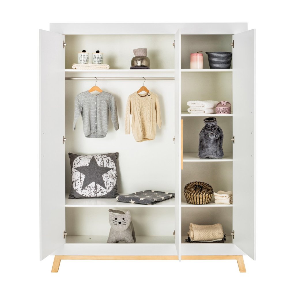 Skříň se systémem soft-close je vyrobena z dřevotřísky, nohy skříně jsou z masivního buku a uvnitř skříně naleznete 2 dlouhé a 4 krátké police a 1 šatní tyč. Skříň má madla vyrobená z masivního buku.