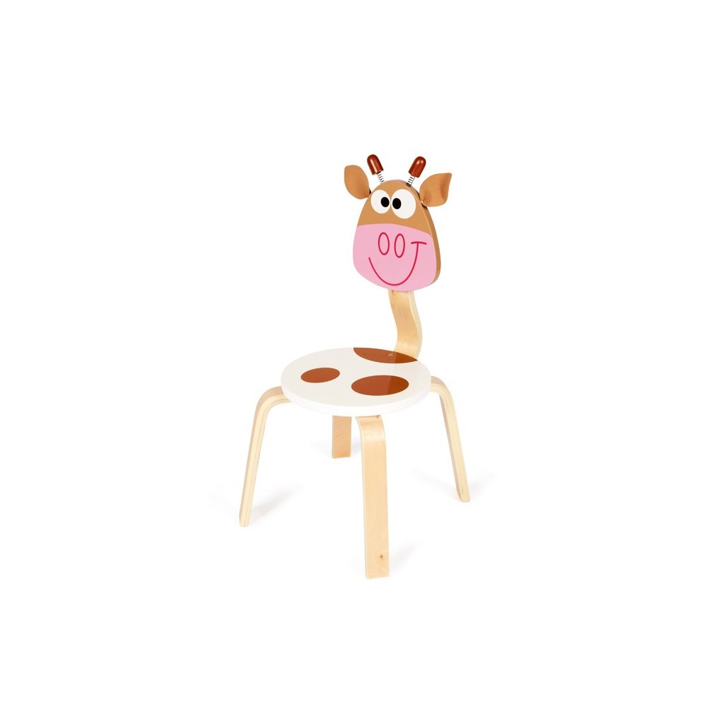 Dětská židle vyrobena ze dřeva s vtipným opěradlem ve tvaru kravičky s hýbajícími oušky je veselým kouskem nábytku do dětského pokoje Vašeho dítěte. Dobře vypadá v kombinaci s dětským stolem stejného desingu kravička. Židlička má tolik potřebnou zvýšenou stabilitu, kterou zaručují lehce vykloněné nohy. Vhodná pro děti od 3 let a do 50 kg.