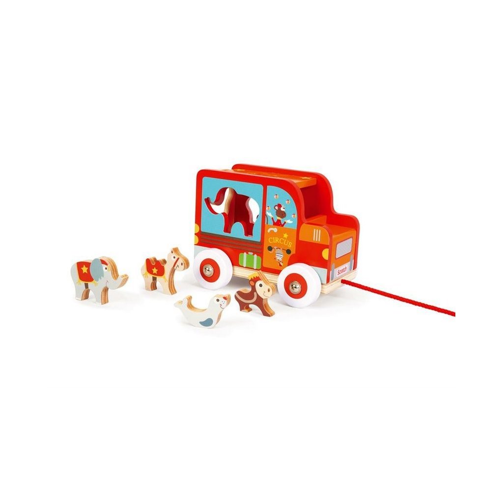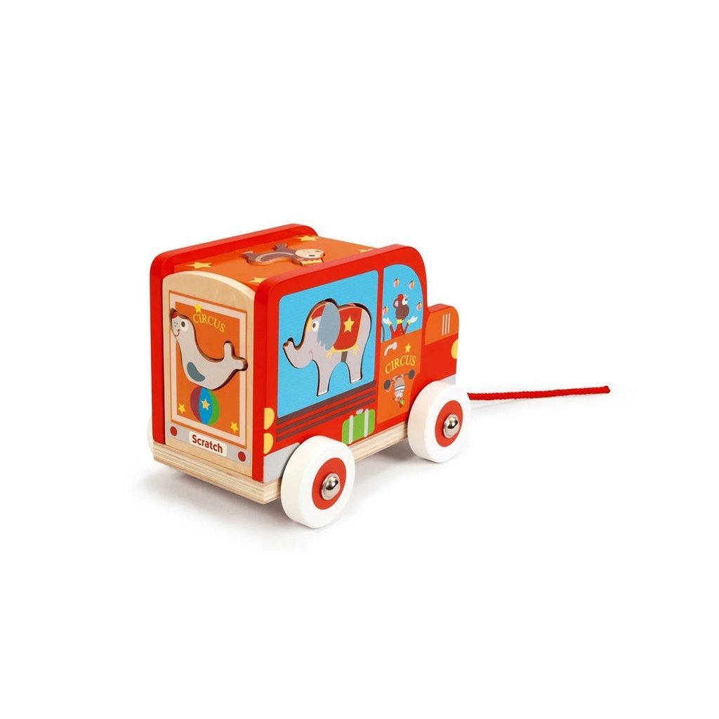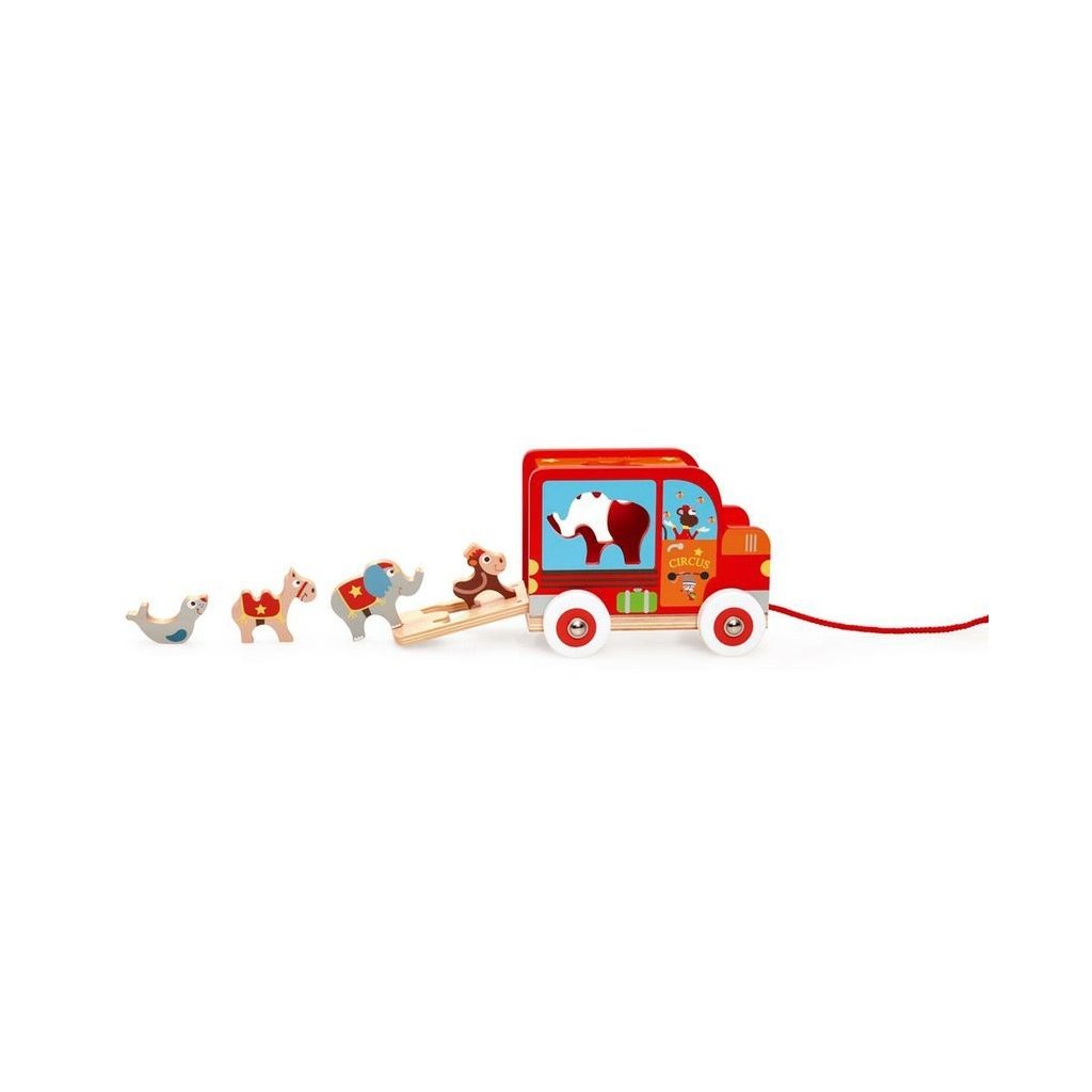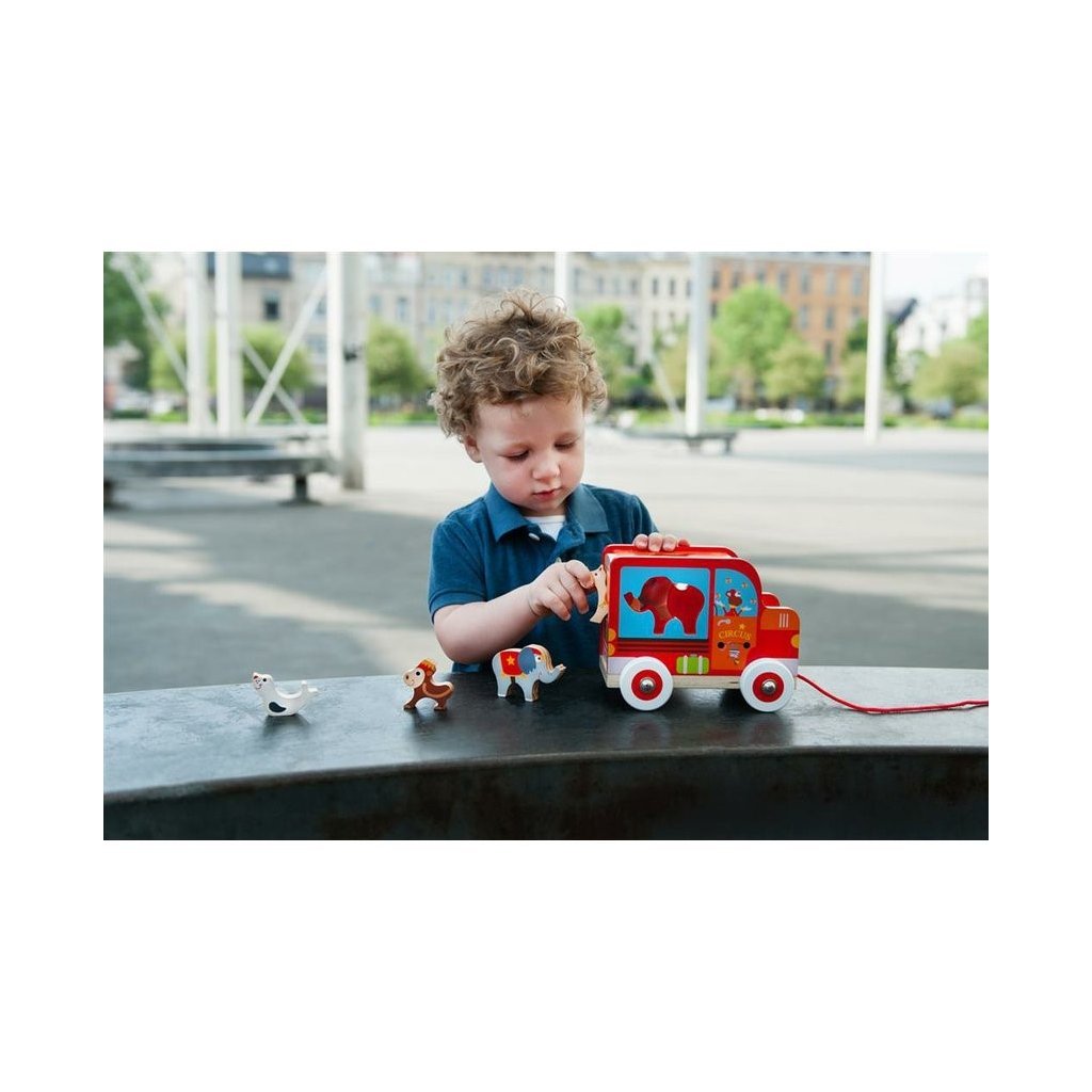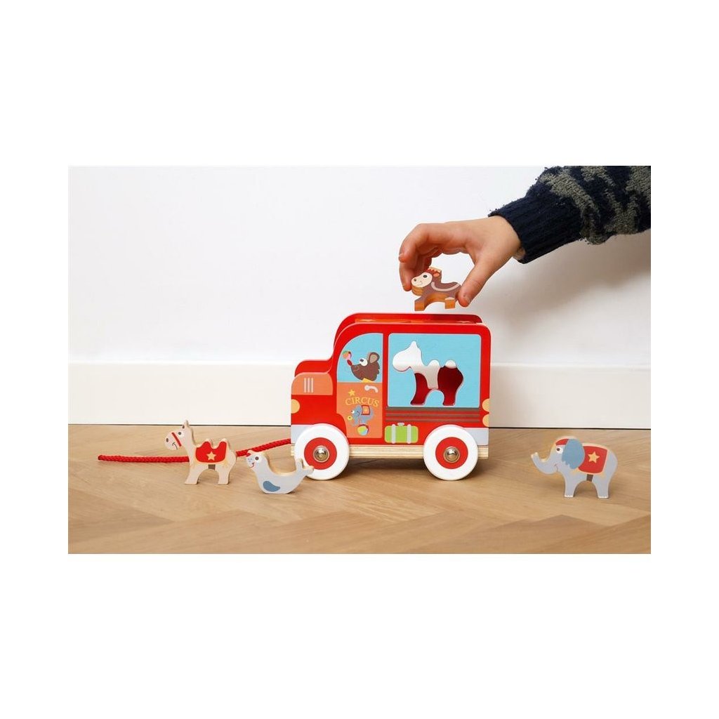 Dřevěný náklaďák se zvířátky slouží jako tahací i vkládací hračka. Aby mohl náklaďák včas dovézt zvířátka do cirkusu, musí děti vložit zvířátka do správného otvoru. Když jsou všechna zvířata naložená, děti mohou zavřít zadní magnetická dvířka, vzít auto za provázek a vydat se vstříc novým dobrodružstvím. Hračka podporuje rozvoj jemné motoriky a poznávání barev a zvířat.