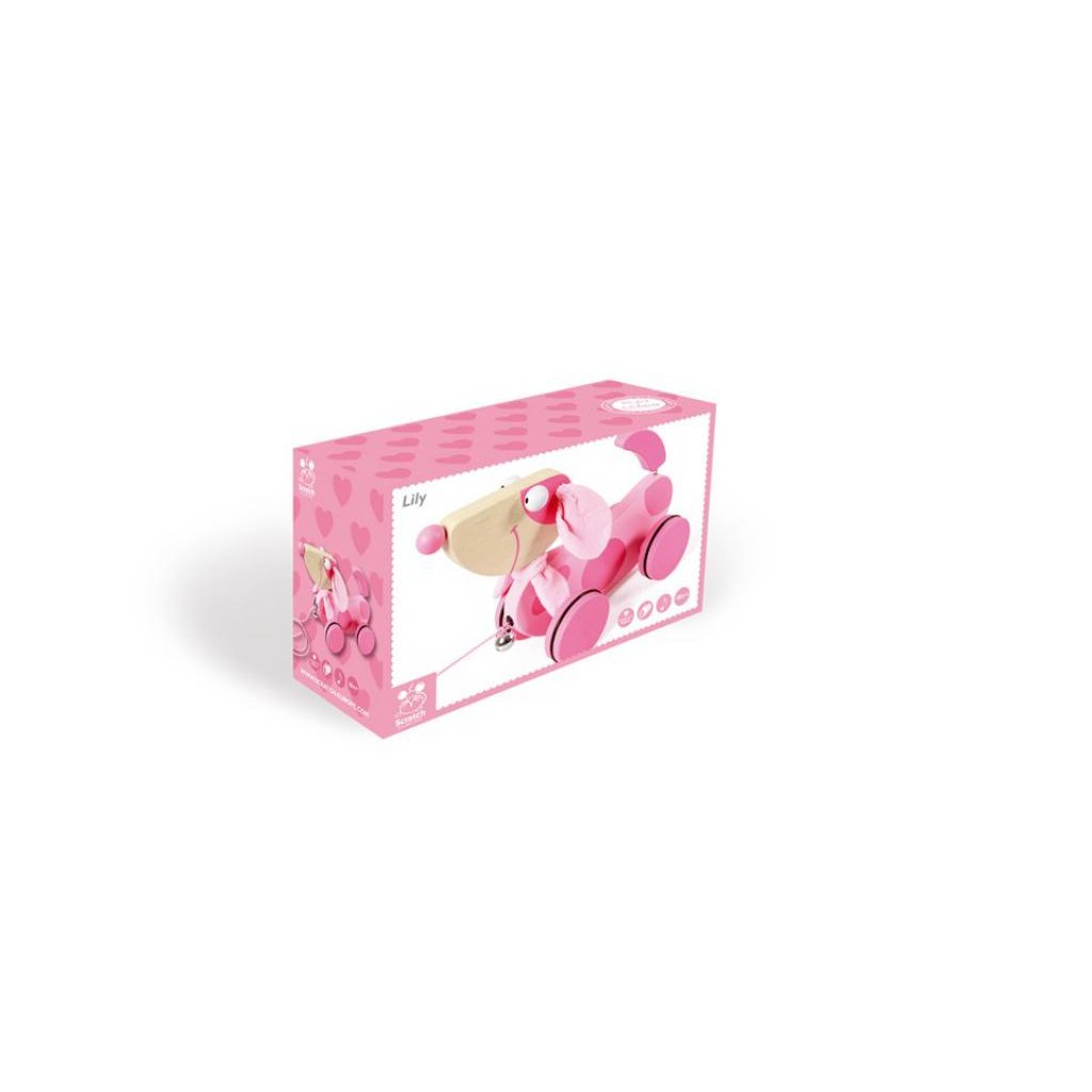 Velký dřevěný tahací pejsek Lily nosí svou oblíbenou kostičku stále sebou připnutou na krku. Kdykoliv jí děti táhnou za provázek zvoní svou rolničkou, vrtí ocáskem a hlavičkou. Má jemná látková ouška, která se dají vyjmout a vyprat. Rodiče potěší, že má tahací hračka mezi kolečky vloženou gumovou vložku. Vhodné pro pejskaře od 18 měsíců.