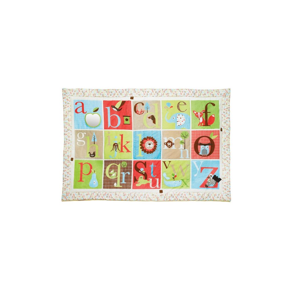 Tato měkoučká deka ze 100% bavlny nejen, že Vašemu dítěti dopřeje pohodlí při hraní, ale také ho zabaví. Je na ní vyobrazeno mnoho veselých a barevných motivů, které jsou obohaceny aktivními částmi. Jako je například jablíčko s dětským zrcátkem, slon se šustivýma odklápěcíma ušima, plyšová velryba či zebra s hřívou. Tyto různé textury rozvíjejí jemnou motoriku dítěte a pomáhají mu poznávat nové materiály. Díky vyobrazeným písmenkám, bude tato hrací deka Vaše dítě bavit i v pozdějším věku. Lze ji zavěsit na zeď. Díky všitým poutkům ji můžete složenou snadno přenášet.
