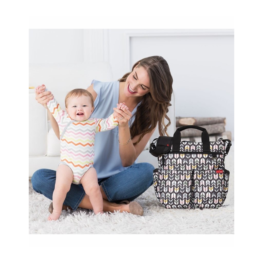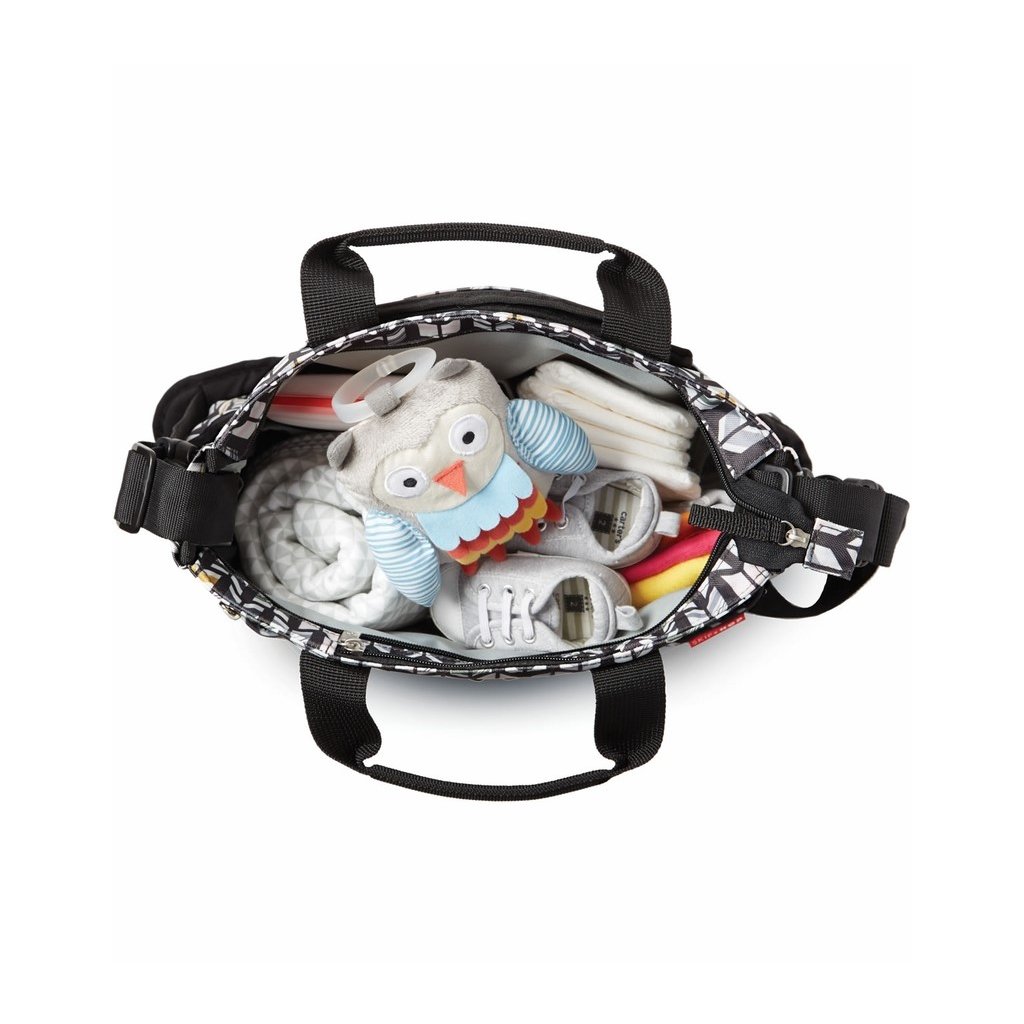 Tato prostorná přebalovací taška vám nabízí 10 kapes, do kterých přehledně urovnáte vše, co dítě a rodič potřebují. Taška má také dvě boční síťované kapsy na láhev a dvě přední kapsy na drobnosti se snadným přístupem. Hlavní a přední kapsa se zavírají na zip. Součástí je i přebalovací podložka. Tašku můžete pohodlně zavěsit na kočárek, nosit ji na rameni či v ruce. Obsahuje patentované Shuttle Clips, díky nimž lze ramenní popruh libovolně odepínat či připínat. Ramenní popruh je vybaven polstrováním pro vyšší komfort při nošení. Do tašky se také pohodlně vejde tablet či laptop s rozměrem do 15 palců.