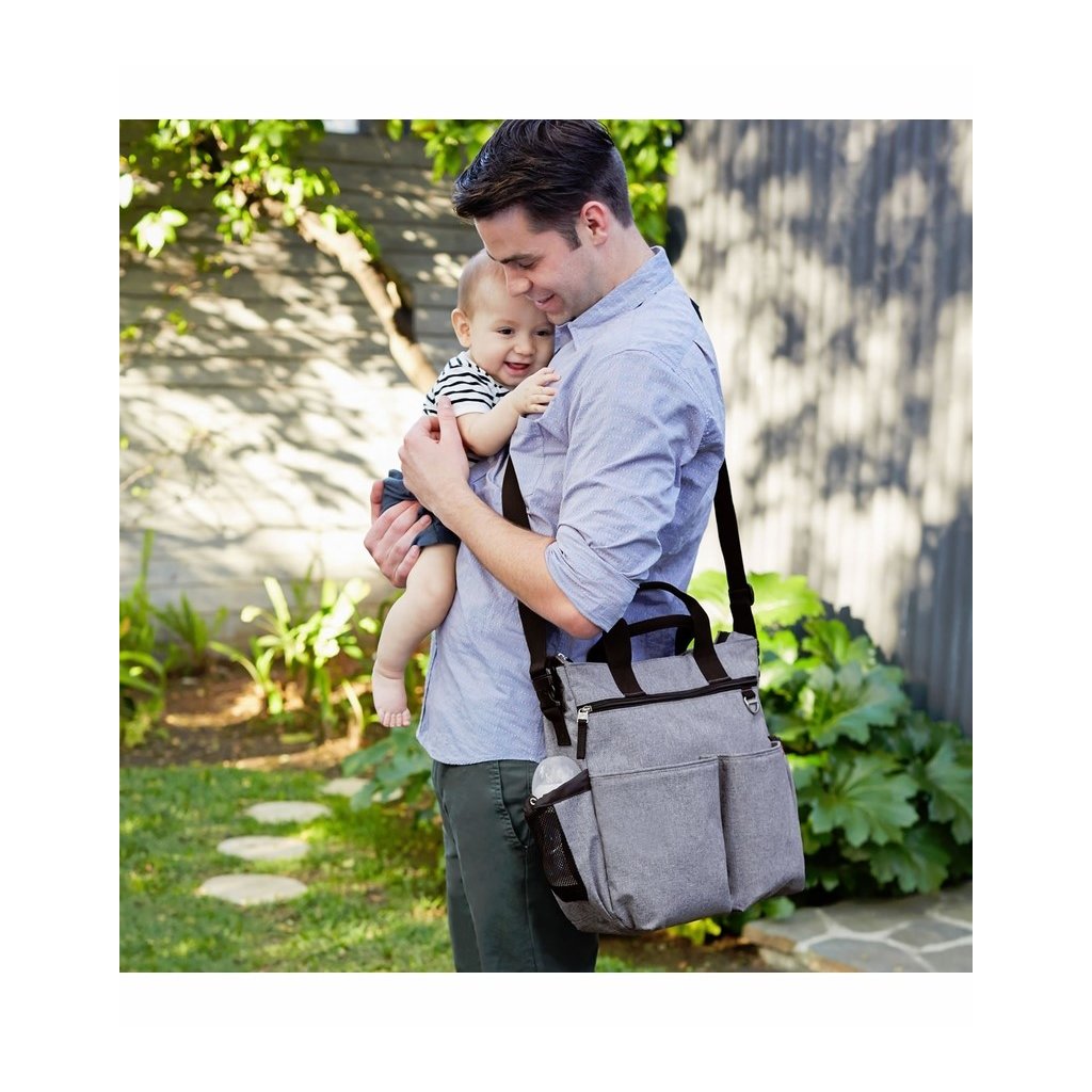 Tato prostorná přebalovací taška vám nabízí 10 kapes, do kterých přehledně urovnáte vše, co dítě a rodič potřebují. Taška má také dvě boční síťované kapsy na láhev a dvě přední kapsy na drobnosti se snadným přístupem. Hlavní a přední kapsa se zavírají na zip. Součástí je i přebalovací podložka. Tašku můžete pohodlně zavěsit na kočárek, nosit ji na rameni či v ruce. Obsahuje patentované Shuttle Clips, díky nimž lze ramenní popruh libovolně odepínat či připínat. Ramenní popruh je vybaven polstrováním pro vyšší komfort při nošení. Do tašky se také pohodlně vejde tablet či laptop s rozměrem do 15 palců.