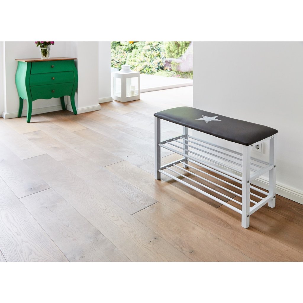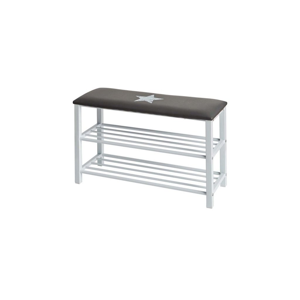 Stylová lavice s botníkem německé značky STORE IT nabízí dvě police pro odložení bot a měkce polstrovaný sedák z eko kůže s motivem hvězdy ve vintage stylu.