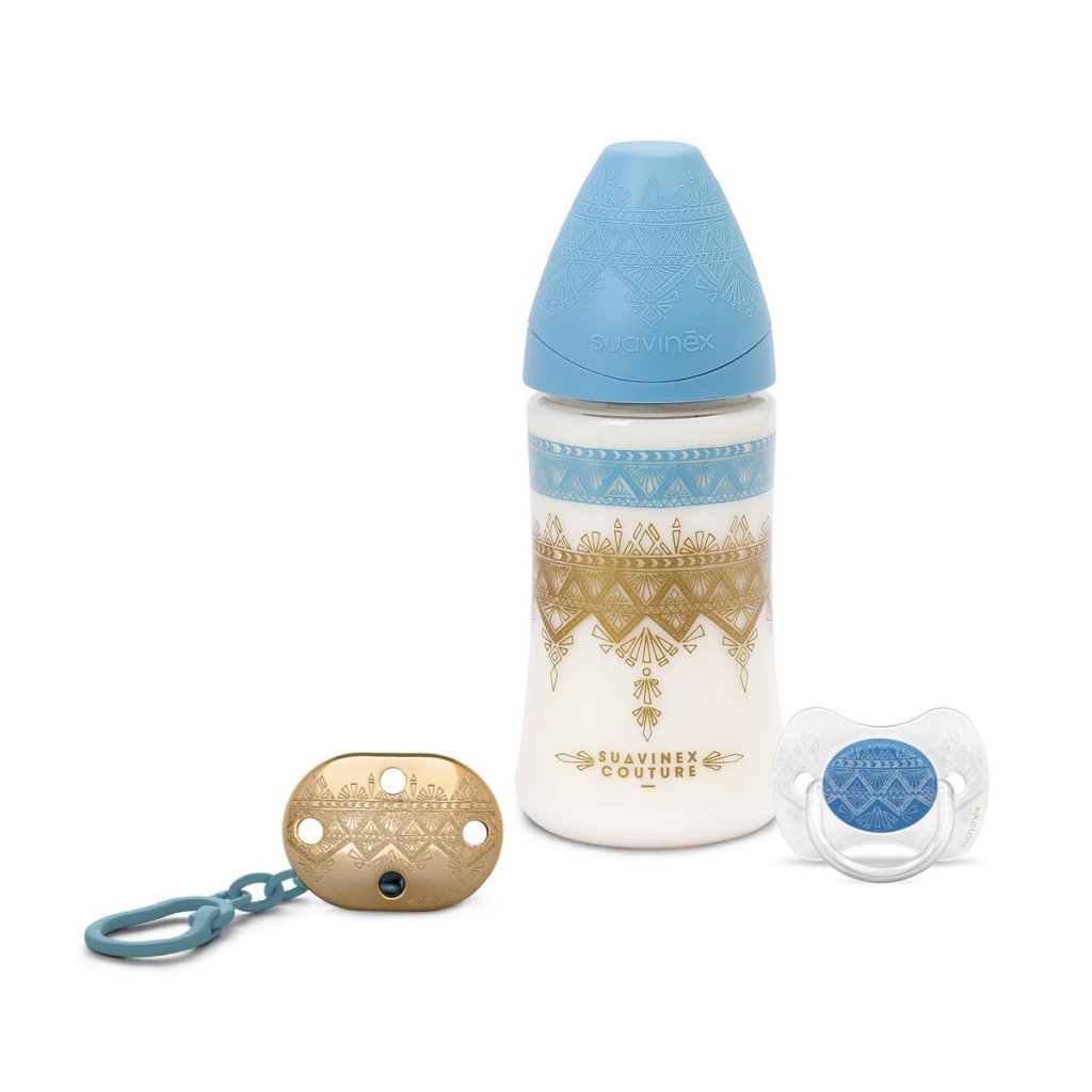 SUAVINEX Couture Set Láhev 270 ml + dudlík 0-4m + klip Light Blue