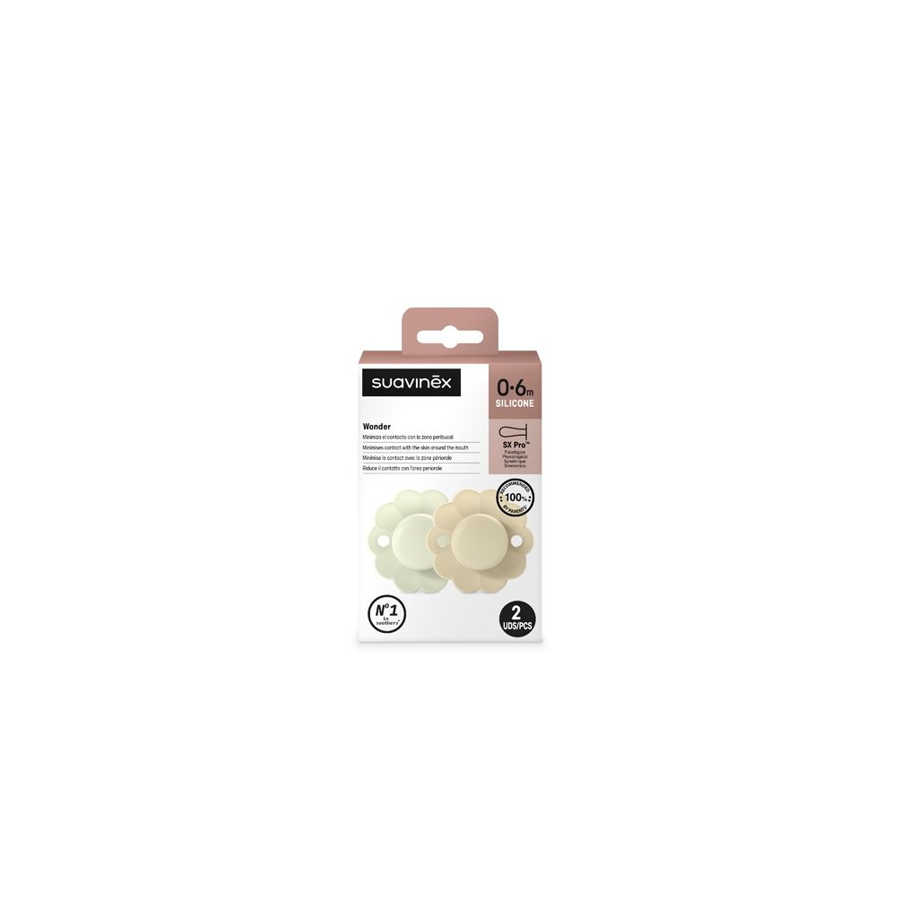 Okraj je mírně zkosený směrem ven, pomáhá tak zabránit doteku tváře. Tím je zajištěna volná cirkulace vzduchu mezi dudlíkem a nosem. Nezáleží na tom, kterou stranou je do úst vložena, a navíc eliminuje nesprávný vývoj ústní dutiny. Bez kroužku - tvar dudlíku je navržen tak, aby jej děti mohly vkládat/vyndávat samy. Pomáhá předcházet podráždění v peribukální oblasti, kde je pokožka v ranné fázi růstu dítěte zvláště citlivá právě pro nadměrné slinění. Dudlík bez kroužku poskytuje nezávislost Vašemu miminku, aby si jej děti mohly samy vkládat/vyndávat. Je velkým pomocníkem pro klid vás i vašeho miminka, ať již při spánku nebo na vycházce. Je dokázáno, že sání dudlíku uvolňuje endorfin, takzvaný hormon štěstí, který přináší dítěti příjemný konejšivý pocit. Dopřejte dítěti dudlík místo prstů či pěstičky, protože tento způsob uklidňování může velmi porušit budoucí dentální vývoj. Veškeré savičky i dudlíky jsou podpořené a vyráběné ve spolupráci s Asociací španělských dětských ortodontistů a respektují přirozený vývoj dásní, zubů i patra dítěte. Barvy použité pro dekorování výrobků značky Suavinex jsou přírodní a netoxické.