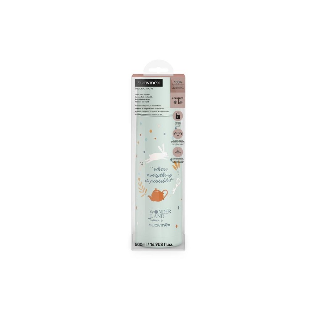 Termoska na tekutiny řady WONDERLAND značky Suavinex je ideální pro uchování a přepravu teplých i chladných nápojů - uchovává teplotu tekutin po dobu až 4 hodin. Je velkým pomocníkem při výletech s dětmi ven nebo při přípravě mléka předem pro noční krmení. Má široké hrdlo a všechny její hrany jsou zaoblené – snadno se čistí a neusazují se bakterie.
