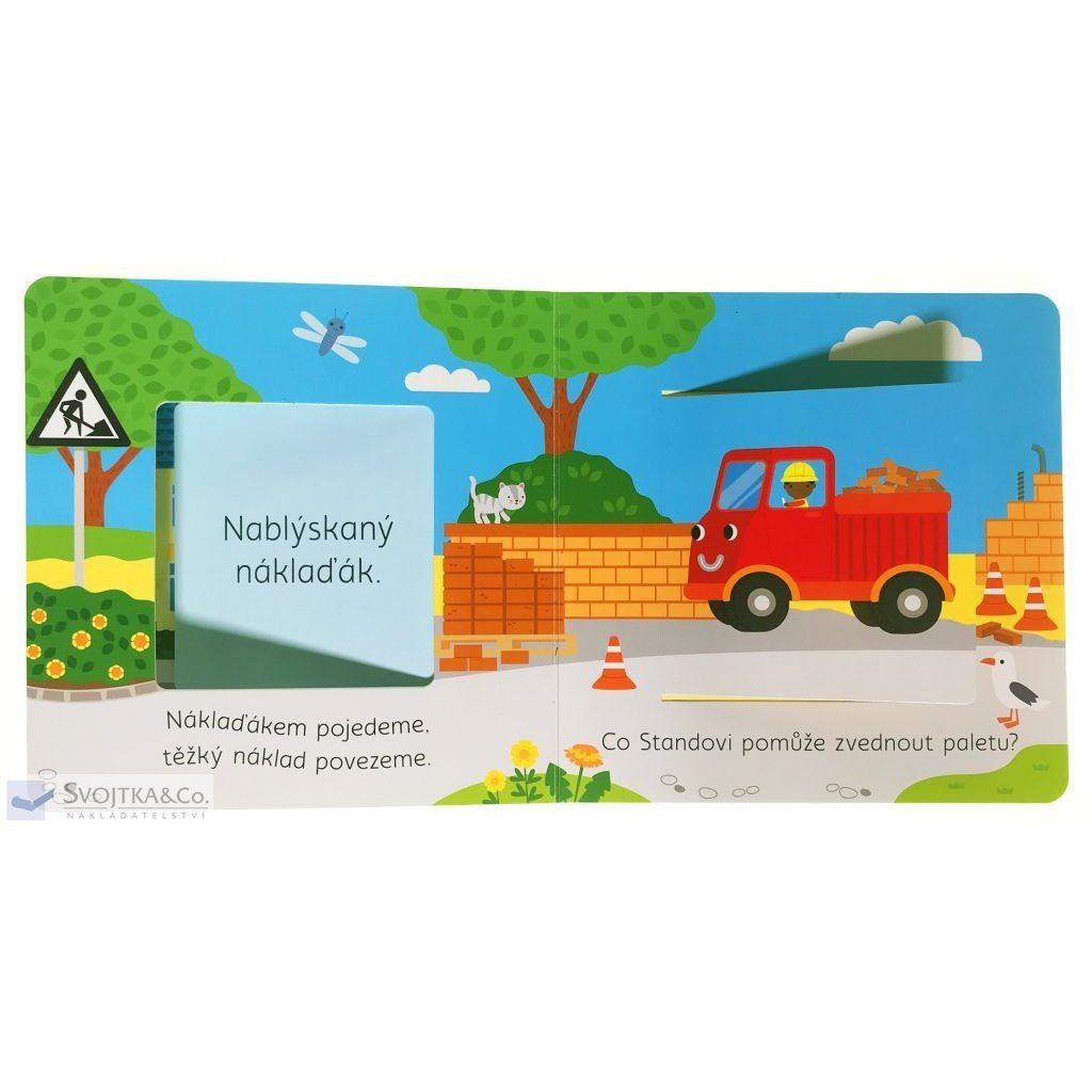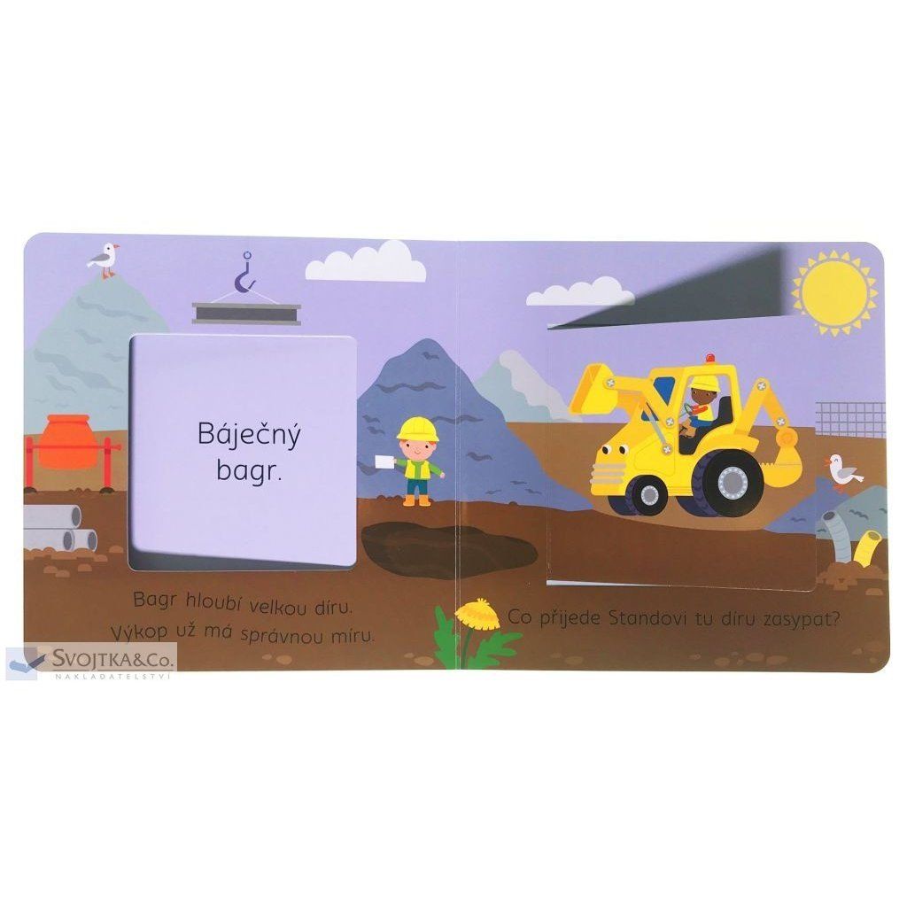 "Bagr hloubí velkou díru, výkop už má správnou míru." Vítejte na stavbě. Že jsou vaše děti celé paf z dopravních prostředků, silných strojů, jeřábů, bagrů a všeho, co se kolem staveniště točí? Pak jistě ocení toto roztomilé veršované leporelo s velkými otvíracími okénky, skrz která lze nahlédnout přímo na stavbu. Malý stavitel či malá stavitelka tak ve vteřině zjistí, co se používá k míchání betonu, který stroj umí zdvihat těžké předměty a čím se do práce dostane stavitel Standa. Knížka rozvíjí jemnou motoriku a základní slovní zásobu.