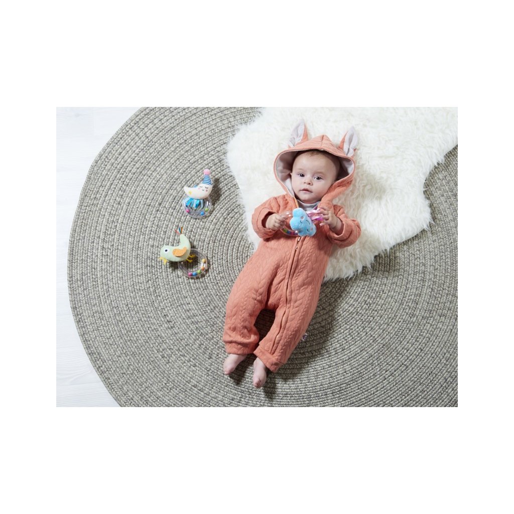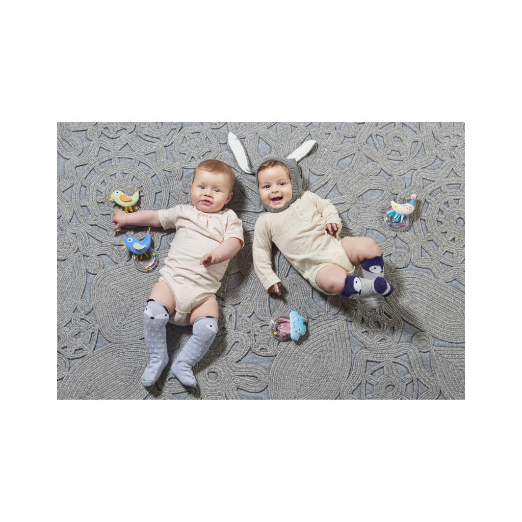 Chrastítko tvoří měkká plyšová hračka ve tvaru měsíčku a průhledný plastový kroužek naplněný barevnými korálky. Různé tvary a povrchy hračky podněcují dítě ke zkoumání rukama i ústy a pomáhají rozvíjet jemnou motoriku a smysly. Vhodné pro děti od narození.
