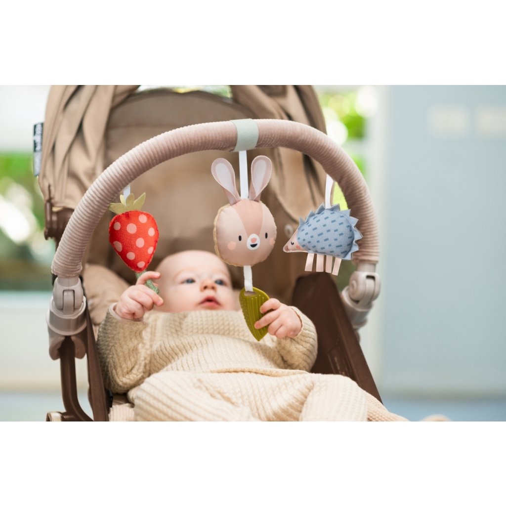 Hudební hrazda určená k připevnění na kočárek nebo autosedačku zabaví vaše miminko na cestách. Snadno ji s pomocí flexibilních plastových klipsů připevníte k většině kočárků i autosedaček. Pozornost dítěte upoutá králíček, který po lehkém doteku hraje melodii, chrasticí ježek i cinkající jahůdka. Hračka rozvíjí motoriku a učí vztahu příčiny a následku.