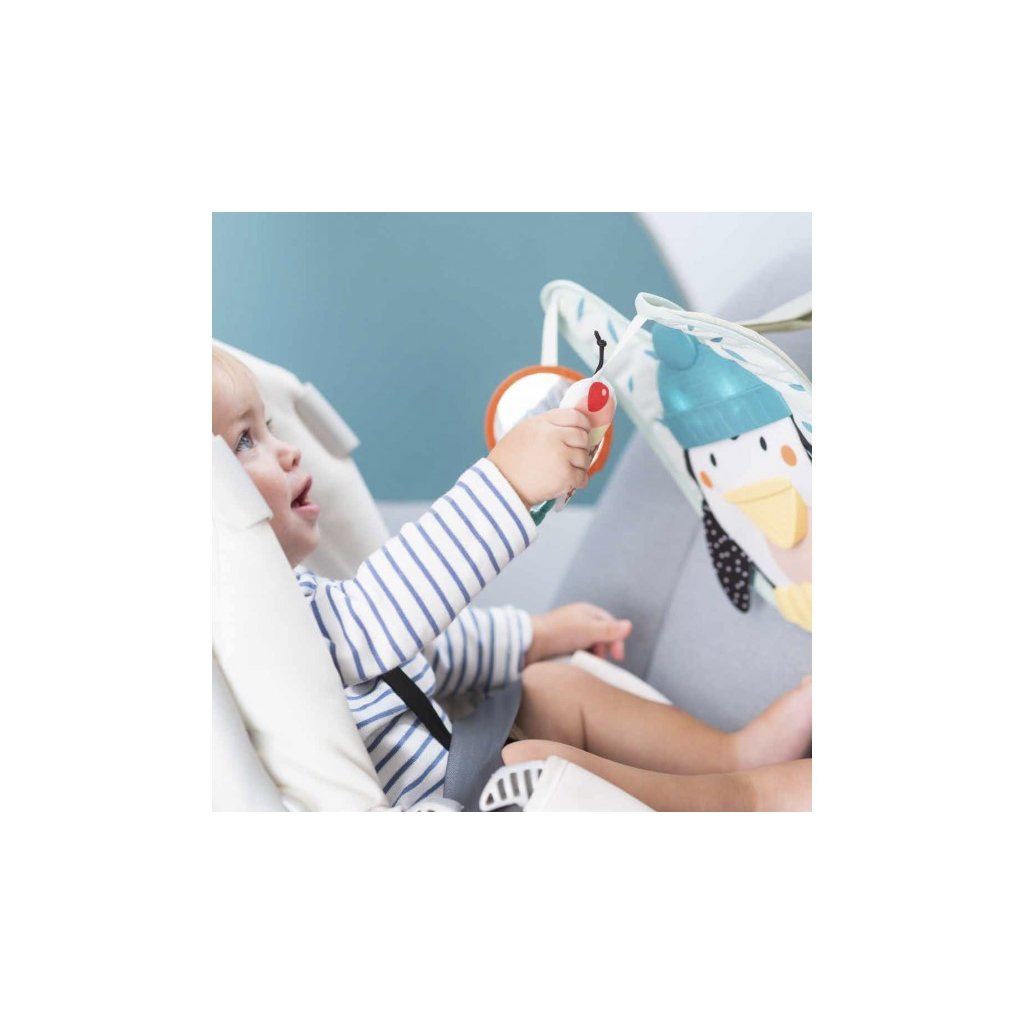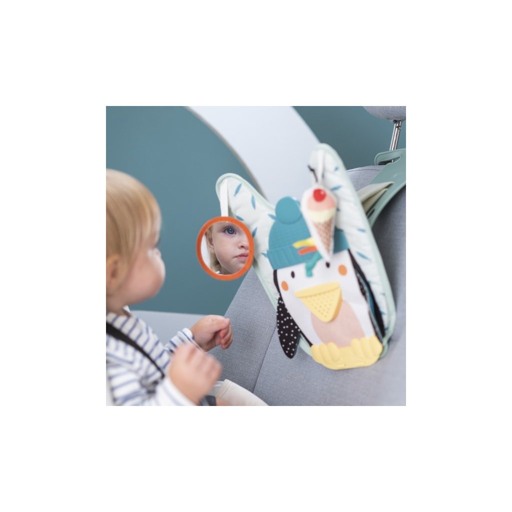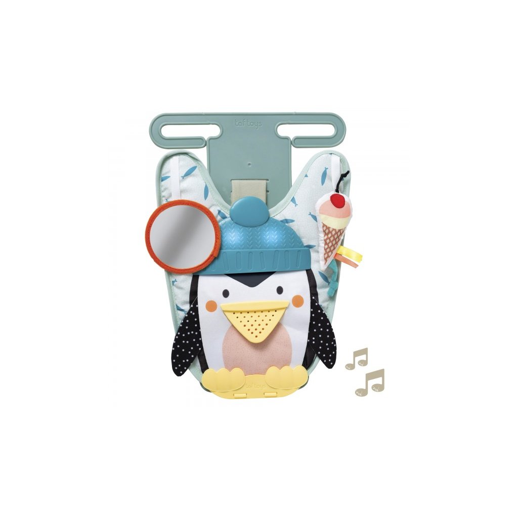 Hrací pultík do auta Taf Toys s hudbou a světélky zabaví vaše miminko na cestách autem a zajistí vám klid při řízení. Pultík se připevňuje na sedadlo nad autosedačku proti směru jízdy. Hudbu i světýlka dítě aktivuje kopáním nožiček do spodní části pultíku. Dítě se tak učí příčině a následku a rozvíjí své motorické dovednosti. Dvě zavěšené hračky - bezpečné zrcátko a chrasticí zmrzlina - lákají ke zkoumání a podněcují rozvoj smyslů dítěte. Pultík snadno připevníte k opěrce hlavy předního sedadla a s pomocí suchých zipů nastavíte tak, aby dítě na pultík rukama i nožičkami dosáhlo.