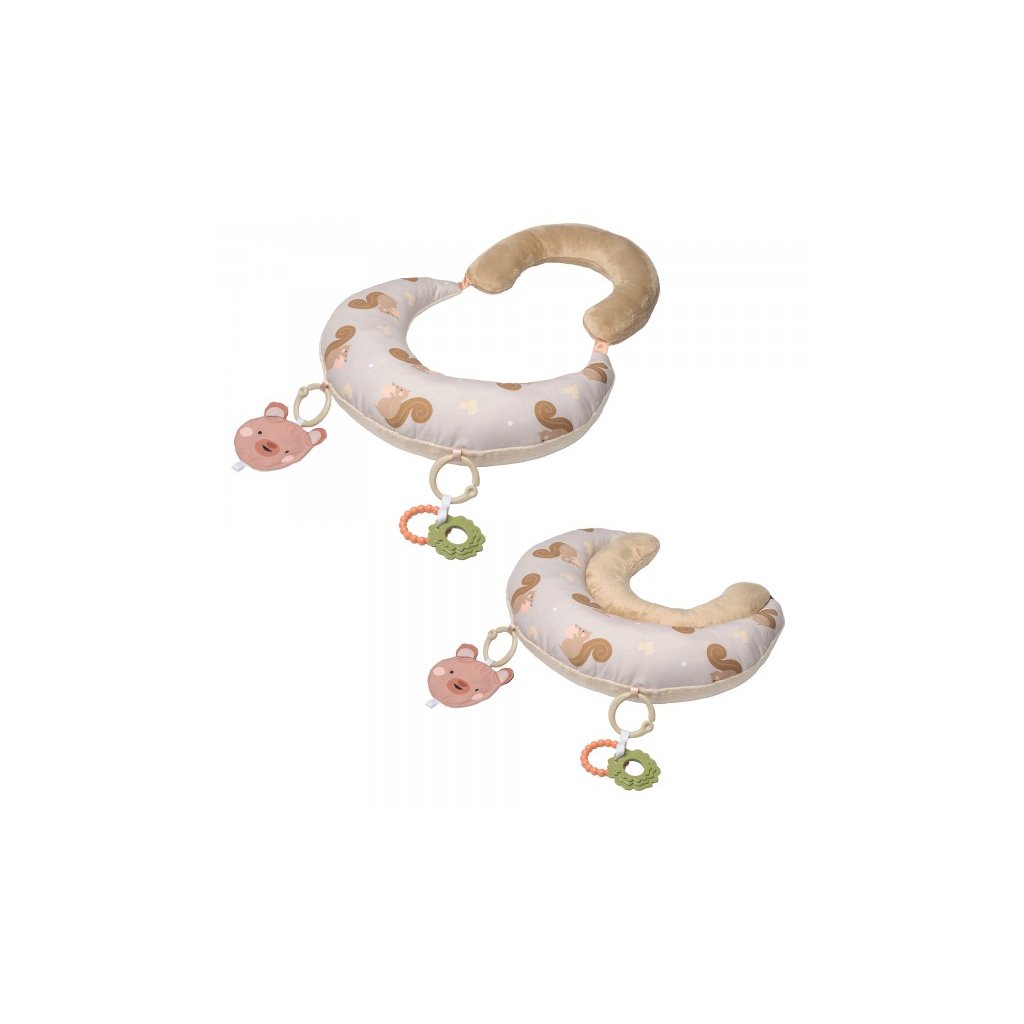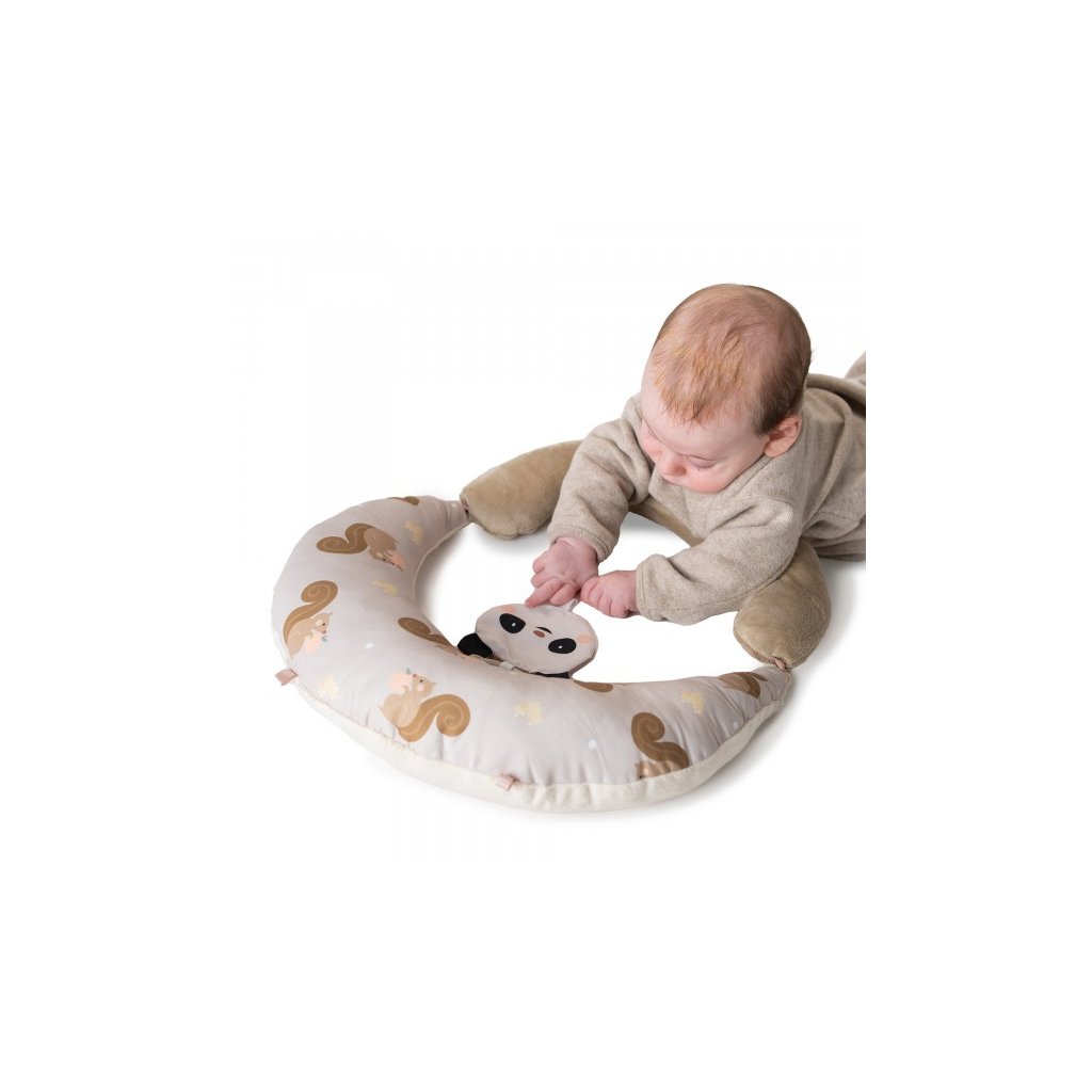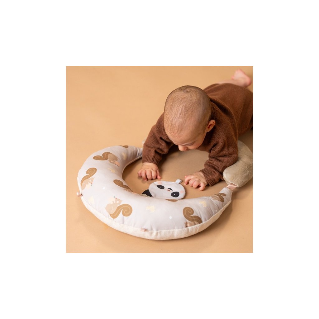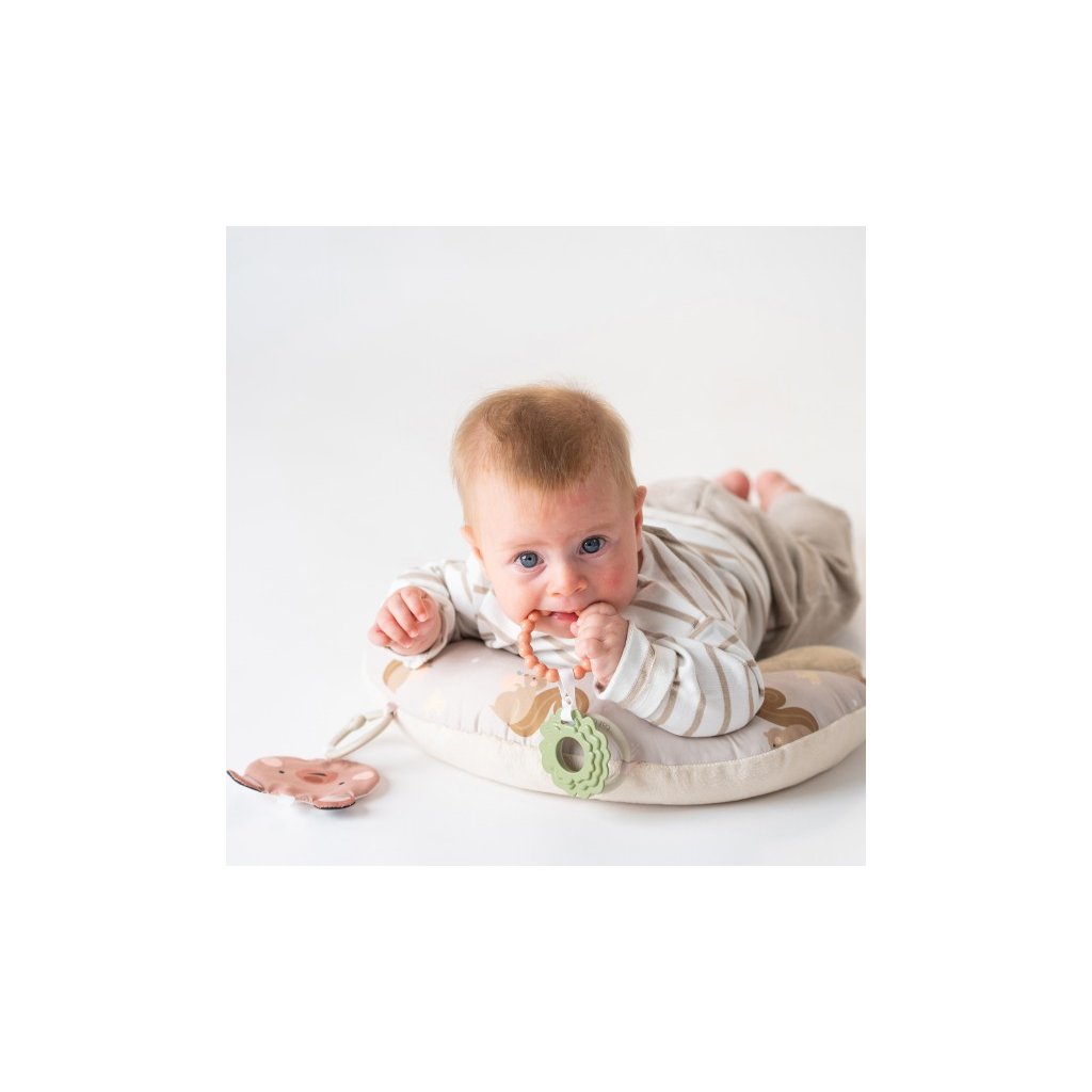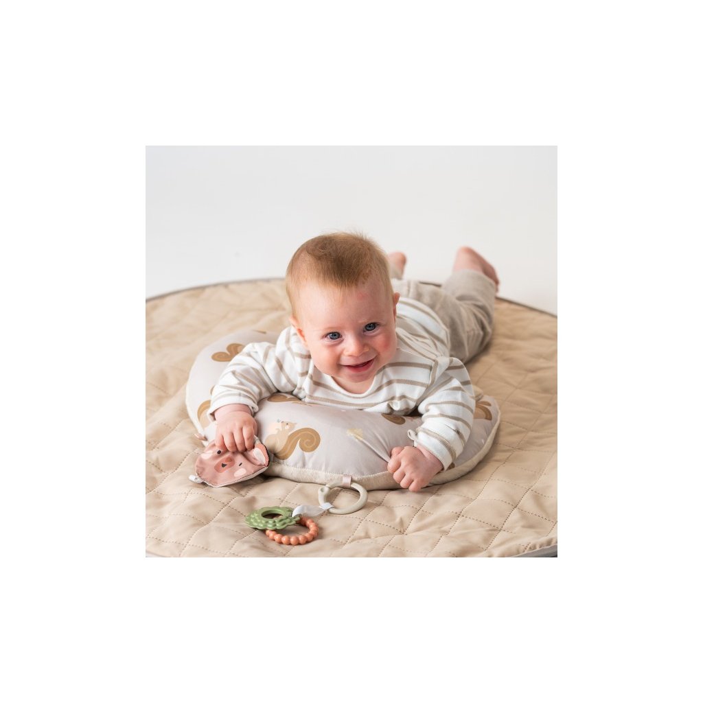 Polštářek z měkkého, příjemného materiálu je speciálně navržený, aby podporoval hraní dítěte na bříšku. Pro malého kojence, který tráví většinu dne i noci ležením na zádech, je důležité, aby trávil několikrát denně čas ležením na bříšku a takzvaným “pasením koníčků”. Poloha na bříšku přináší děťátku jiný pohled na svět a posiluje krční a zádové svaly, které později umožňují dítěti začít se přetáčet, lézt a sedět bez opory. Balení obsahuje polštářek pro hru na bříšku, oboustrannou šusticí hračku a kousátko s kroužky. Vhodné pro děti od narození.