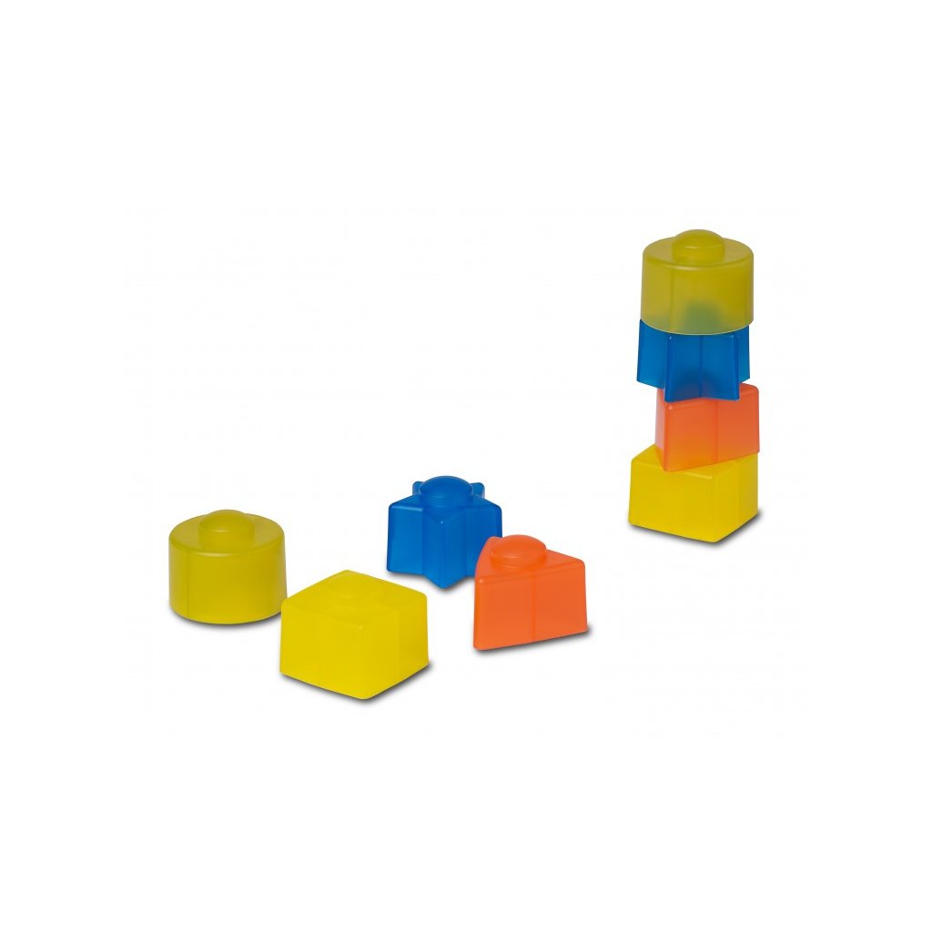 - 8 různobarevných tvarů se dítě učí vkládat do správných otvorů v největší kostce nebo do jednotlivých kostek dle barvy či tvaru