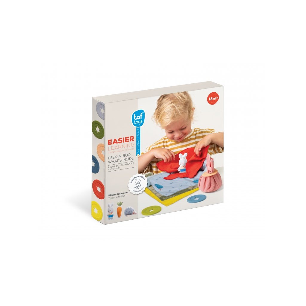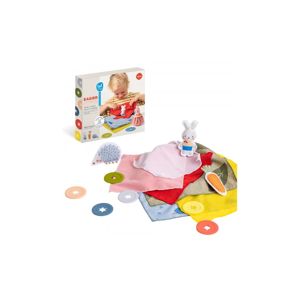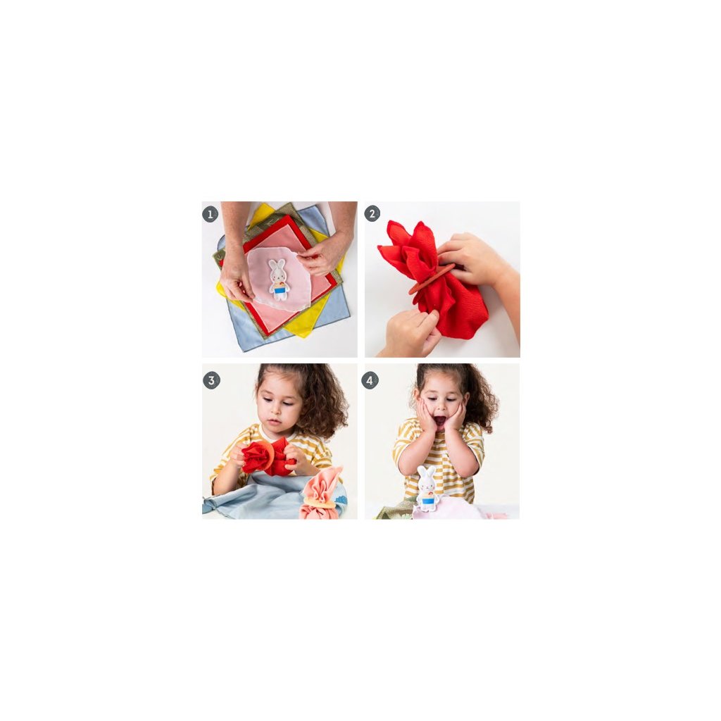 Poutavá schovávací hra pro vaše batole obsahuje 6 šátků, 6 silikonových uzávěrů a 3 hračky v podobě zajíčka, ježka a mrkvičky. Hračku zabalíte do šátků, uzavřete uzávěrem a dítě postupným rozbalováním jednotlivých vrstev hledá, co se uvnitř skrývá. Hračka zábavnou formou rozvíjí jemnou motoriku, představivost a kreativitu dítěte, učí jej barvám i vztahu příčina / následek. Zároveň ji můžete využít i pro učení dítěte barvám i prvnímu počítání. Svým provedením je hra skvělá na hraní doma i na cestách. Vhodné pro děti od 18 měsíců.