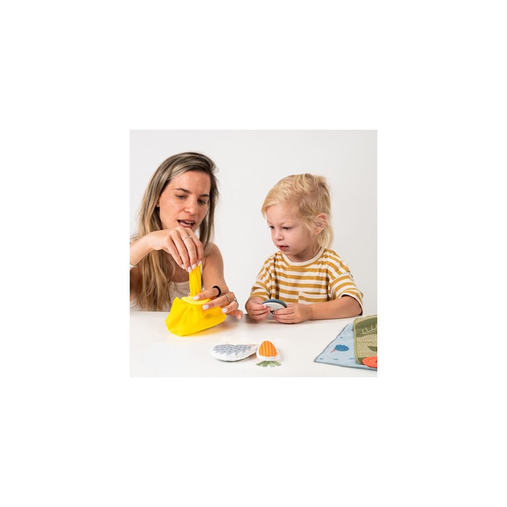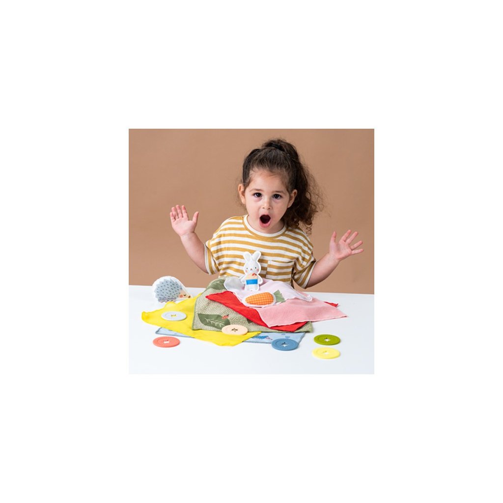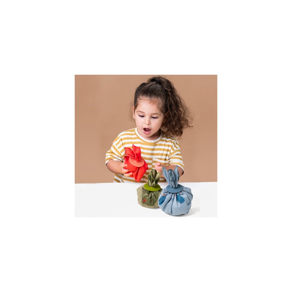 Poutavá schovávací hra pro vaše batole obsahuje 6 šátků, 6 silikonových uzávěrů a 3 hračky v podobě zajíčka, ježka a mrkvičky. Hračku zabalíte do šátků, uzavřete uzávěrem a dítě postupným rozbalováním jednotlivých vrstev hledá, co se uvnitř skrývá. Hračka zábavnou formou rozvíjí jemnou motoriku, představivost a kreativitu dítěte, učí jej barvám i vztahu příčina / následek. Zároveň ji můžete využít i pro učení dítěte barvám i prvnímu počítání. Svým provedením je hra skvělá na hraní doma i na cestách. Vhodné pro děti od 18 měsíců.
