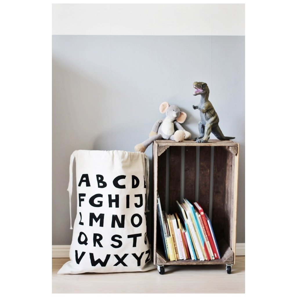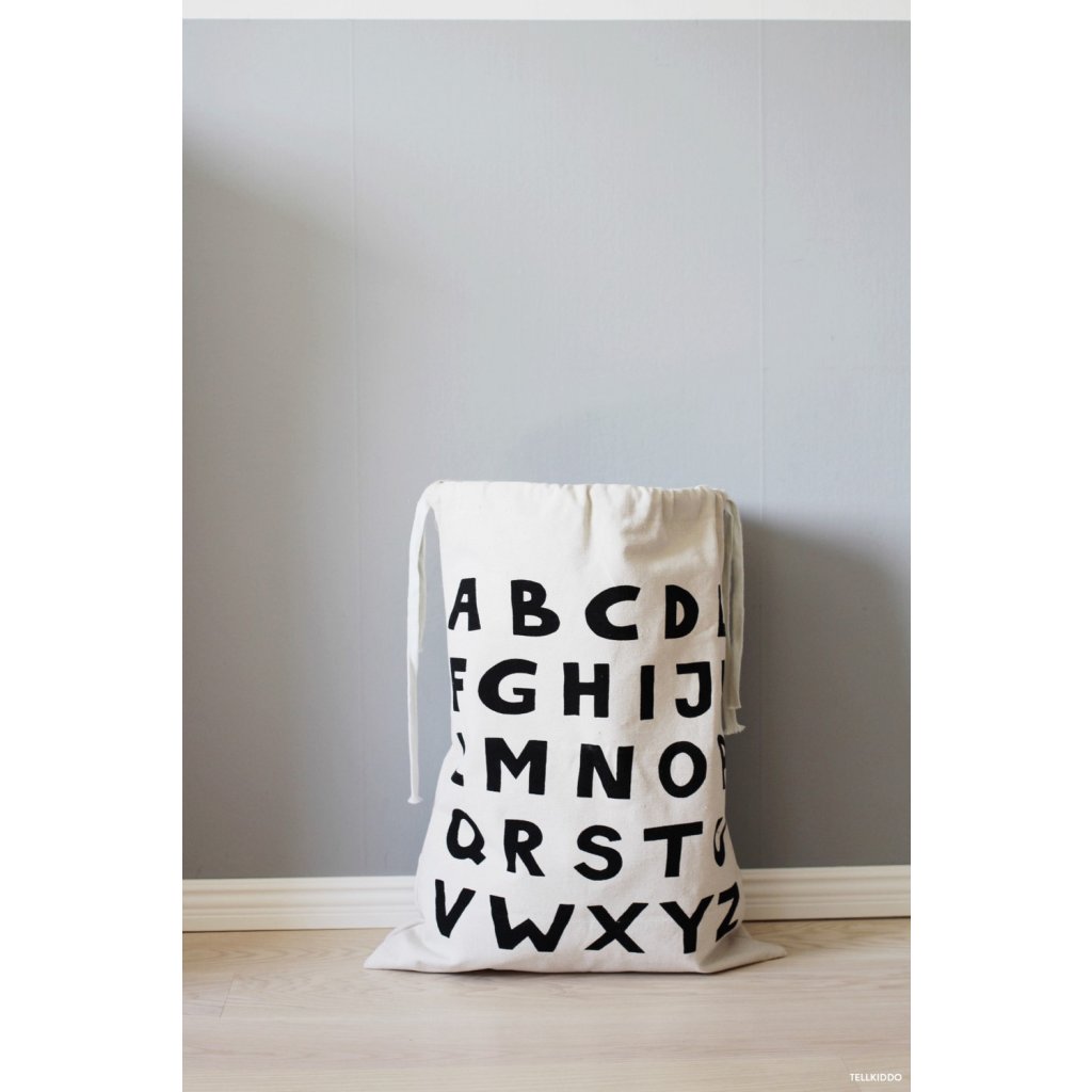 Úložných prostor v pokojíčku není nikdy dost! Pořiďte svému dítěti látkový pytel značky Tellkiddo a uvidíte, že z uklízení se stane zábava. Tento pytel je vyrobený z režného přírodního plátna a je opravdu pevný, díky čemuž bez problému pojme vše potřebné od hraček, přes polštáře a deky až po špinavé oblečení. Praktická tkanička umožňuje jeho stažení a případné zavěšení. Díky minimalistickému černobílému vzhledu zapadne do každého pokojíčku. Pytel má motiv abecedy.