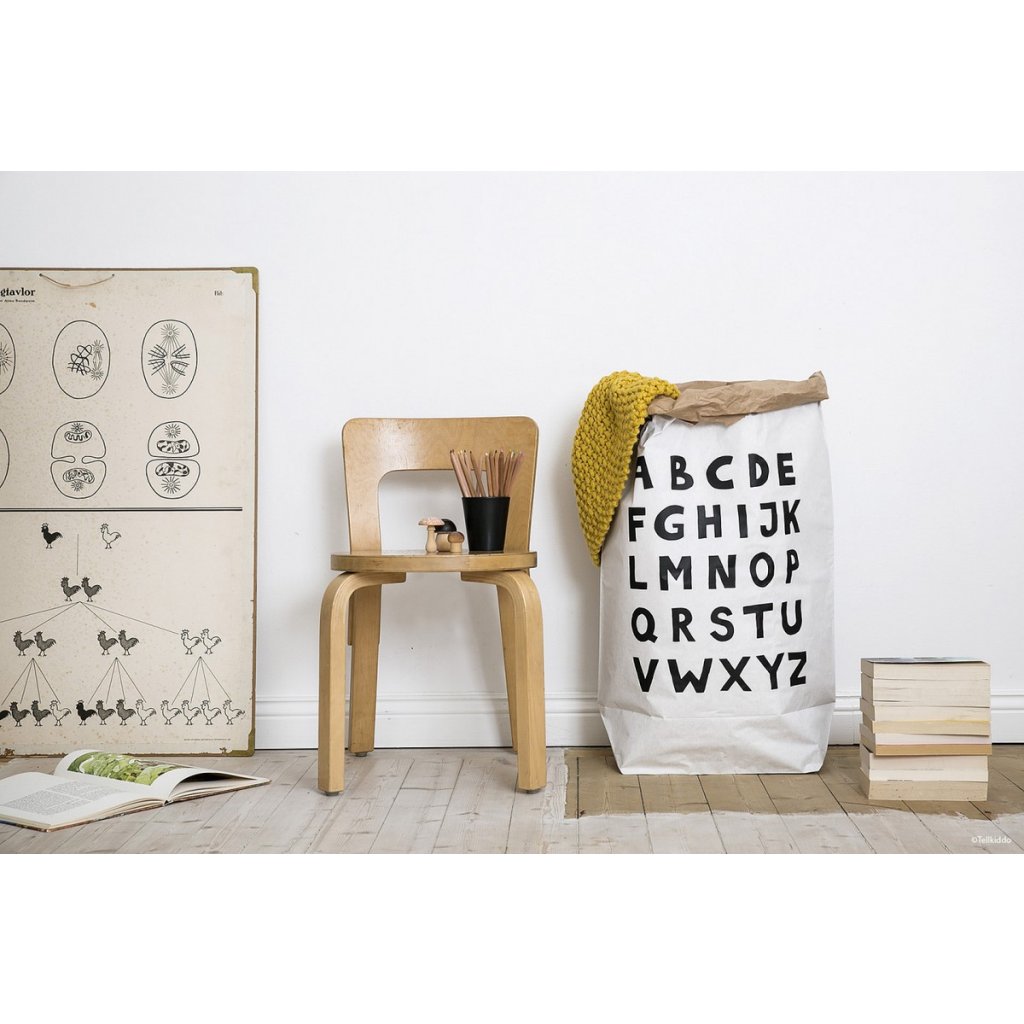 Úložných prostor v pokojíčku není nikdy dost! Pořiďte svému dítěti papírový pytel značky Tellkiddo a uvidíte, že z uklízení se stane zábava. Tento ručně vyrobený dvouvrstvý pytel z recykovatelného papíru je opravdu pevný a bez problému pojme vše potřebné od hraček, přes polštáře a deky až po špinavé oblečení. Díky minimalistickému černobílému vzhledu zapadne do každého pokojíčku. Pytel má motiv abecedy.