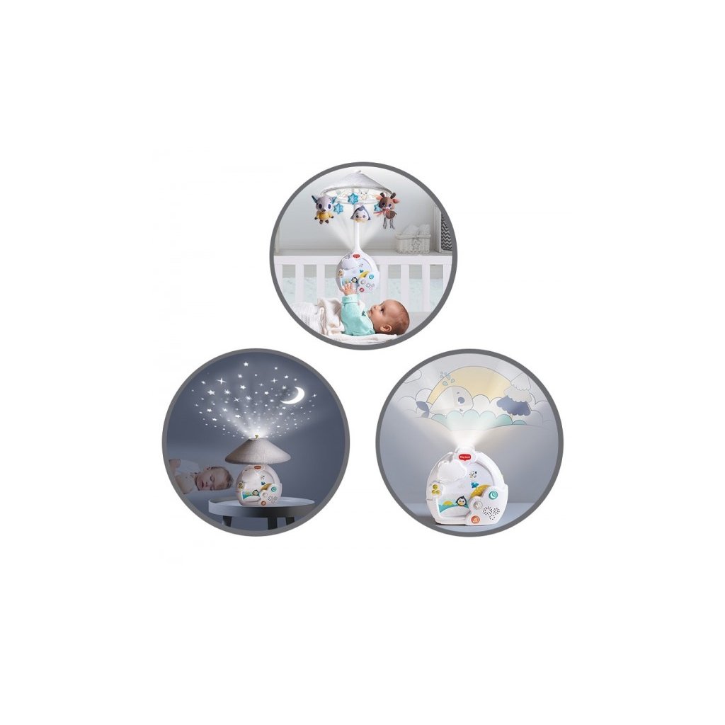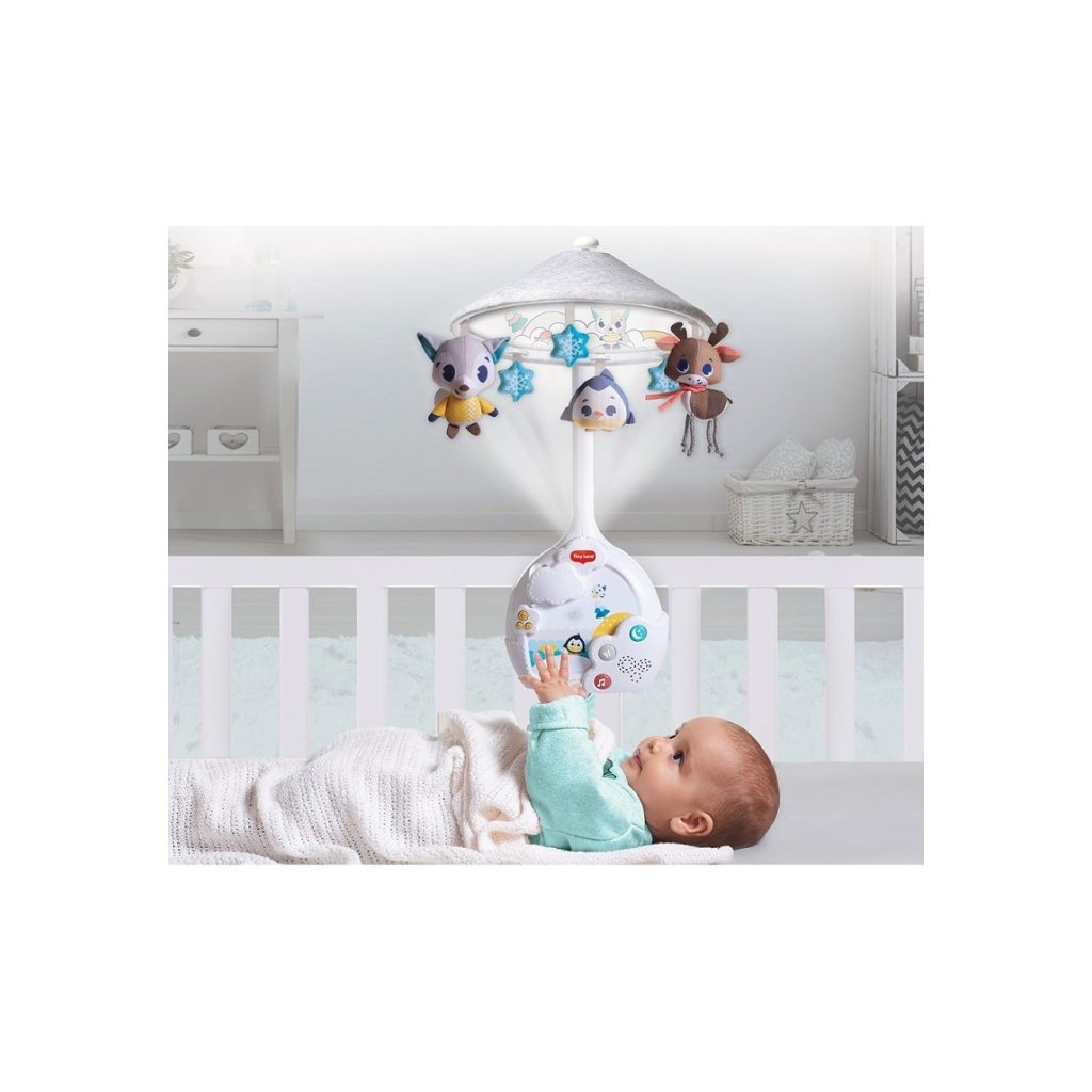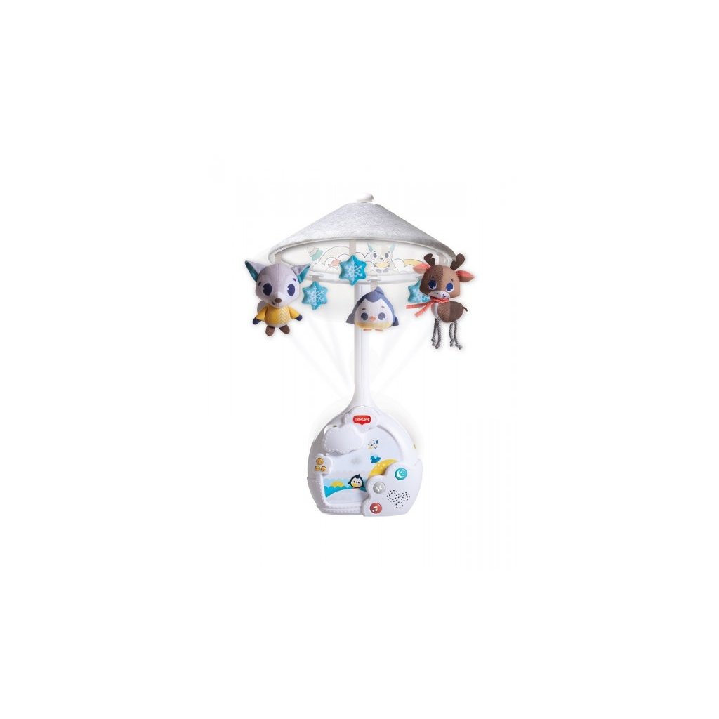Hudební kolotoč Tiny Love s odnímatelným hudebním přehrávačem a světelnou projekcí na stříšku kolotoče nebo na strop. Hudební box nabízí 9 různých melodií v celkové délce 30 minut. Možnost nastavení hlasitosti hudby. Zavěšené otáčející se postavičky upoutají pozornost dítěte v postýlce. Spolu s uklidňujícími melodiemi a jemnou světelnou projekcí pomohou navodit dítěti pocit bezpečí a klidu, který přispívá ke snadnějšímu usínání dítěte v postýlce. Kolotoč je vhodný od narození do cca 5 měsíců věku. Od 5 měsíců je možné používat hudební box s nočním světýlkem a projekcí samostatně.
