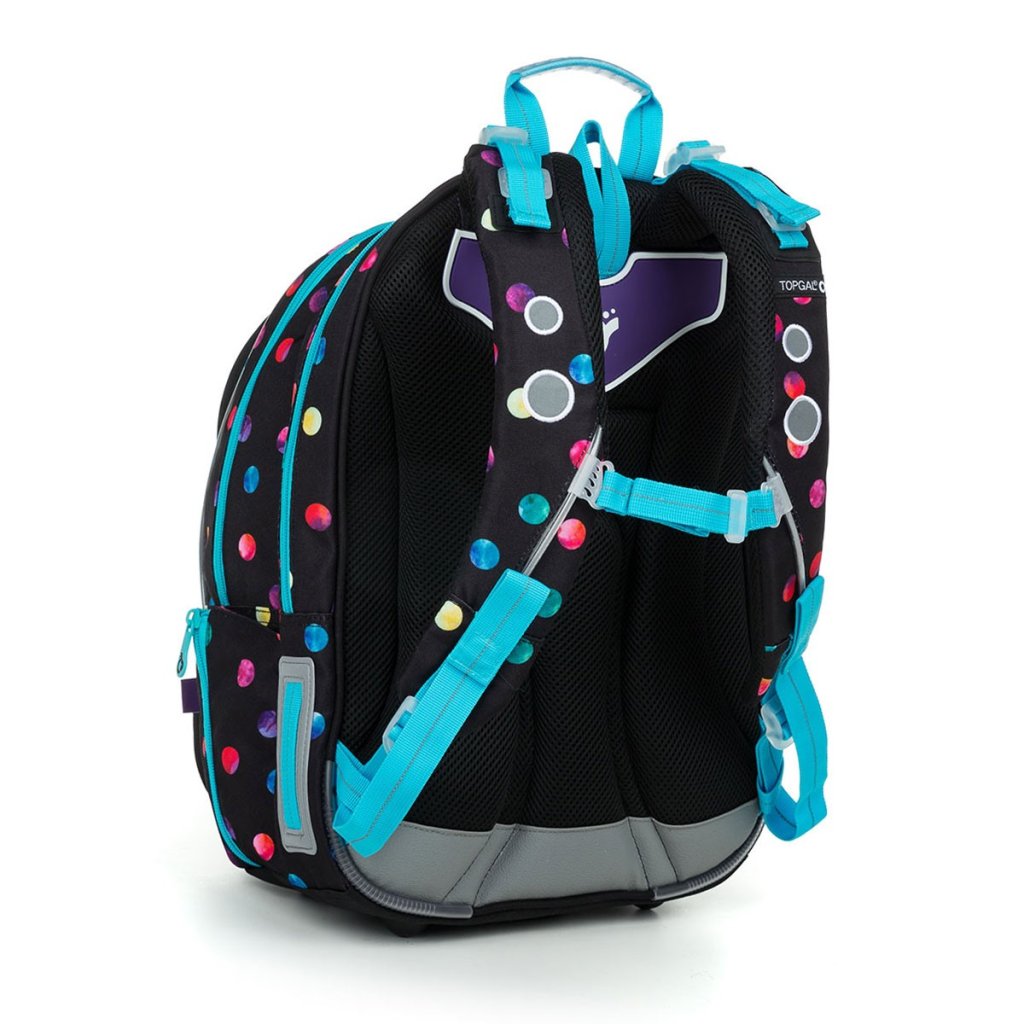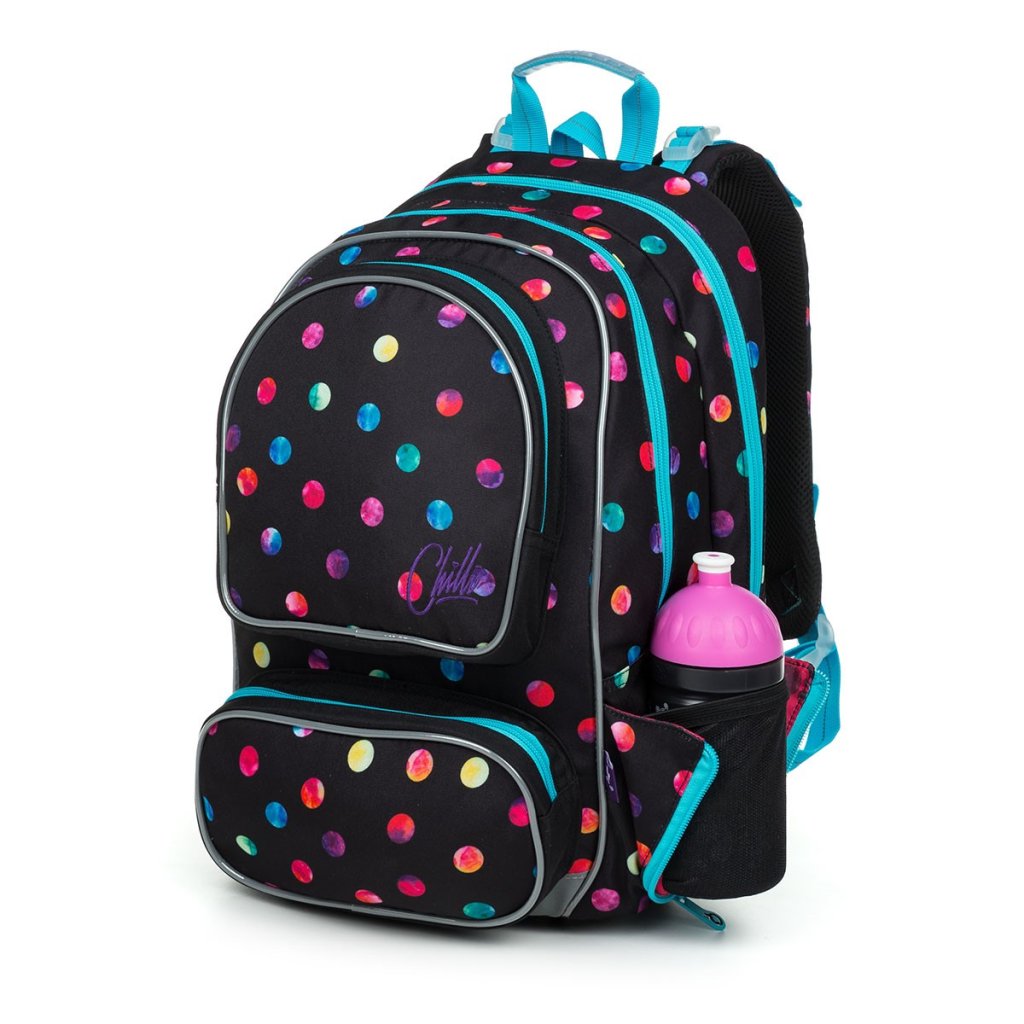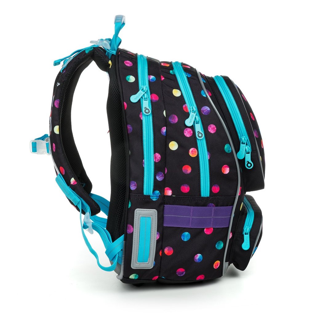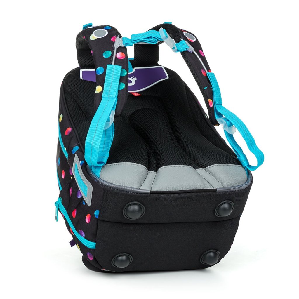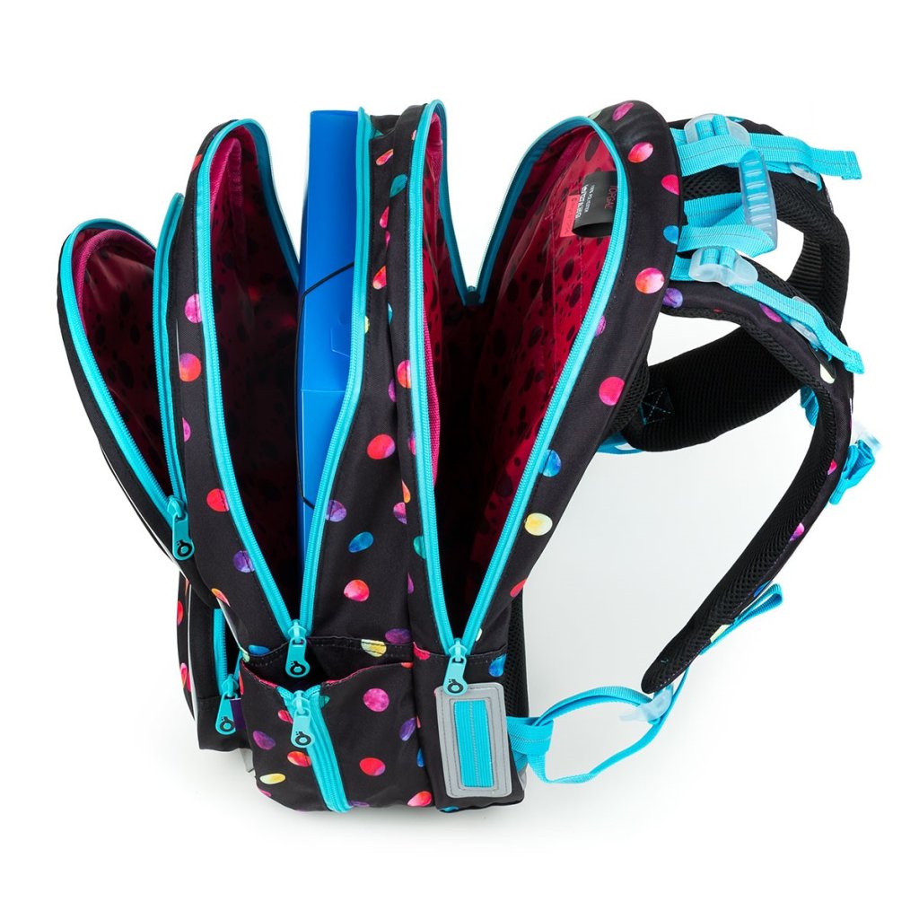 Oblíbený dvoukomorový střih batohu, s dvěma předními kapsičkami, ocení všechny dívky od 2.třídy výše. Pokud se ale vaše dcera chystá do první třídy, má nad 120 cm a líbí se jí, klidně jej může mít! Navíc, puntíky nikdy nevyšly z módy! Batoh má pevná, anatomicky tvarovaná záda s lehkou hliníkovou výztuhou. Ergonomicky tvarované, polstrované ramenní popruhy lze utáhnout v jejich spodní části na délku a v jejich horní části pak k tělu. Doplňuje je výškově nastavitelný hrudní pás. Aby dlouhé popruhy případně nevlály kolem těla, jsou na koncích opatřeny magnetkami, které jdou připnout k tělu popruhů (viz detailní fotky). Zadní komora batohu je užší a je jak dělaná na velké těžké učebnice nebo na desky na sešity. Přední komora je pak velmi objemná, hluboká, a navíc ukrývá malou síťovou kapsičku na zip a jmenovku. Na přední straně batohu najdete dvě menší kapsičky. Do spodní se vejdou kapesníčky nebo další drobné věci, které je potřeba mít poruce. Kapsičku na lahev na pití najdete na boku batohu. Děti potřebují být vidět, zvláště v zimním období, proto je batoh opatřen řadou reflexních prvků na ramenních popruzích, čele i boku batohu.
