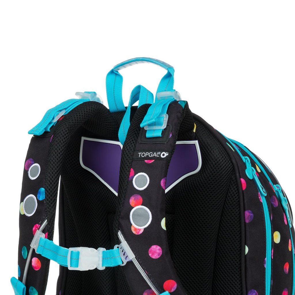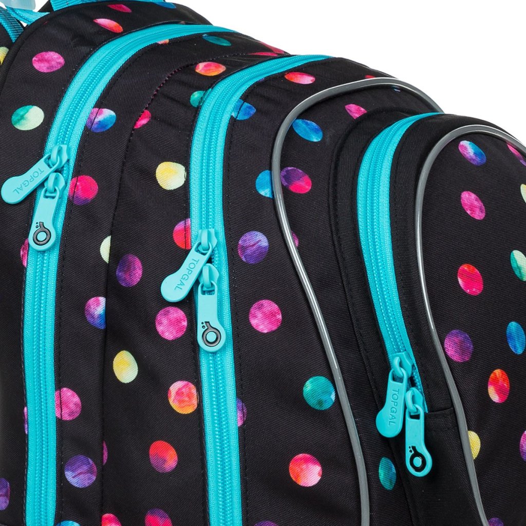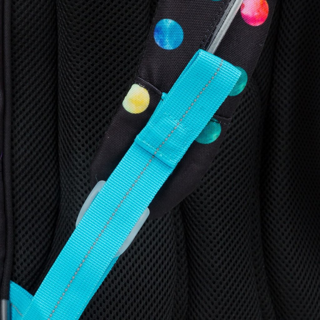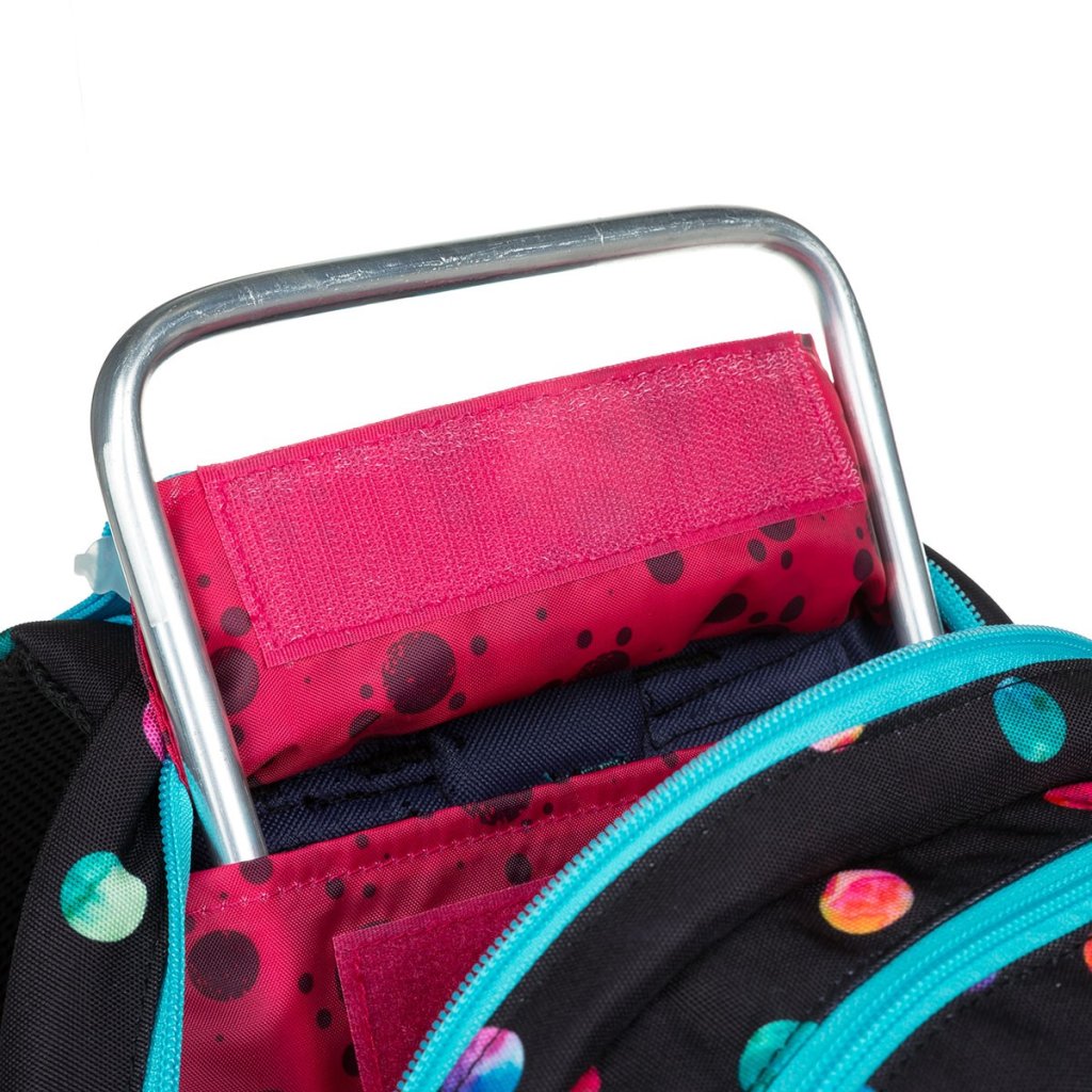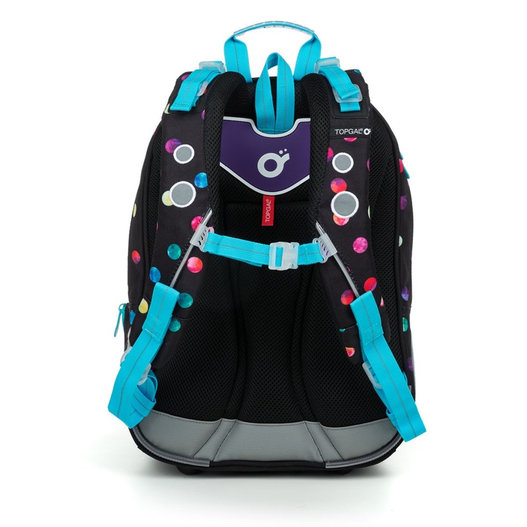 Oblíbený dvoukomorový střih batohu, s dvěma předními kapsičkami, ocení všechny dívky od 2.třídy výše. Pokud se ale vaše dcera chystá do první třídy, má nad 120 cm a líbí se jí, klidně jej může mít! Navíc, puntíky nikdy nevyšly z módy! Batoh má pevná, anatomicky tvarovaná záda s lehkou hliníkovou výztuhou. Ergonomicky tvarované, polstrované ramenní popruhy lze utáhnout v jejich spodní části na délku a v jejich horní části pak k tělu. Doplňuje je výškově nastavitelný hrudní pás. Aby dlouhé popruhy případně nevlály kolem těla, jsou na koncích opatřeny magnetkami, které jdou připnout k tělu popruhů (viz detailní fotky). Zadní komora batohu je užší a je jak dělaná na velké těžké učebnice nebo na desky na sešity. Přední komora je pak velmi objemná, hluboká, a navíc ukrývá malou síťovou kapsičku na zip a jmenovku. Na přední straně batohu najdete dvě menší kapsičky. Do spodní se vejdou kapesníčky nebo další drobné věci, které je potřeba mít poruce. Kapsičku na lahev na pití najdete na boku batohu. Děti potřebují být vidět, zvláště v zimním období, proto je batoh opatřen řadou reflexních prvků na ramenních popruzích, čele i boku batohu.