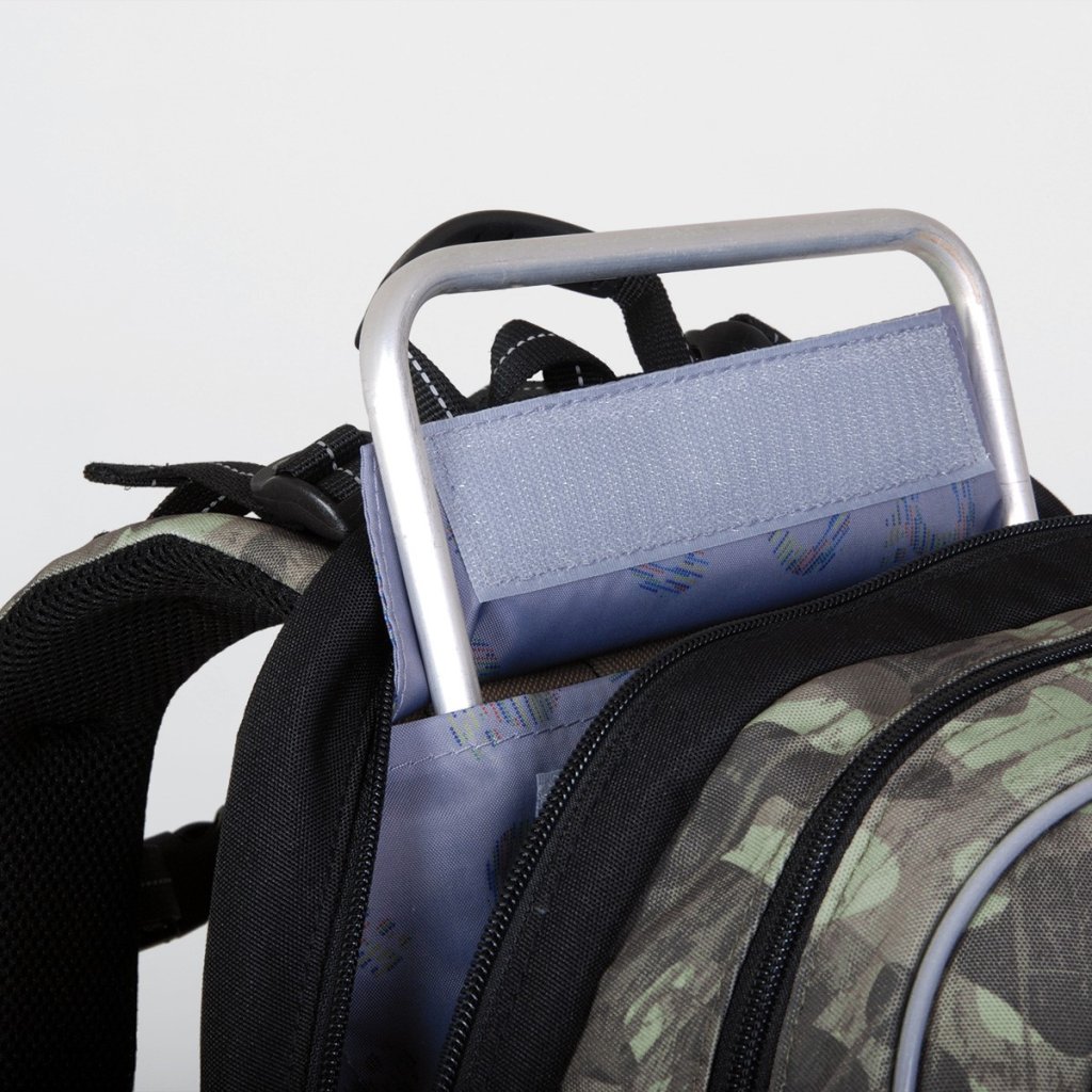 Přední komora batohu je neprostornější, je zde umístěná jmenovka a praktická síťovinová kapsa. Zadní komora pak poskytuje dostatek prostoru pro další školní pomůcky. Na přední straně batohu je prostorná kapsa, do které můžete dát menší předměty jako krabičku na svačinu nebo jednopatrové školní pouzdro . Je zde také praktická karabina na klíče. Na jedné straně má batoh menší elastickou kapsu na 0,75l lahev s pitím nebo jiné drobnosti. Na obou stranách batohu jsou poutka z pevného popruhu pro uchycení pouzdra na lahev nebo pytlíku na přezůvky.