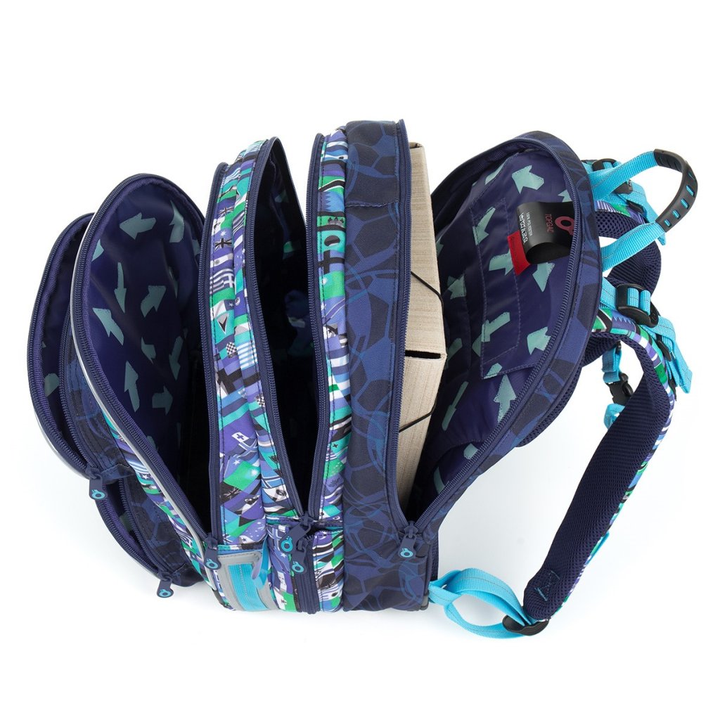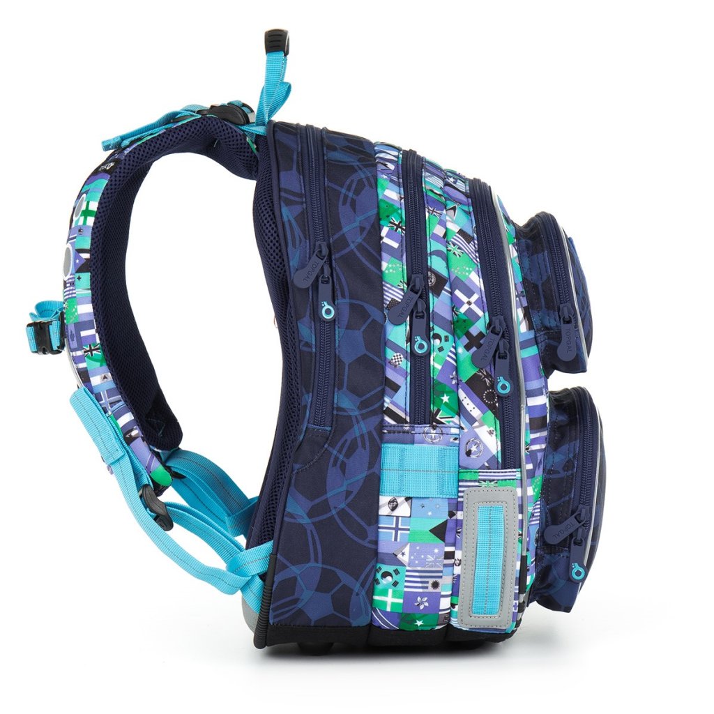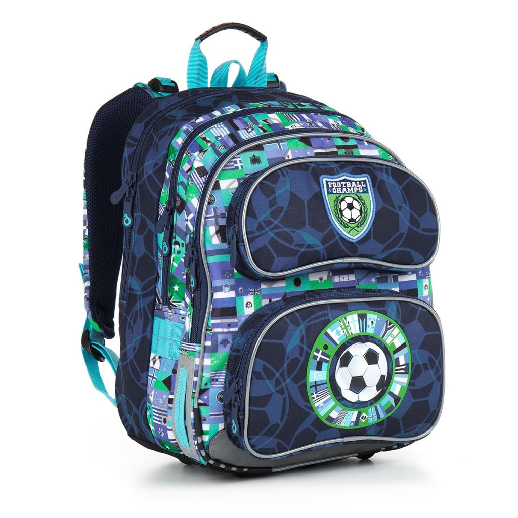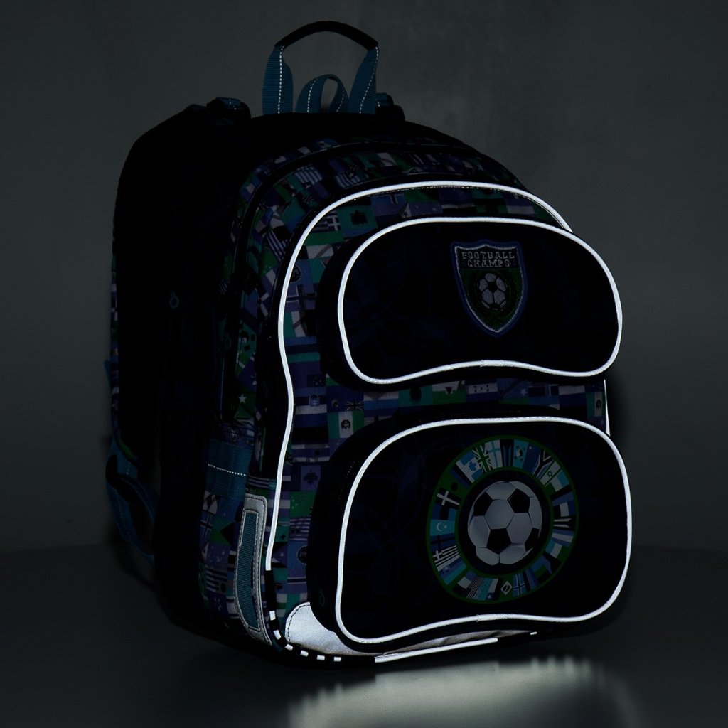 Malý fotbalista určitě sáhne po tomto batohu s tematikou fotbalových šampionů, provedeném v modré a zelené barvě. Do tří komor batohu může školák pohodlně třídit všechny sešity, učebnice a další potřebnosti, které s sebou bude denně nosit do školy. V prostřední kapse najdete síťovou kapsu na zip a jmenovku. Přední komora dobře poslouží pro uložení krabičky se svačinkou. Ta se ale klidně vejde, stejně jako pouzdro, i do spodní kapsičky na čele batohu. V horní kapsičce zase najdete praktickou karabinku na klíče. Na bocích batohu oceníte kapsičku na lahev s pitím, pitný režim přeci fotbalisti potřebjují!