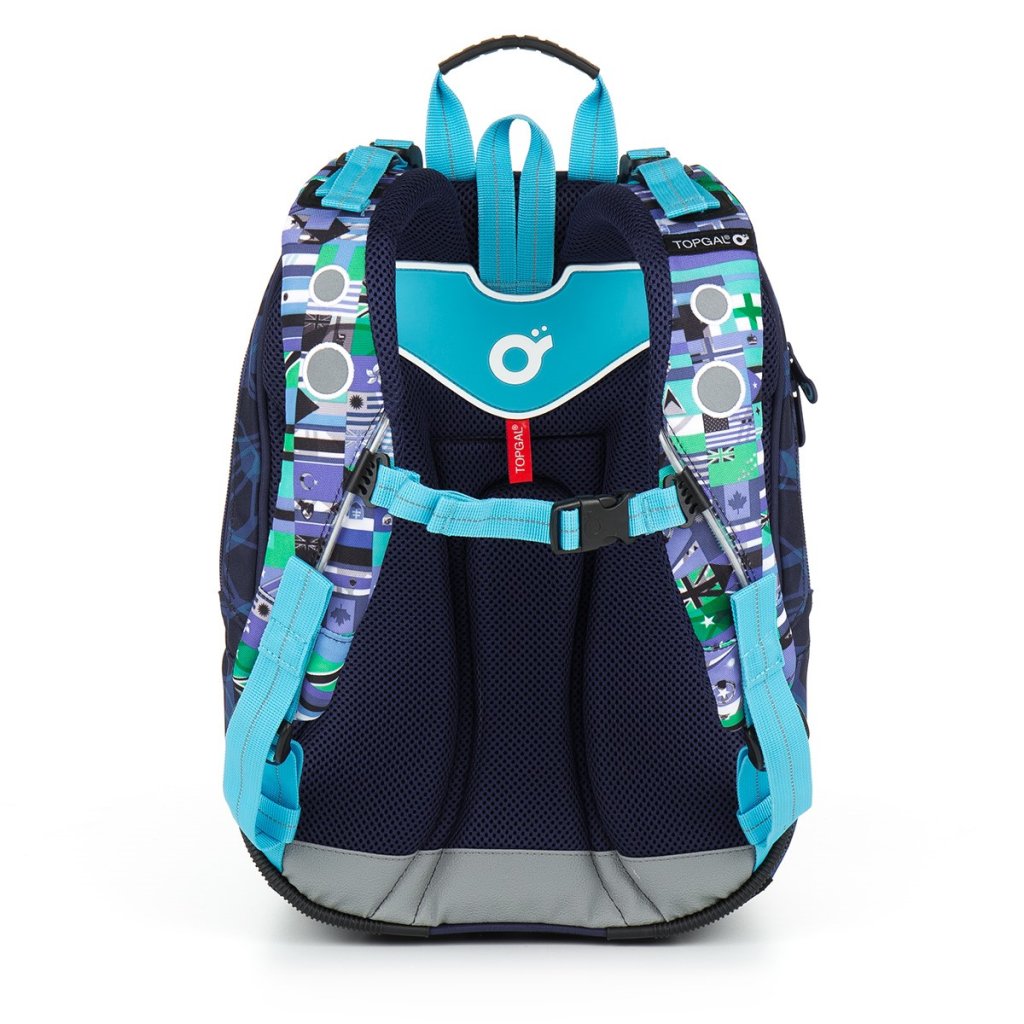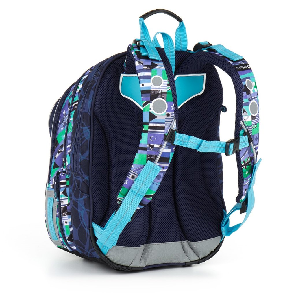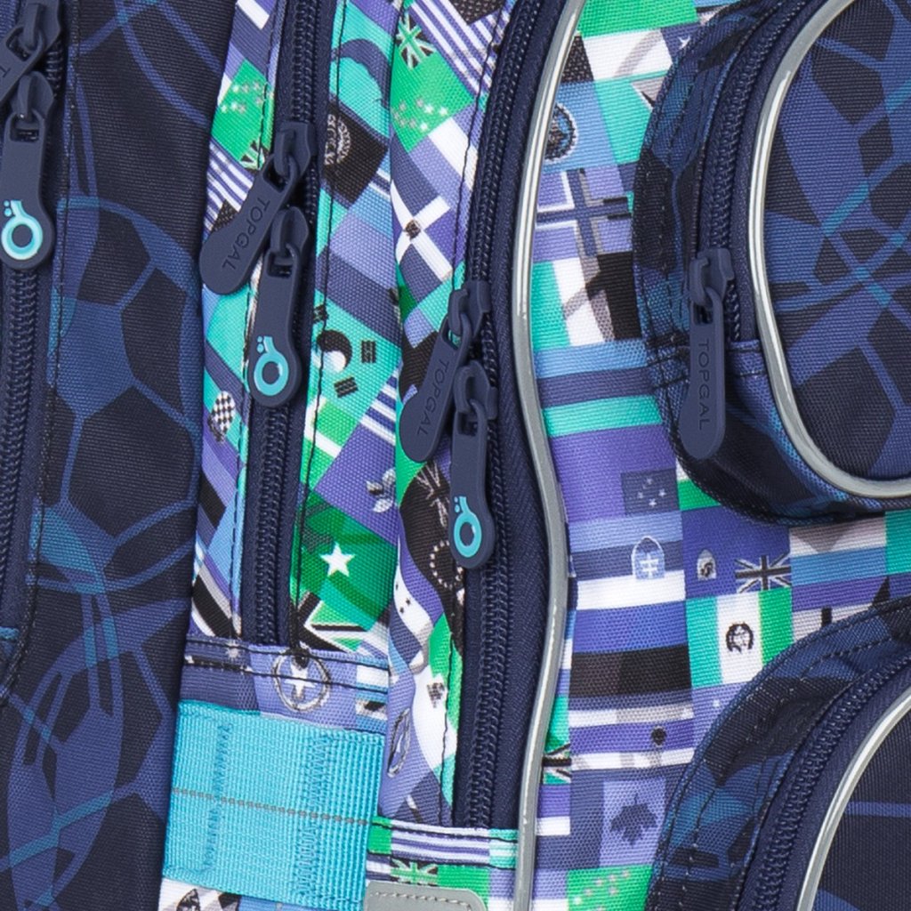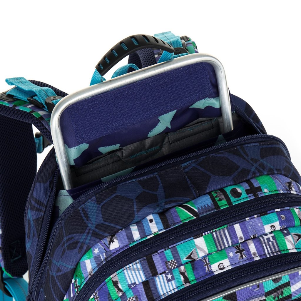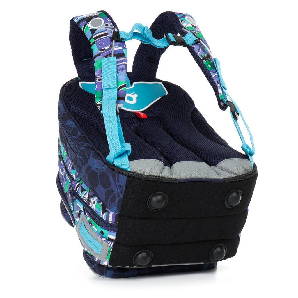 Malý fotbalista určitě sáhne po tomto batohu s tematikou fotbalových šampionů, provedeném v modré a zelené barvě. Do tří komor batohu může školák pohodlně třídit všechny sešity, učebnice a další potřebnosti, které s sebou bude denně nosit do školy. V prostřední kapse najdete síťovou kapsu na zip a jmenovku. Přední komora dobře poslouží pro uložení krabičky se svačinkou. Ta se ale klidně vejde, stejně jako pouzdro, i do spodní kapsičky na čele batohu. V horní kapsičce zase najdete praktickou karabinku na klíče. Na bocích batohu oceníte kapsičku na lahev s pitím, pitný režim přeci fotbalisti potřebjují!