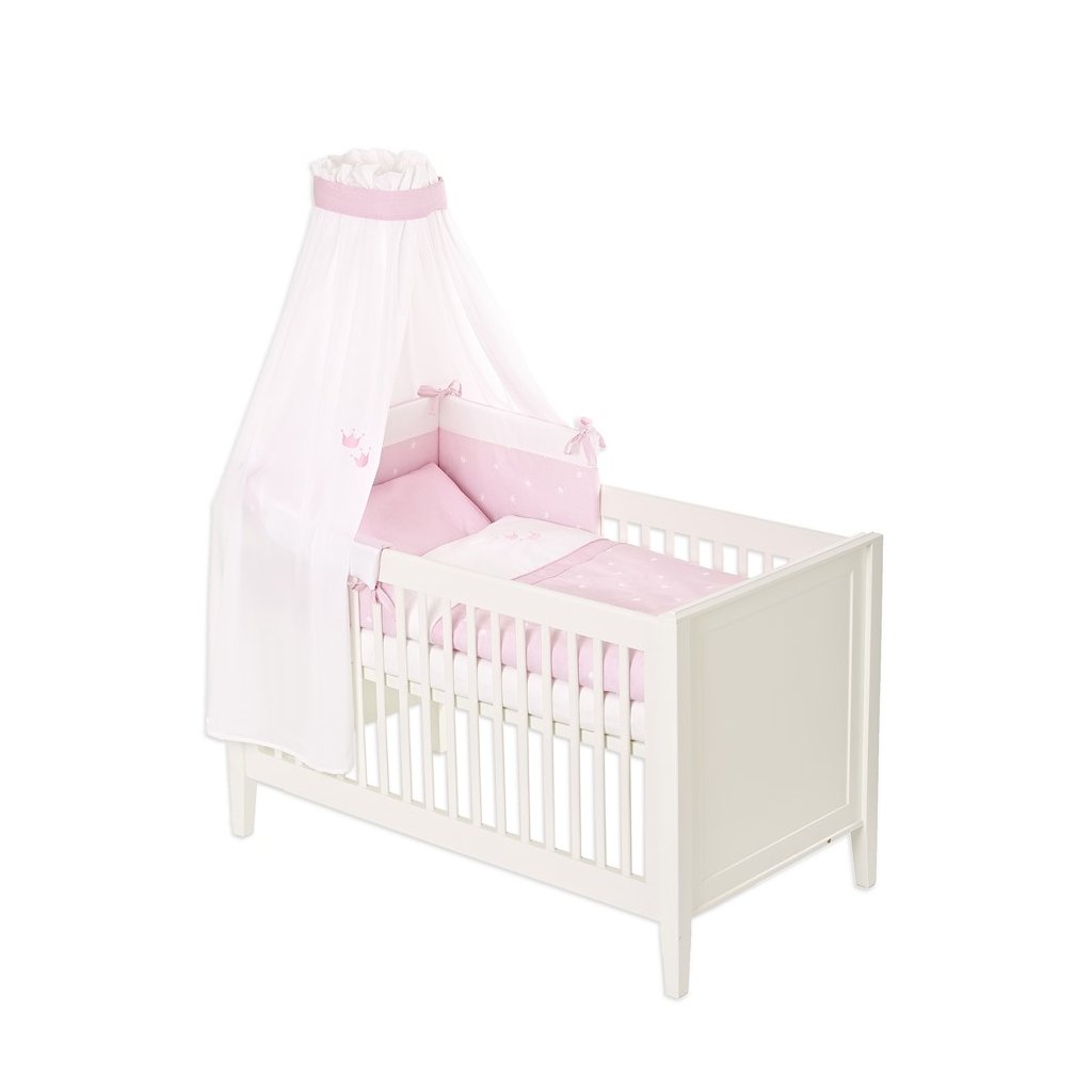 Sháníte pro své dítě kvalitní výbavu do dětské postýlky? Čtyřdílný set povlečení Krone Rosa od firmy Träumeland obsahuje povlak na přikrývku, povlak na polštář, ochranný mantinel a nebesa. Povlečení je přitom vyrobeno z měkké bavlny, která je příjemná na dotek a nedráždí ani citlivou dětskou pokožku. Má růžovou barvu s motivem královských korun.