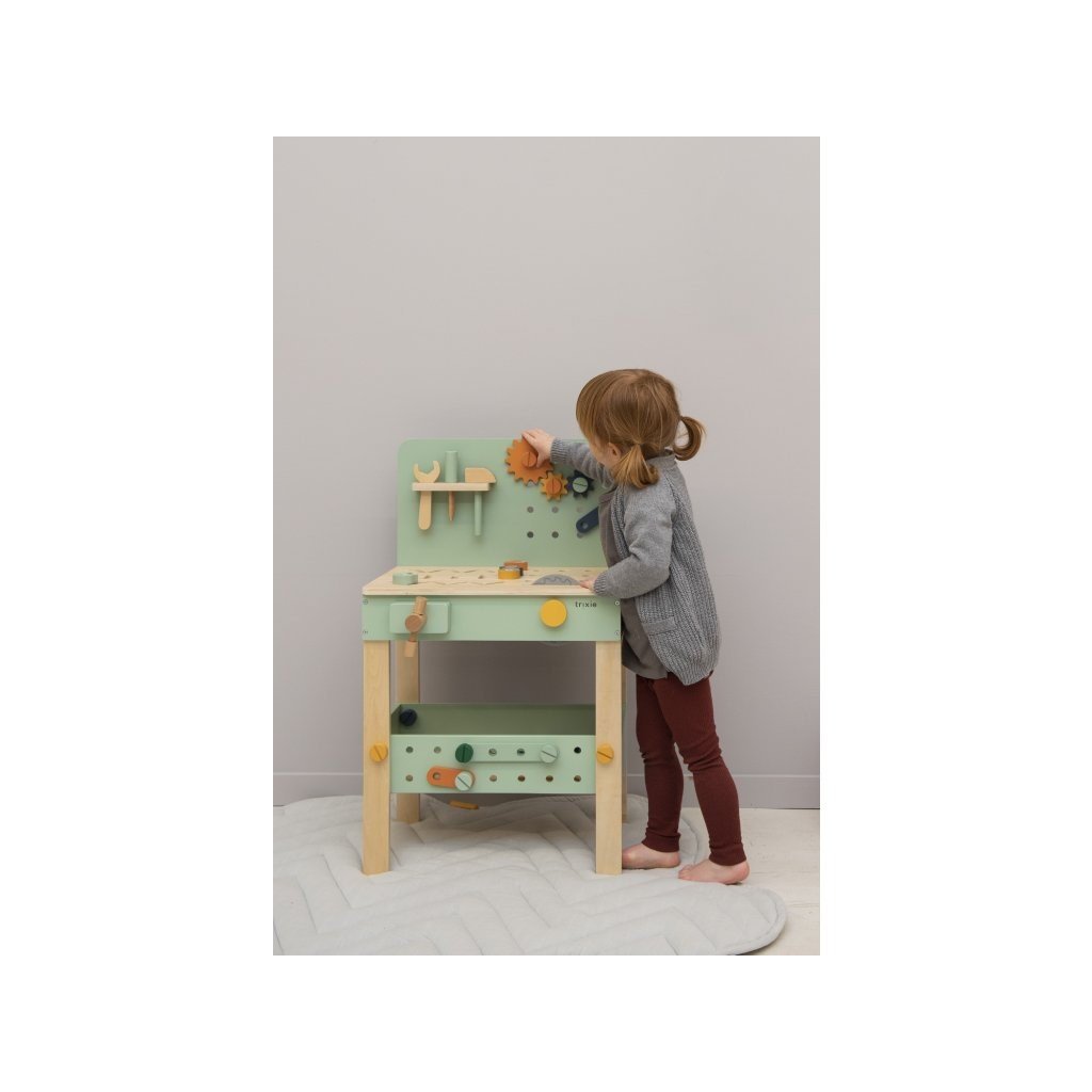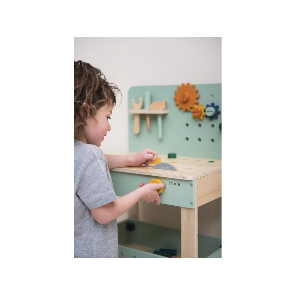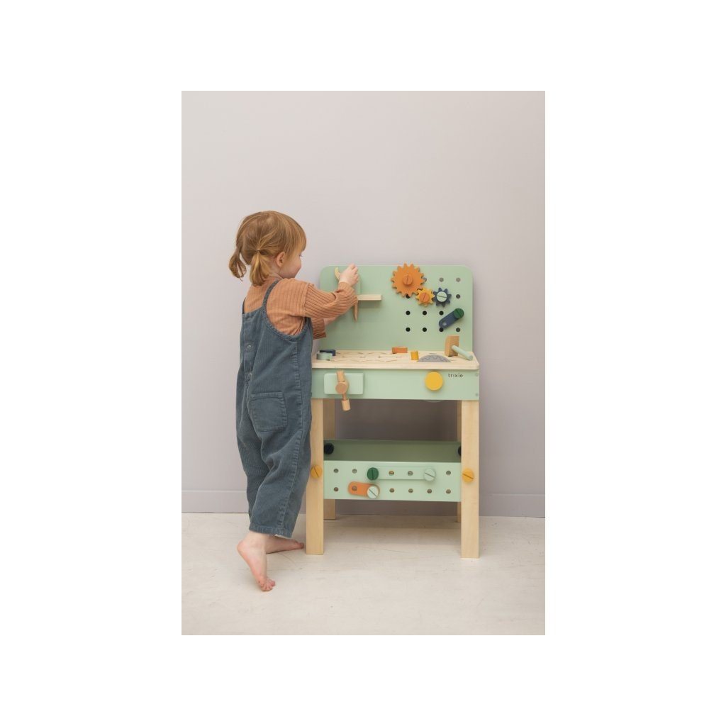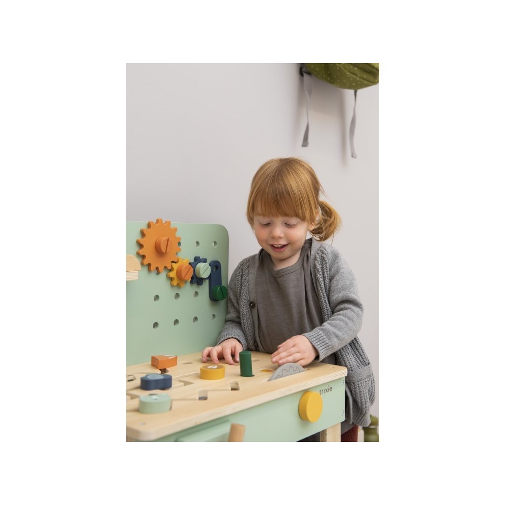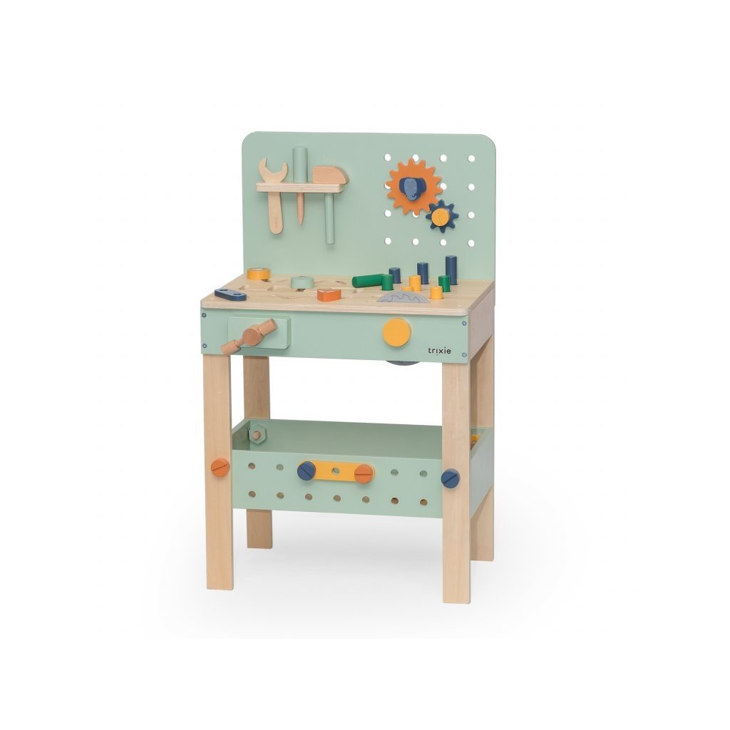 Kvalitní dřevěný pracovní ponk s nářadím. Práce s nářadím bude bavit kluky i holky. Stůl zároveň obsahuje spoustu dalších zajímavých herních prvků. Krásné barvy se hodí do každého interiéru.
