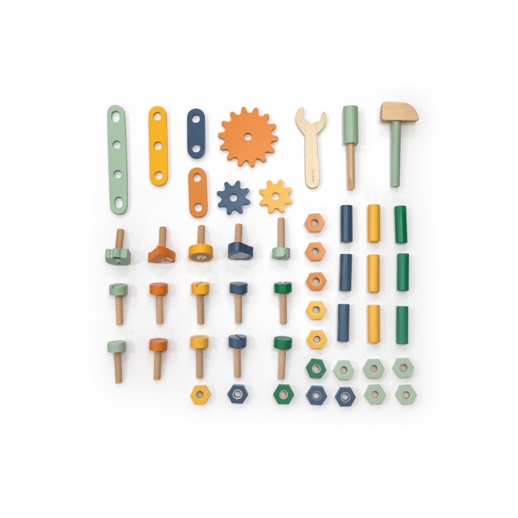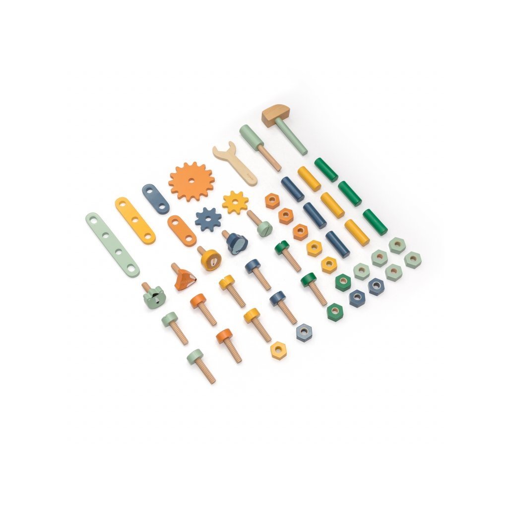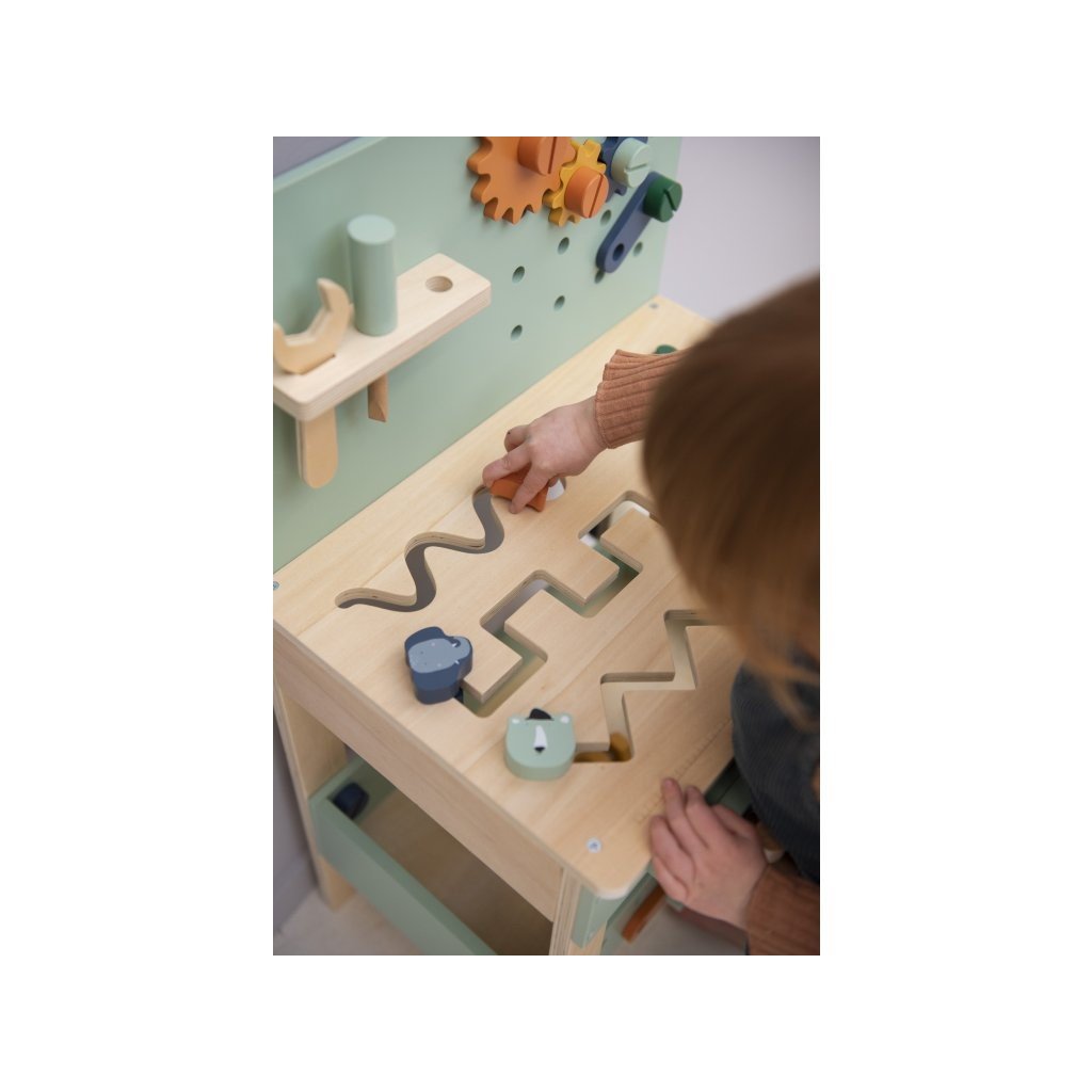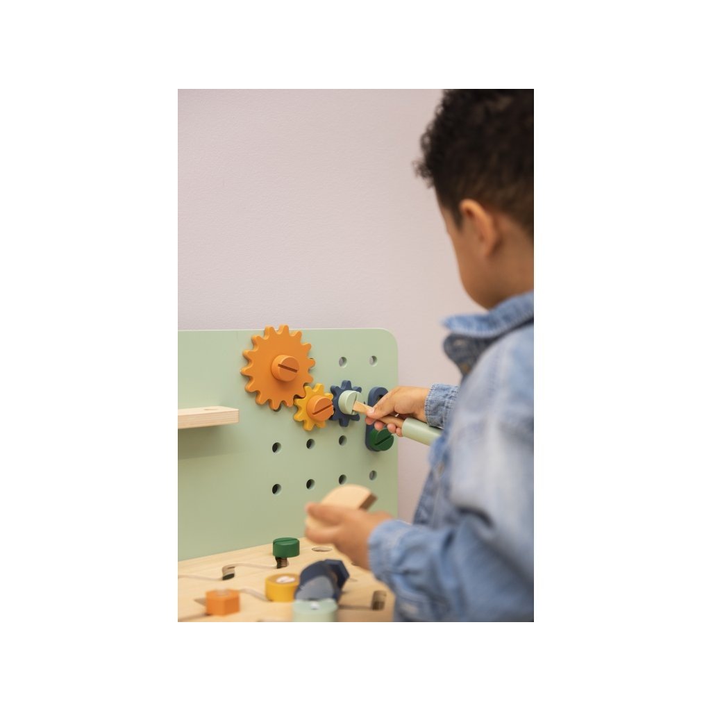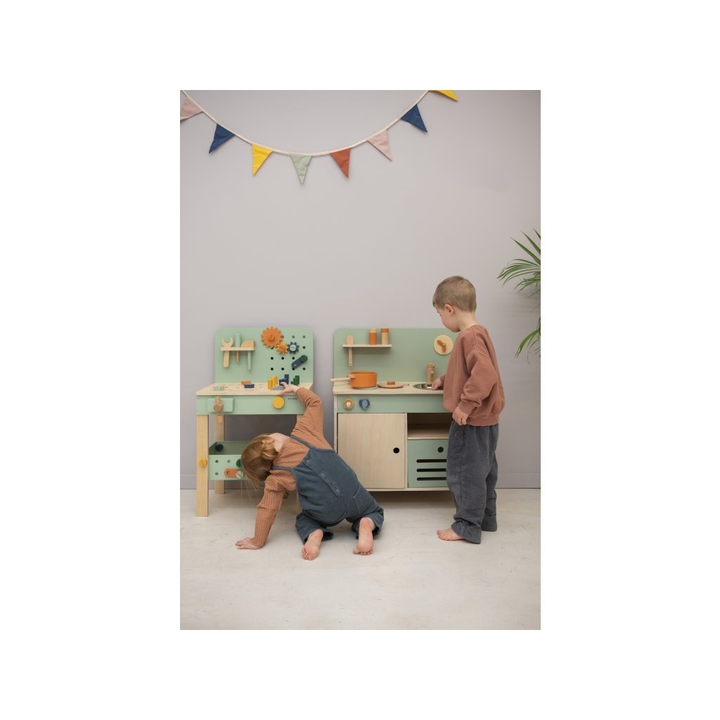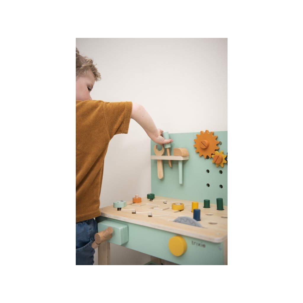 Kvalitní dřevěný pracovní ponk s nářadím. Práce s nářadím bude bavit kluky i holky. Stůl zároveň obsahuje spoustu dalších zajímavých herních prvků. Krásné barvy se hodí do každého interiéru.