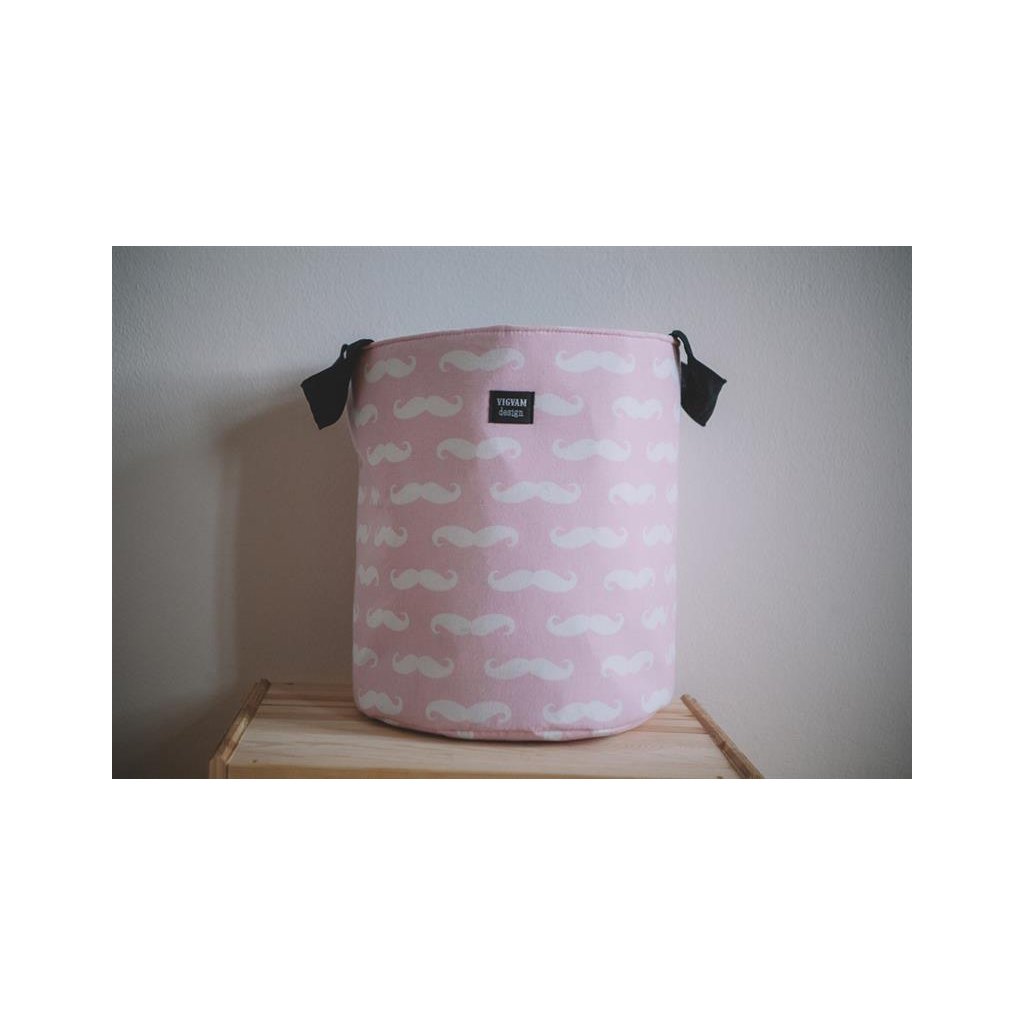 Koš na hračky a jiné důležité věci s knírky na růžovém podkladu. Vnitřek koše je, stejně jako obě uši v černé barvě.
