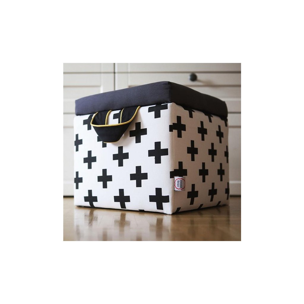 Taburet potažený látkou ve skandinávském stylu s černými plusy, víko je černé. Ucha taburetu jsou černá se žlutým lemem a slouží pro snadné odklopení víka.