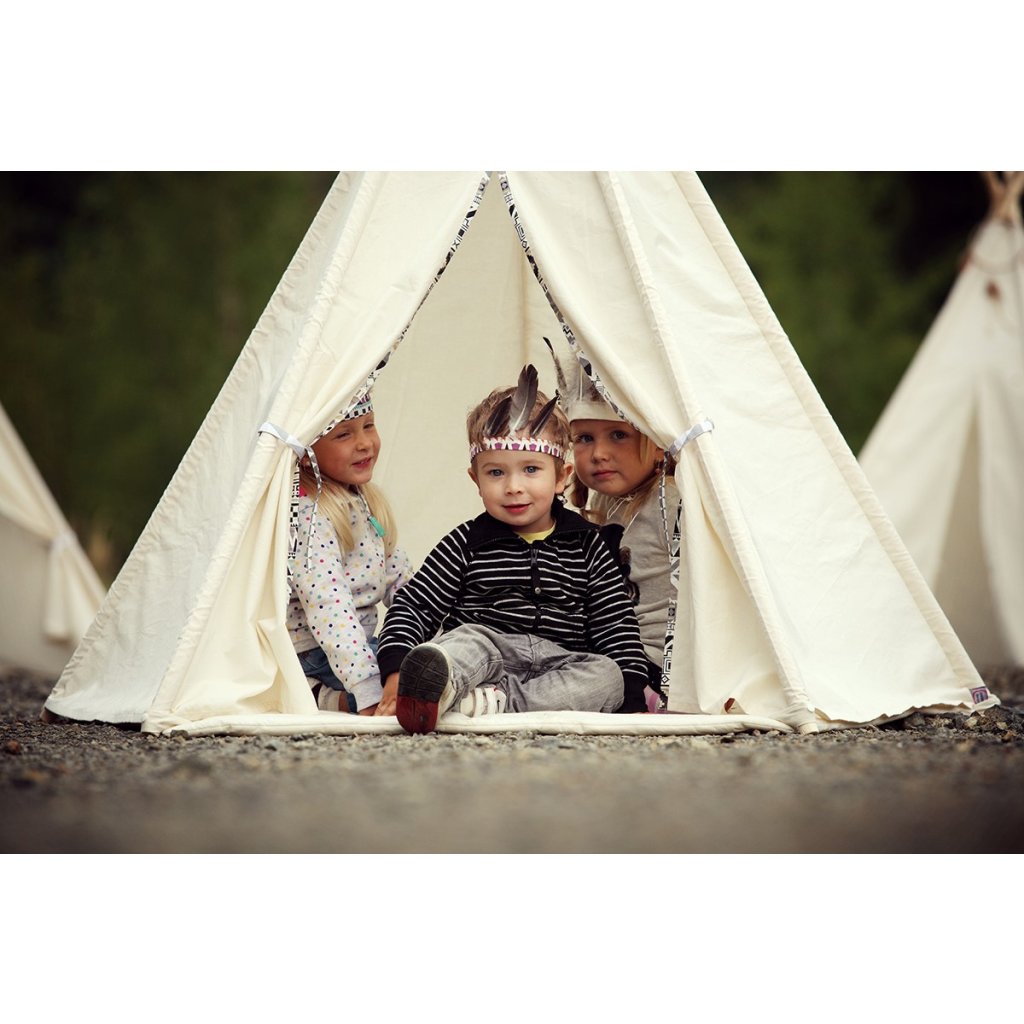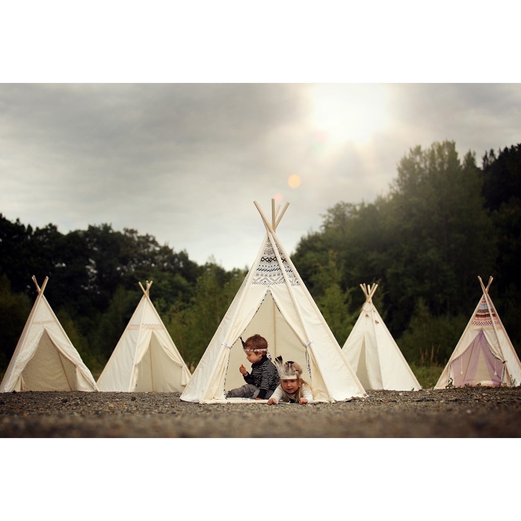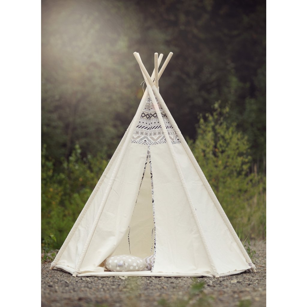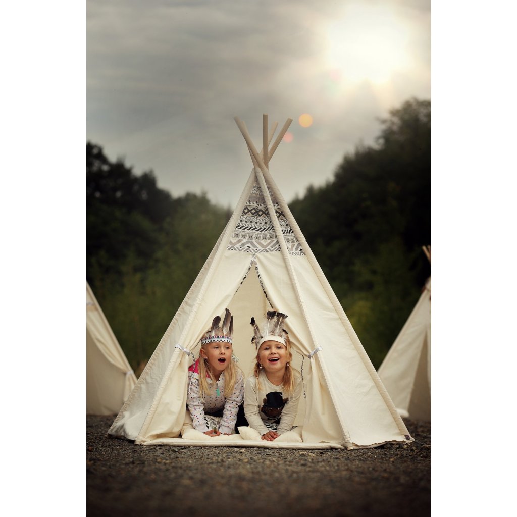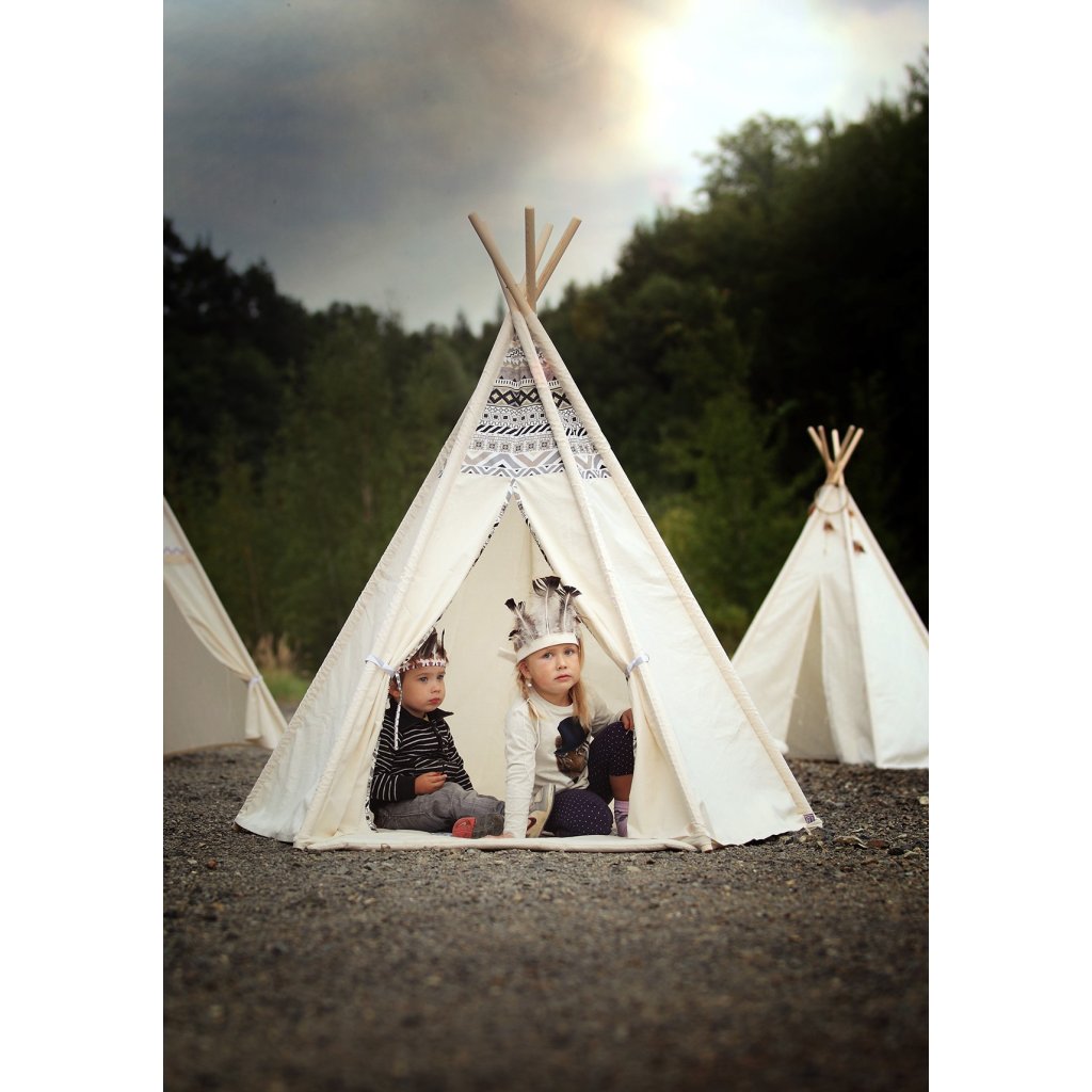 Konečně opravdické indiánské teepee v nature béžové barvě s indiánským vzorem ve špici. Stejný vzor se opakuje také uprostřed podlážky a na polštářcích. Jednoduché teepee v kombinaci béžové a dřeva se hodí do pokojíčku, obýváku a v létě i na zahradu. Teepee je vybaveno nenápadnými patenty, pomocí kterých snadno otevřete vchod a především jimi upevníte podlážku k všitým lištám stanu, tak aby ho Vaši malí indiáni ani při nejdivočejší hře nemohli převrhnout.