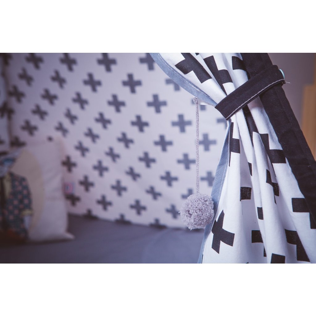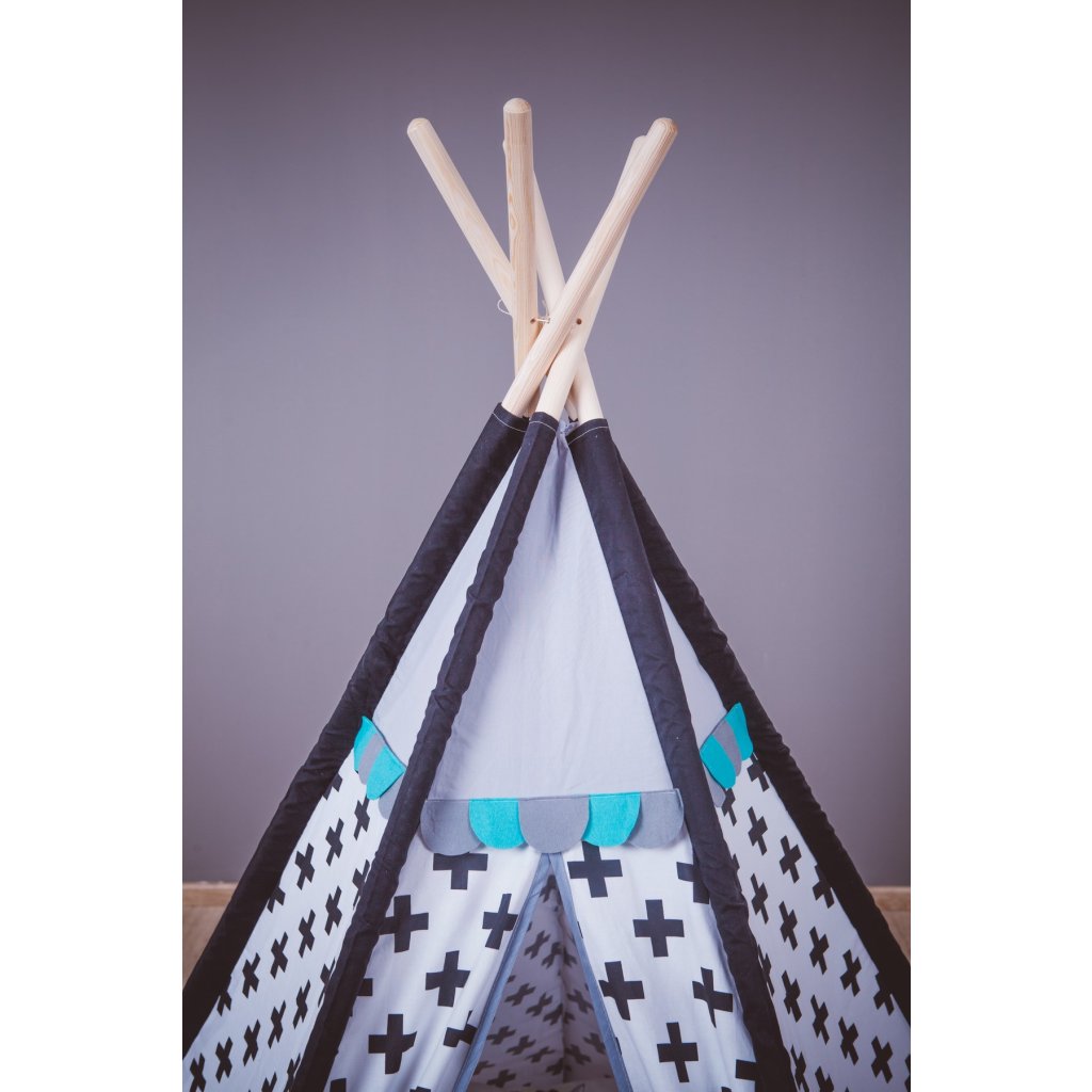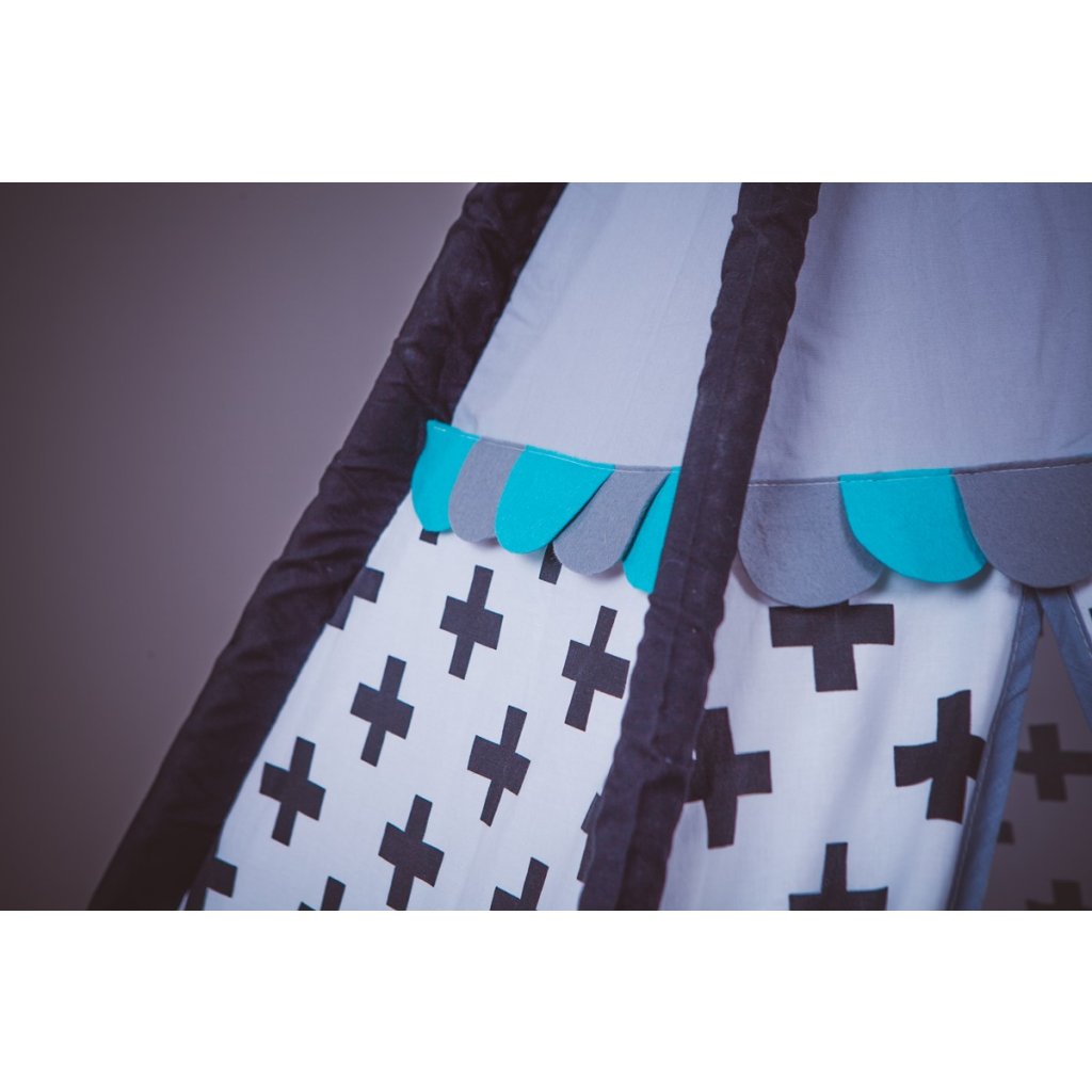Moderní teepee s výměnným obloučkovým lemem v tyrkysovo-šedém provedení, je vhodné nejen do klučičích pokojů, přizpůsobit ho pomocí odnímatelného barevného lemu můžeme také pro hočičky. Teepee má bílé stěny s černými plusy, šedou špičku a šedě lemovaný vchod, boční lišty jsou černé. Teepee doplňují také šňůrky na zavazování s velkými šedotyrkysovými bambulemi. Součástí je šedá podlážka s tyrkysovou spodní částí a černými uchy a dva polštářky (černý s bílými mraky a bílý s černými plus a tyrkysovým lemem). Teepee je vybaveno nenápadnými patenty, pomocí kterých snadno otevřete vchod a především jimi upevníte podlážku k všitým lištám stanu, tak aby ho Vaši malí indiáni ani při nejdivočejší hře nemohli převrhnout.