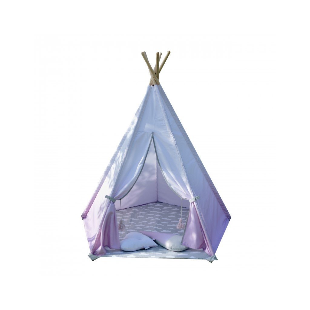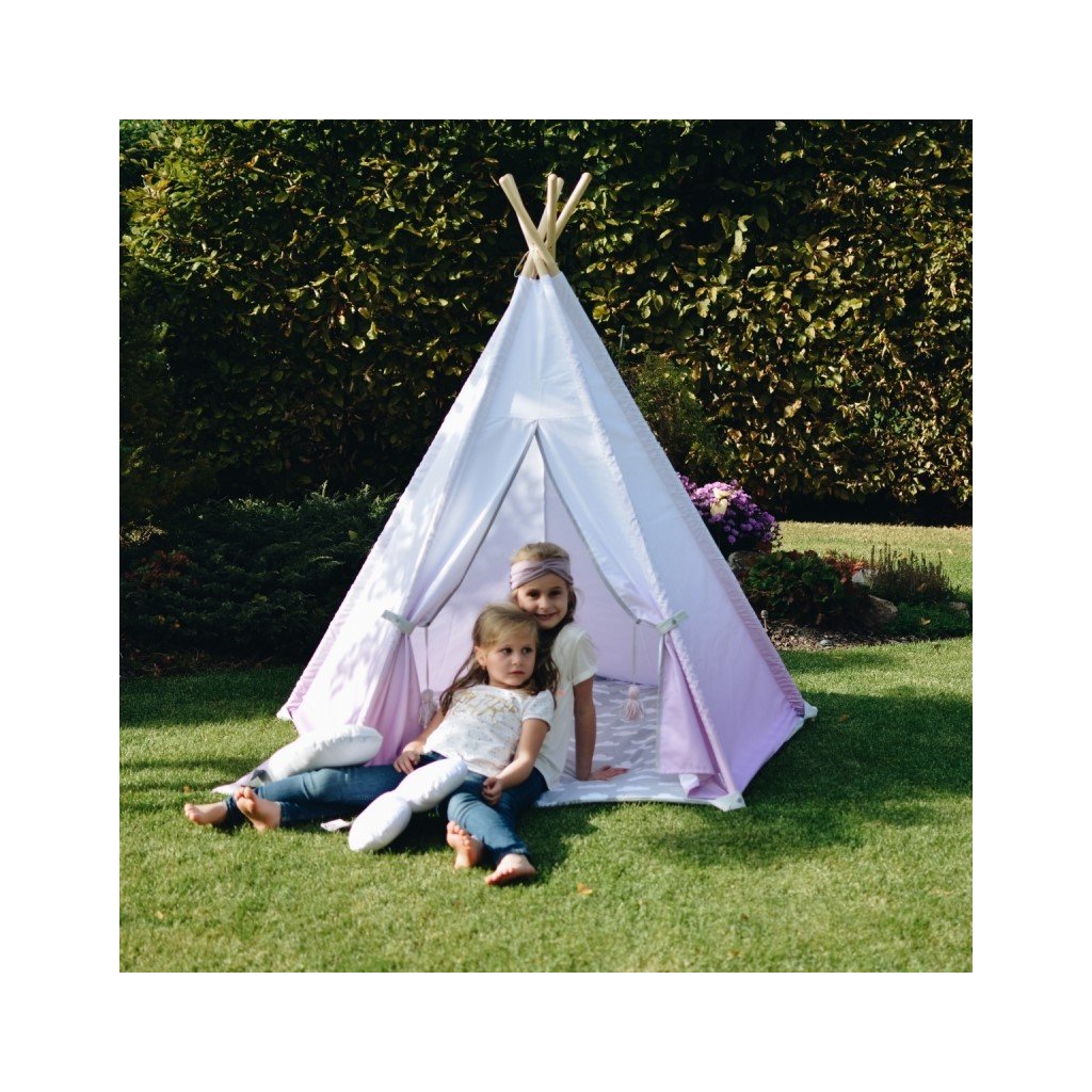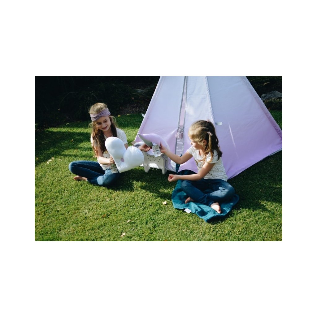 Teepee, které se neudělá ostudu žádnému obývacímu pokoji či pokojíčku. Módní přechod barev z růžové přes světlounce růžovou až do čistě bílé doplňuje šedobílá podlážka s obláčky. V ceně stanu jsou zahrnuty dva polštářky: jeden ve tvaru srdce s růžovým knoflíkem, druhý polštář je velký v podobě zmrzliny s bílým kopečkem a ombré růžovým kornoutkem. Výborně se hodí do moderních, jednoduše zařízených interiérů. Teepee je vybaveno nenápadnými patenty, pomocí kterých snadno otevřete vchod a především jimi upevníte podlážku k všitým lištám stanu, tak aby ho Vaši malí indiáni ani při nejdivočejší hře nemohli převrhnout.