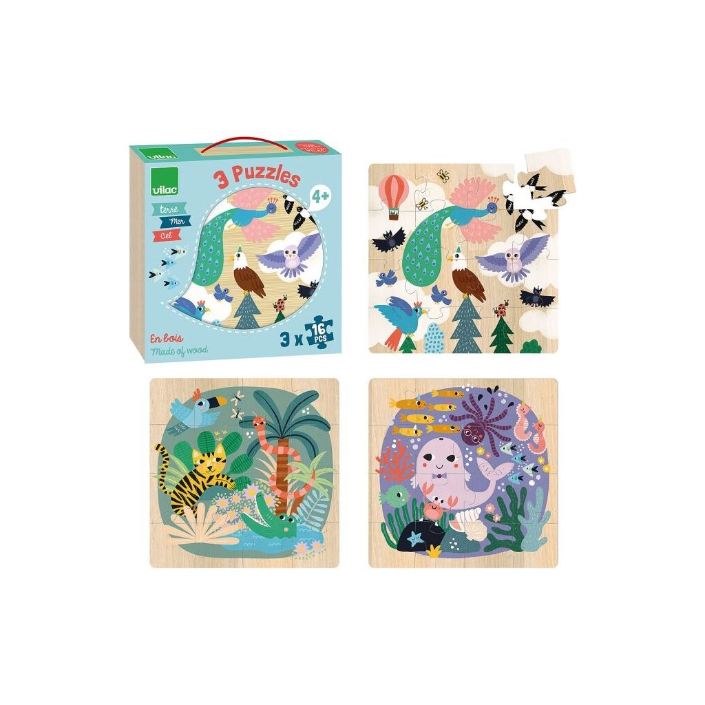 Sada 3 obrázkových puzzlí v praktické krabičce. Ilustrace Michelle Carlslund představují tři scény různých přírodních prostředí na souši, v moři a na obloze. Scéna v oblacích s velmi krásným pávem, orlem, sovou a dalšími různými ptáky. Další scéna ve vlnách s velkou velrybou, chobotnicí, mořskými koňmi a jejich přáteli rybičkami. Konečně poslední v džungli s tygrem, který se baví s krokodýlem, hadem a papouškem. Puzzle podpoří učení obratnosti a pozorování.