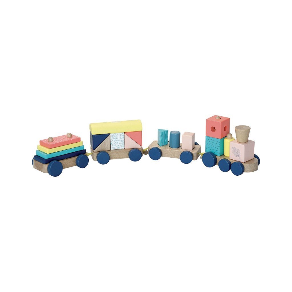 Barevný dřevěný vláček. Skládá se z 22 kostek.