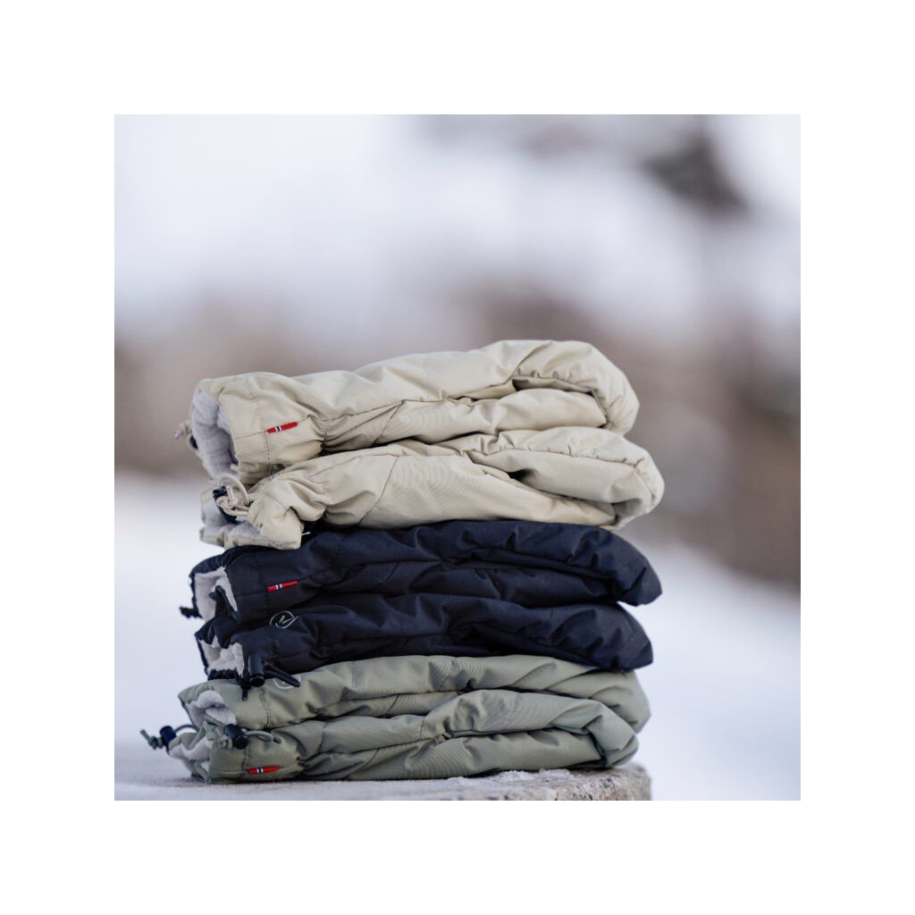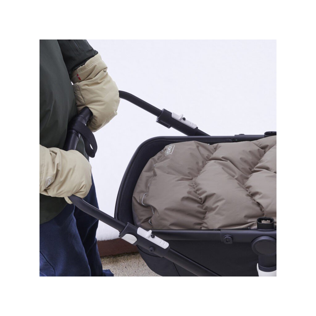Palčáky zůstávají uchycené na madle kočárku pomocí suchého zipu. Jsou vyrobeny z nejkvalitnějších přírodních materiálů. Vyplněné jsou prachovým peřím a poskytují jedinečnou izolaci proti chladu. Vzduch mezi vlákny prachového peří poskytuje maximální izolaci a udržuje ruce v teple. Větru odolná vnější tkanina má vodní sloupec minimálně 8000 mm a je opatřena voděodpudivou vrstvou BIONIC-FINISH®ECO. Rukavice lze použít univerzálně na různé typy kočárků. Šňůrka na straně umožňuje rukavice stáhnout tak, aby obepnuly zápěstí a nedostala se do nich zima.