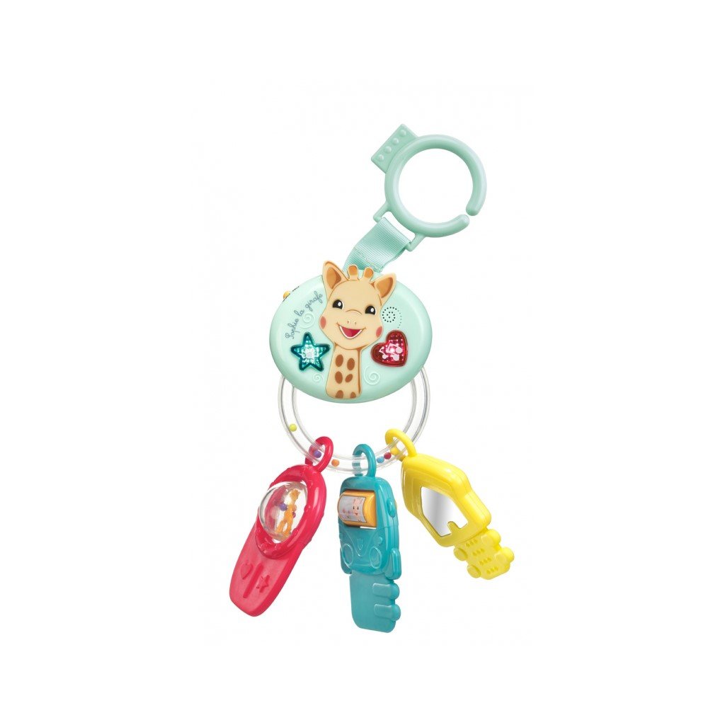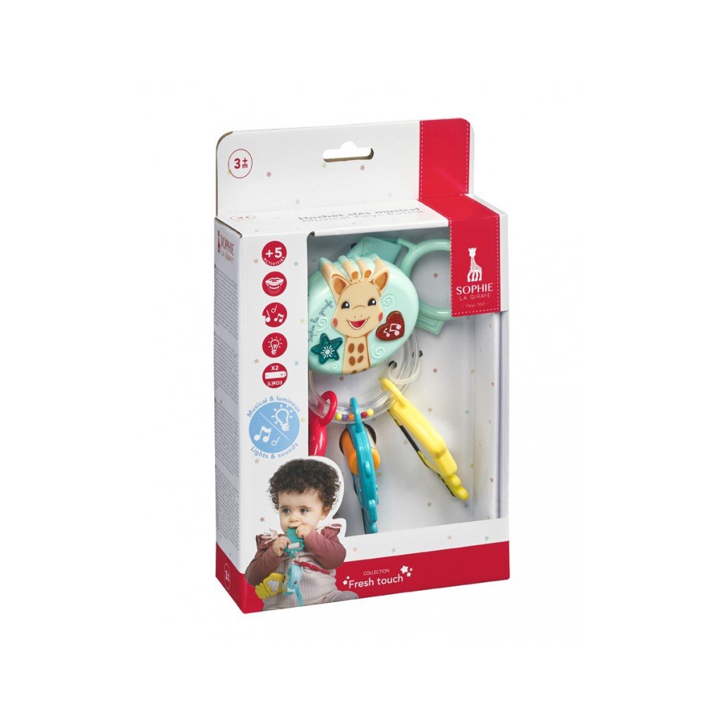 Hudební chrasticí klíčky s obrázkem žirafy Sophie a s mnoha aktivitami, které stimulují dětské smysly! Chrastítko má 2 režimy zvuků. Elektronické chrastítko zahrnuje 2 tlačítka ke spuštění několika melodií a světelných efektů. Klasické chrastítko děťátko pohybem klíčků poslouchá jemné chrastění. Každý klíček je vyrobený z měkkého materiálu různých tvarů, které mění jeho pocity při jejich žvýkání a účinně masírují dětské dásně během bolestivého prořezávání prvních zoubků. Váleček k otáčení , bezpečné zrcátko a transparentní kulička s miniaturou žirafky Sophie uvnitř. Díky oblému tvaru je snadné hračku uchopit. Včetně dvou baterií typu AAA.