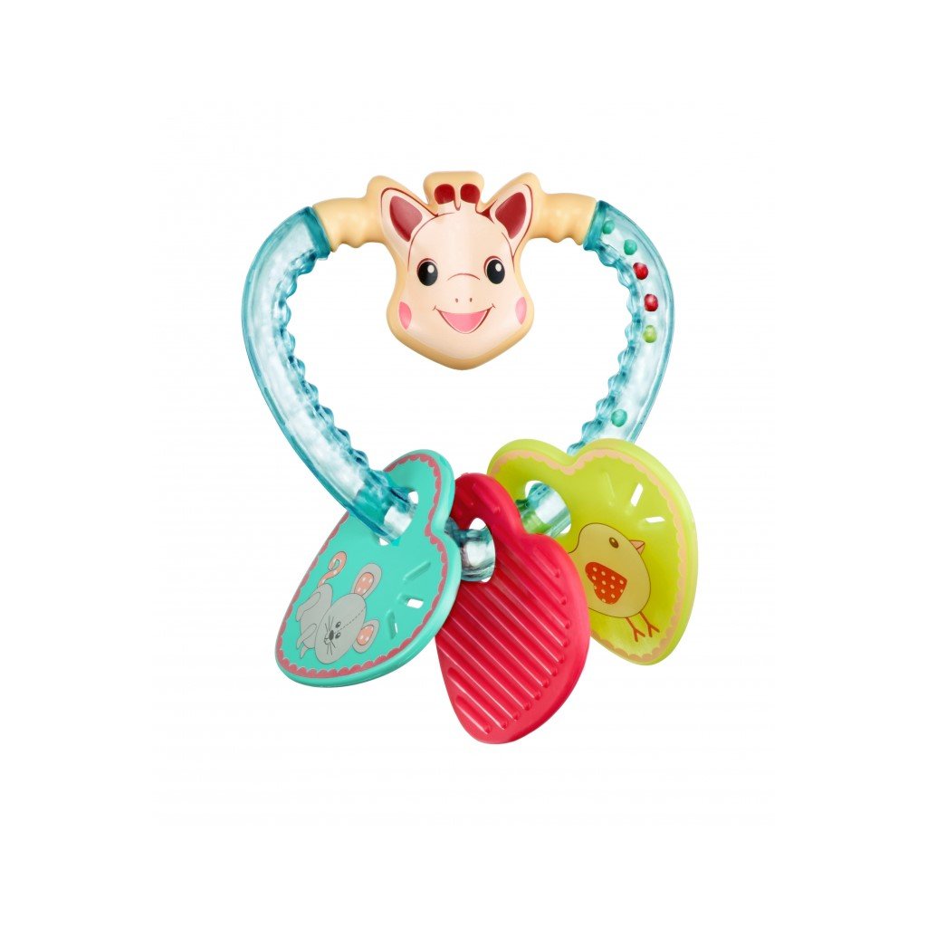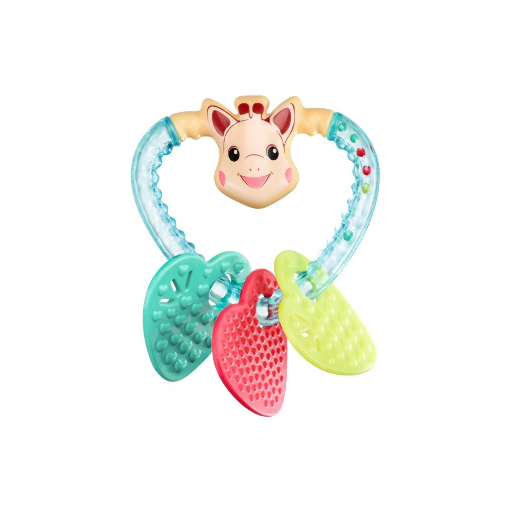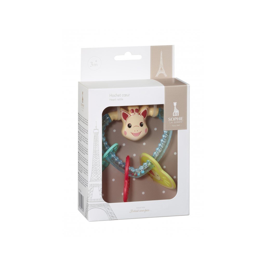 Chrastítko je lehké a navržené tak, aby jej snadno uchopily i malé dětské ruce. Na srdíčku jsou přívěšky s kamarády žirafy Sophie: s myškou Josephine, želvou Margot a ptáčkem Kiwi. V chrastítku jsou kuličky, které při pohybu vydávají zvuky. Jasné barvy pobízí dítě k objevování. Kroužek je vyroben z měkkého materiálu, který je ideální ke žvýkání a zmírnění bolesti dětských dásní při prořezávání zoubků.