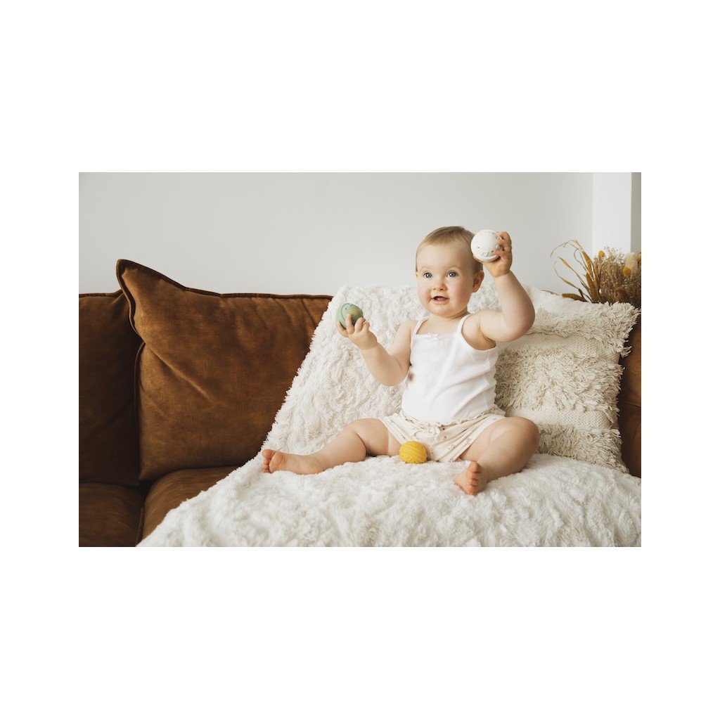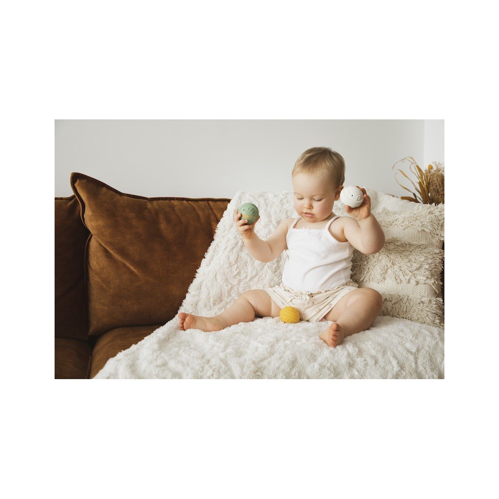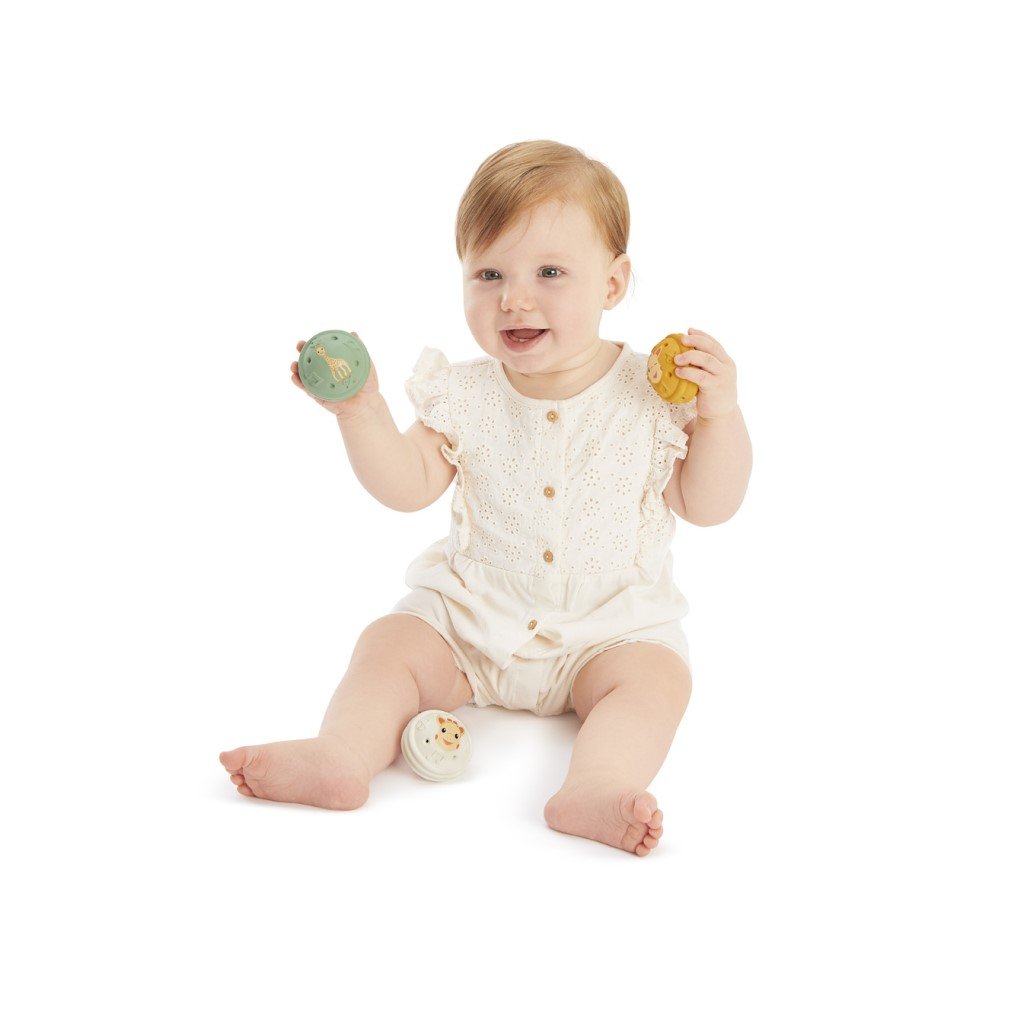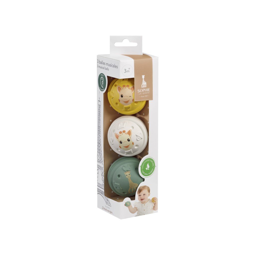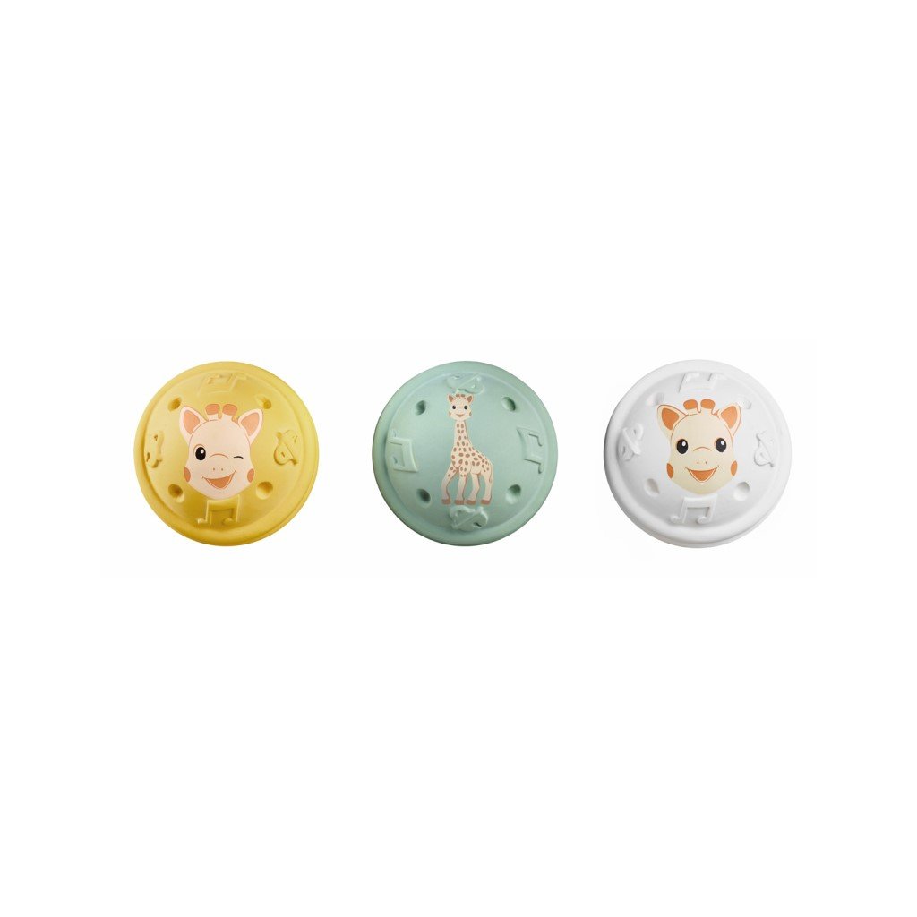 Tyto 3 míčky jsou vyrobeny ze 100% přírodního kaučuku, jsou lehké a snadno se s nimi manipuluje! K aktivaci 3 různých zvuků jsou nutné 3 akce. Při lehkém stisknutí zelené kuličky uslyší dítě jemný zvuk zmačkaného papíru, zatřesením bílé kuličky se ozve cinkání zvonečku a krátkým stisknutím žluté kuličky se ozve zvuk Sophiiny známé "básničky". Dítě rozvíjí svůj sluchový smysl a objevuje a učí se chápat pojem příčiny a následku. Vhodné pro děti od 3 měsíců.