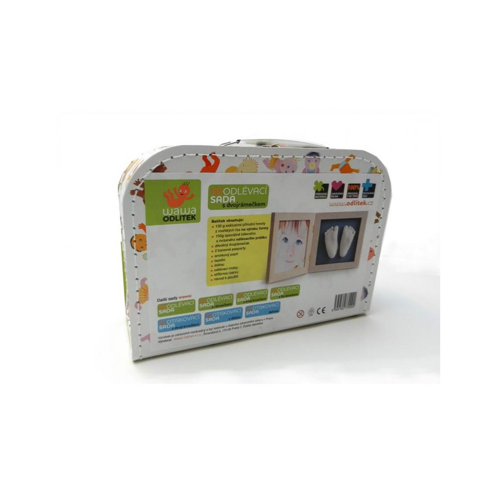 Vytvořte si originální dekoraci, která je jednak osobitým doplňkem do bytu, ale především věčnou vzpomínkou na první měsíce života Vašeho děťátka. Rámečkem s odlitky můžete také obdarovat rodinu miminka. Odlitek ručiček či nožiček je zasazen do dvojrámu, do kterého lze vložit fotografii dítěte. Součástí balení jsou dvě různobarevné pasparty. Odlévání je snadné, důležité instrukce najdete v návodu či ve videu pod tímto textem. Používané materiály jsou přírodní, hypoalergenní, pro dítě zcela nezávadné. Sada je navíc uložena v kufříku s hravým potiskem, který Vaše dítě může využít například jako úložný prostor pro hračky.