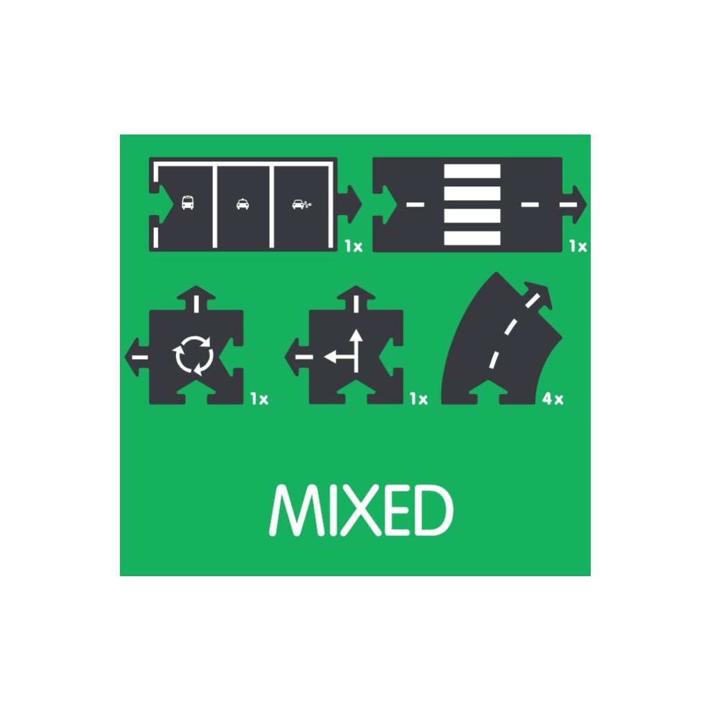 Sada obsahuje čtyři zatáčky, jednu křižovatku, jeden kruhový objezd, jeden přechod pro chodce a jedno parkoviště s ikonami. Rozšiřte svou dráhu o další části silnice pro ještě větší zábavu. Doporučený věk: 3+