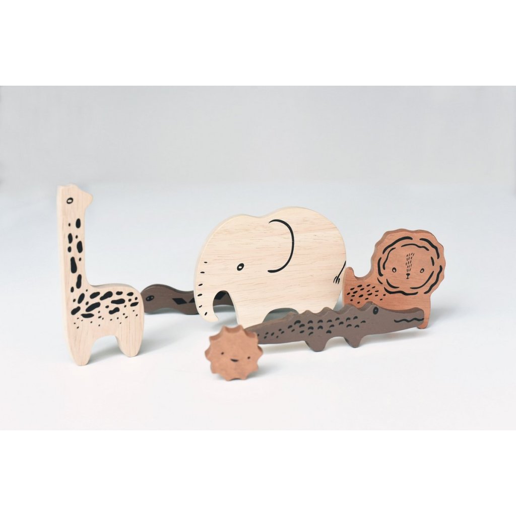 Tato krásná šestidílná dřevěná skládačka je ideální pro tolik druhů her! Vaše dítě může použít rozkošná dřevěná zvířata jako postavičky na hraní. Na zadní straně skládačky jsou zvířátka nakreslena. Vyrobeno z kaučukového dřeva udržitelného původu.