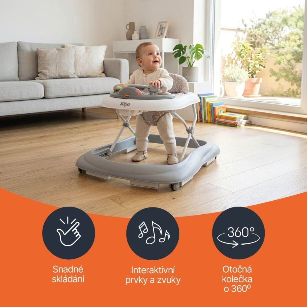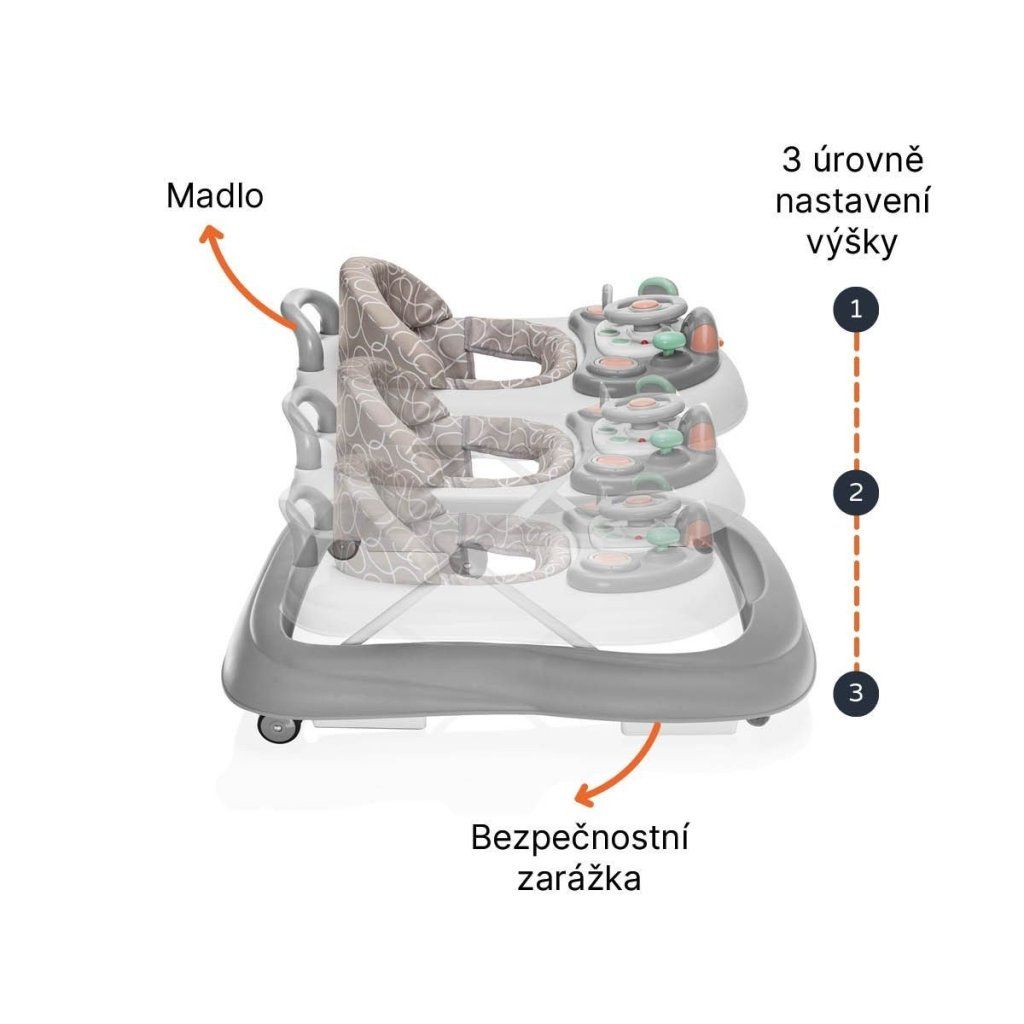 Tahle novinka svým designem posouvá chodítka na zcela novou úroveň. Není totiž jenom perfektní učící a zábavní pomůckou pro děti, ale i líbivým kouskem, který dobře zapadne do každého interiéru. Kombinace pastelových barev a matných plastů z něj vytváří produkt, který vzbuzuje příjemný dojem. Aby bylo použití chodítka Fiesta pro děti co nejpohodlnější, dá se u něj nastavit výška sedátka, a to do 3 poloh. Přičemž pro nácvik prvních krůčků je v zadní části chodítka Fiesta umístěna také hrazdička. O zábavu dítěte se pak postará odnímatelný interaktivní pultík, který kromě mechanických hraček disponuje i melodiemi, zvuky auta a světýlky. Chodítko Fiesta tak pomáhá nejen s procvičováním chůze, ale dítě zábavným způsobem zaměstná a rozvíjí všechny jeho smysly, včetně jemné motoriky. Velmi důležitým parametrem chodítka je také jeho bezpečnost. Chodítko Fiesta je proto vyrobeno z velmi kvalitního plastu a je vybaveno brzdícími bloky na základně pro předcházení nechtěného pádu ze schodů. O tuto užitečnou pomůcku se tak s klidem mohou opřít nejen děti, ale i jejich rodiče.