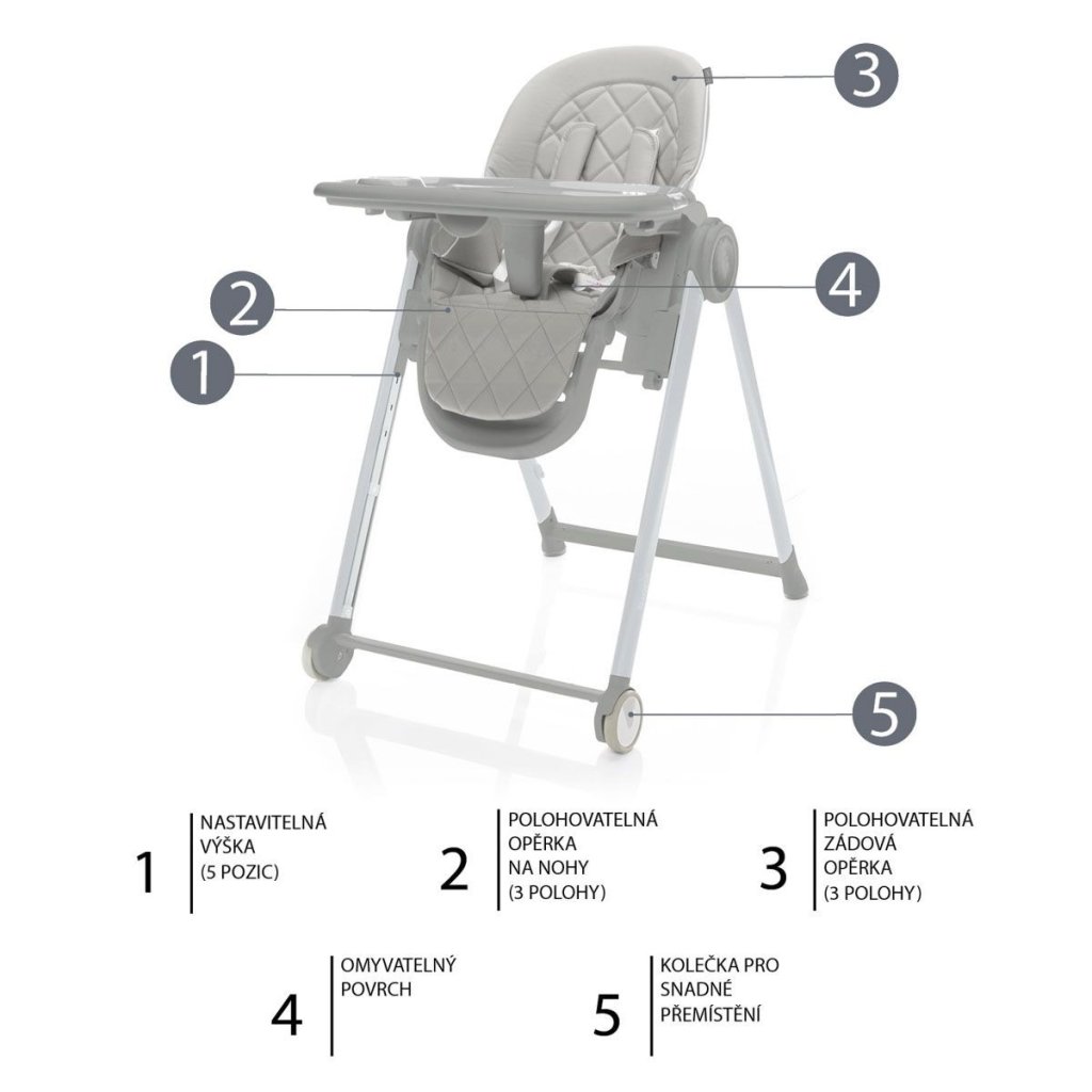 Židlička Space 2 má 5 úrovní nastavení výšky, což dovoluje přizpůsobit se téměř každému stolu a užít si tak společné rodinné stolování. Opěrku zad lze nastavit do 3 poloh, stejně tak i opěrku na nožičky. Díky tomu je možné židličku využít nejenom na krmení, ale také na odpočinek či jako bezpečné místo na hraní.