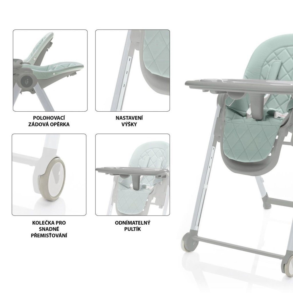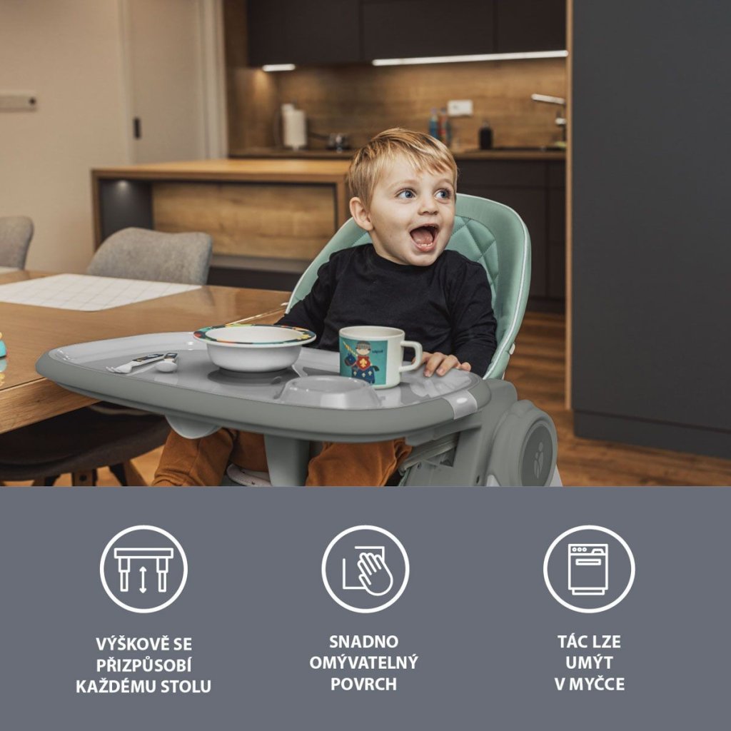 Komfortní jídelní židlička Space 2 s možností polohování výšky, zádové opěrky i opěrky na nohy. Vhodné pro děti od 6 do 36 měsíců. Minimalistický design, který hravě zapadne do jakéhokoliv interiéru, osvědčené funkční vlastnosti a pohodlí při sezení – to je jídelní židlička Space 2. Židlička disponuje odnímatelným pultíkem, jehož součástí je i jídelní podnos s držákem na pití. V případě, že pultík nebude potřeba, lehce jej sundáte a zavěsíte na zadní stranu židličky. Jídelní tác lze mýt v myčce nádobí. Pohodlné potahy snadno omyjete vlhkým hadříkem. V případě, že židličku nebudete používat, lze ji jednoduše složit. Ve složeném kompaktním stavu zabere minimum místa.