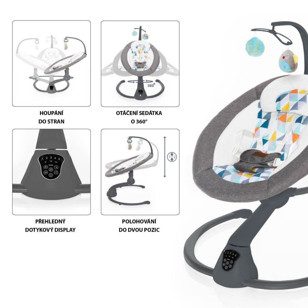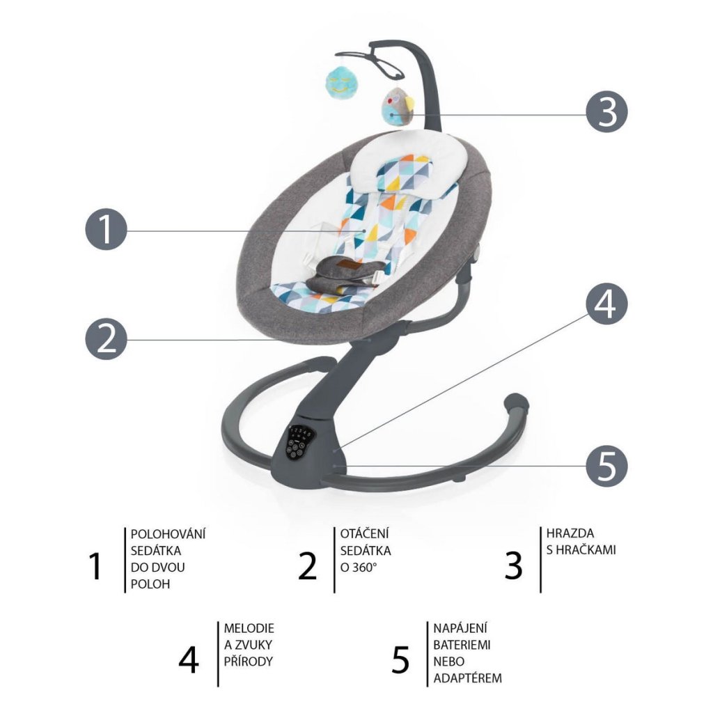 Unikátní konstrukce lehačky umožňuje otáčení o 360° a polohování sedátka do 2 poloh. Funkce houpání do stran připomíná pohyb kolébky, houpání dopředu/dozadu nahrazuje houpání v náručí. Lehačka disponuje 5 stupni intenzity houpání a automatickým zapnutím houpání při detekci pohybu dítěte. Samostatně lze také nastavit dobu houpání na 8, 15 či 30 minut.