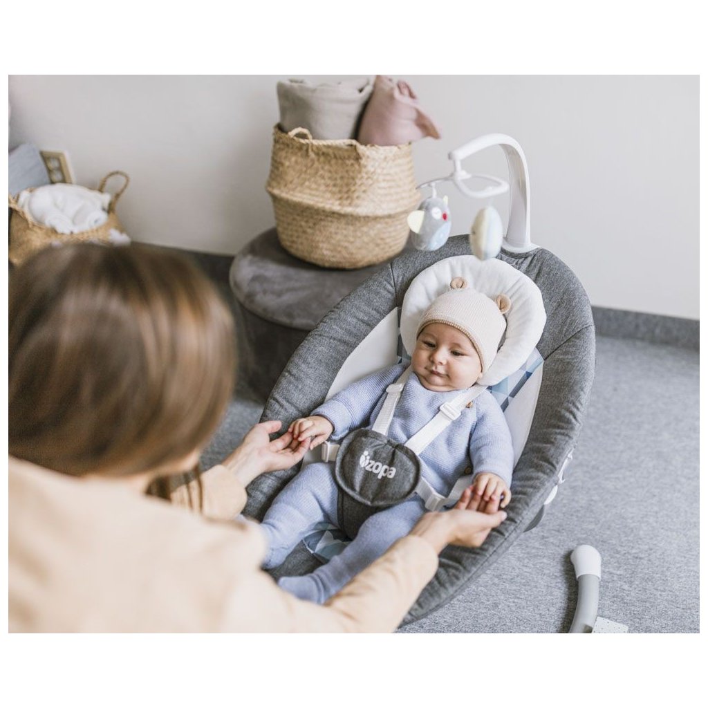 Bohatě polstrované sezení zajišťuje dokonalý komfort i při delším pobytu v lehačce. Součástí je polstrovaný 5bodový pás pro bezpečný odpočinek i hru. Lehačka je také vybavena hrazdou s 2 odnímatelnými plyšovými hračkami. Pro zklidnění a uspání jsou k dispozici melodie a zvuky přírody s možností nastavení hlasitosti.